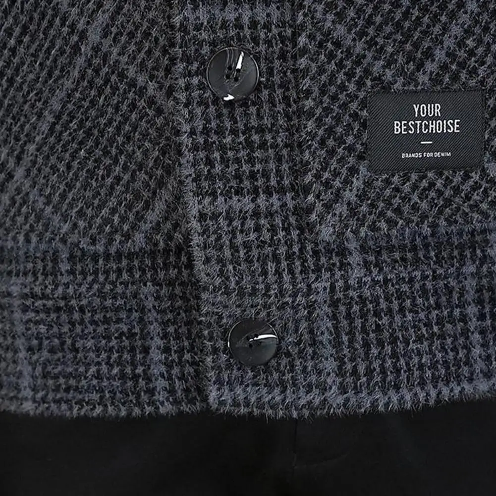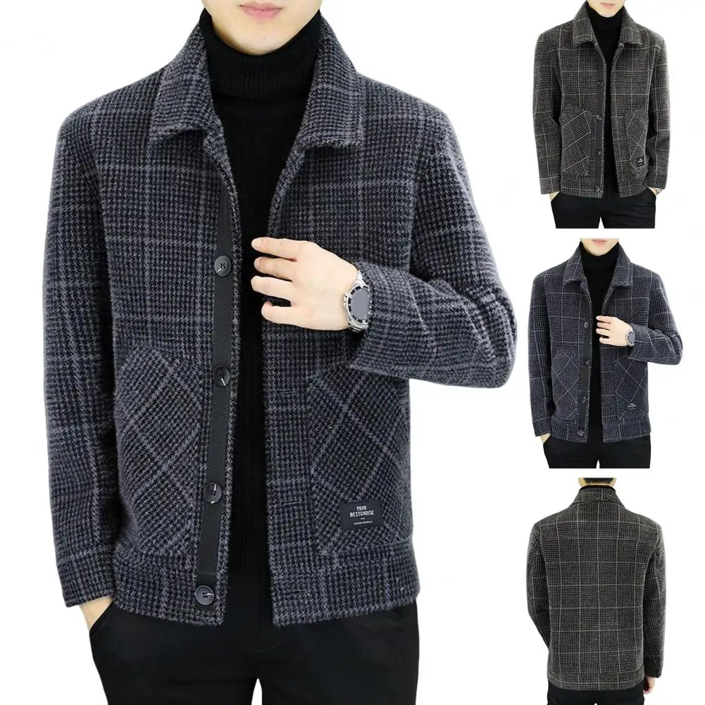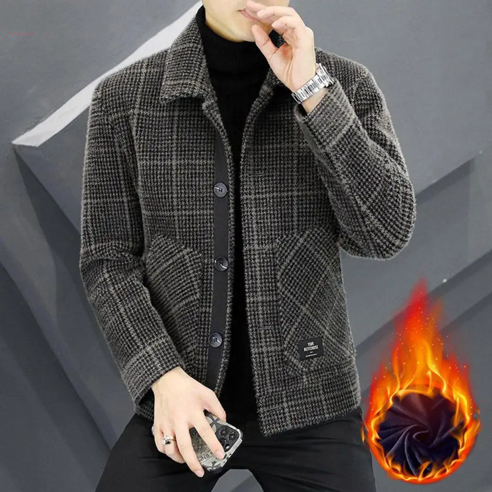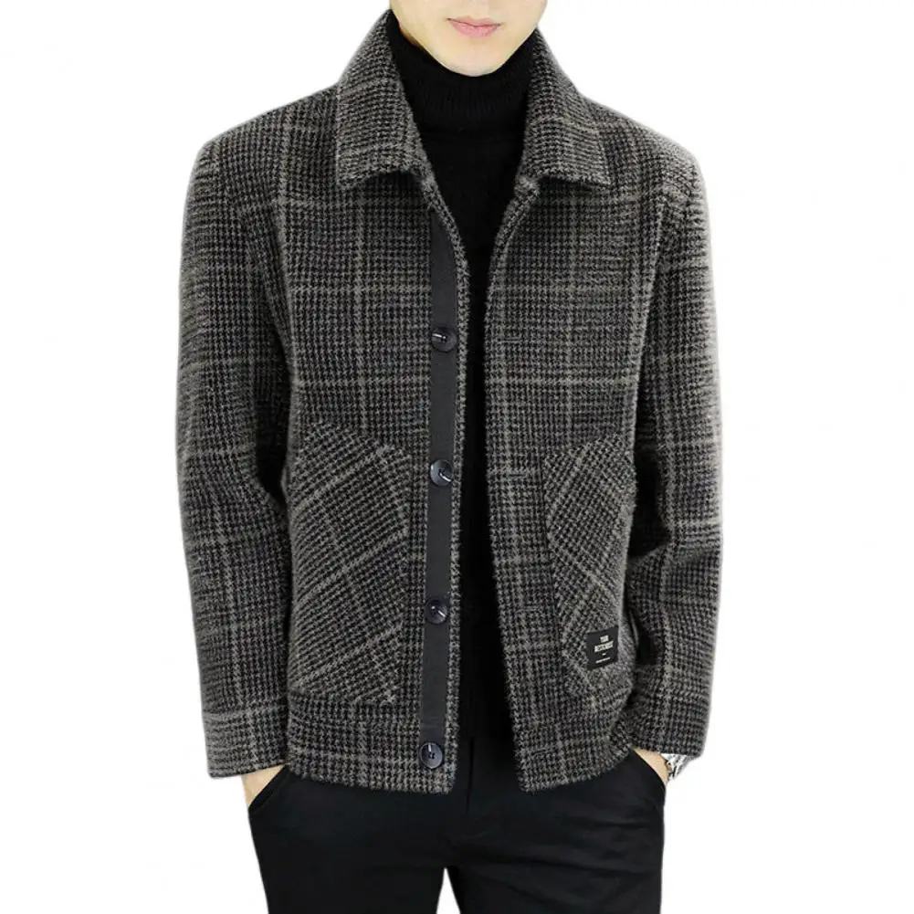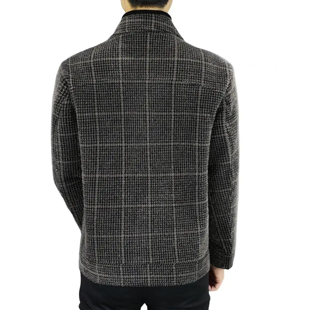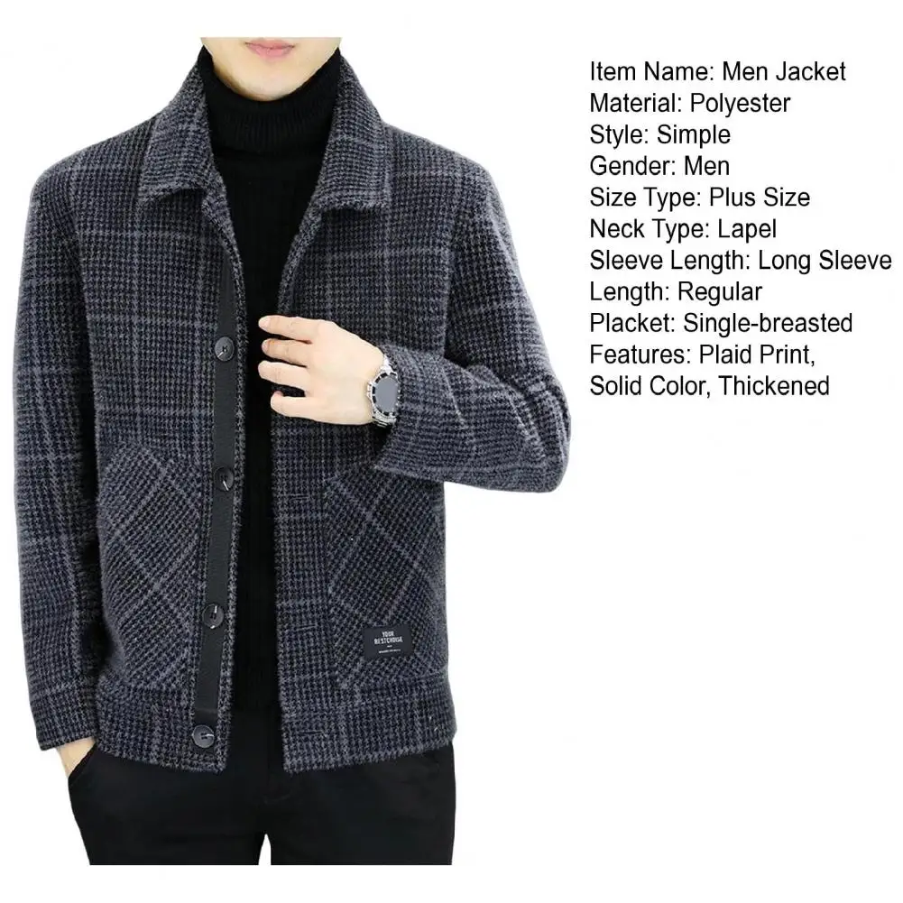 Men Jacket Lapel Long Sleeve Plaid Print Coat with Pockets Single-Breasted Closure Thickened Outwear