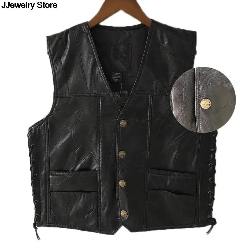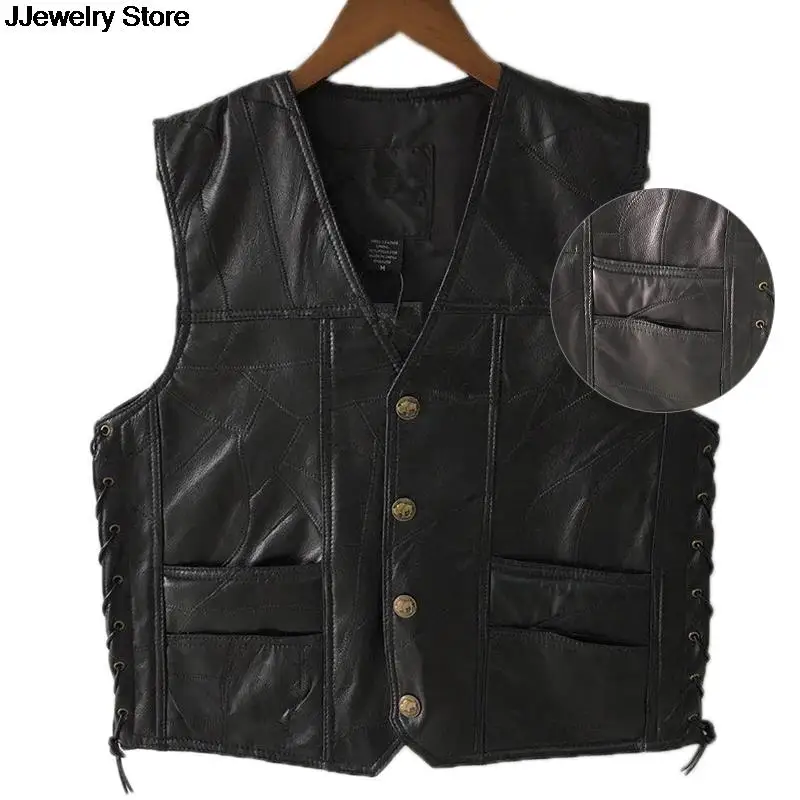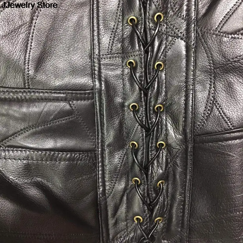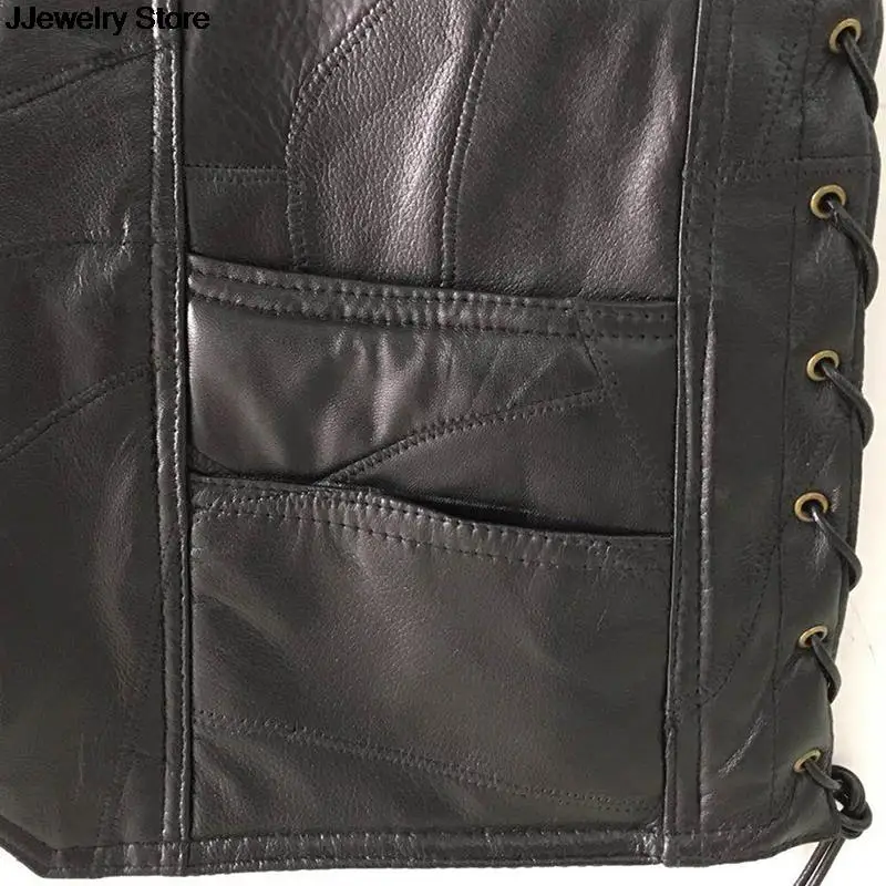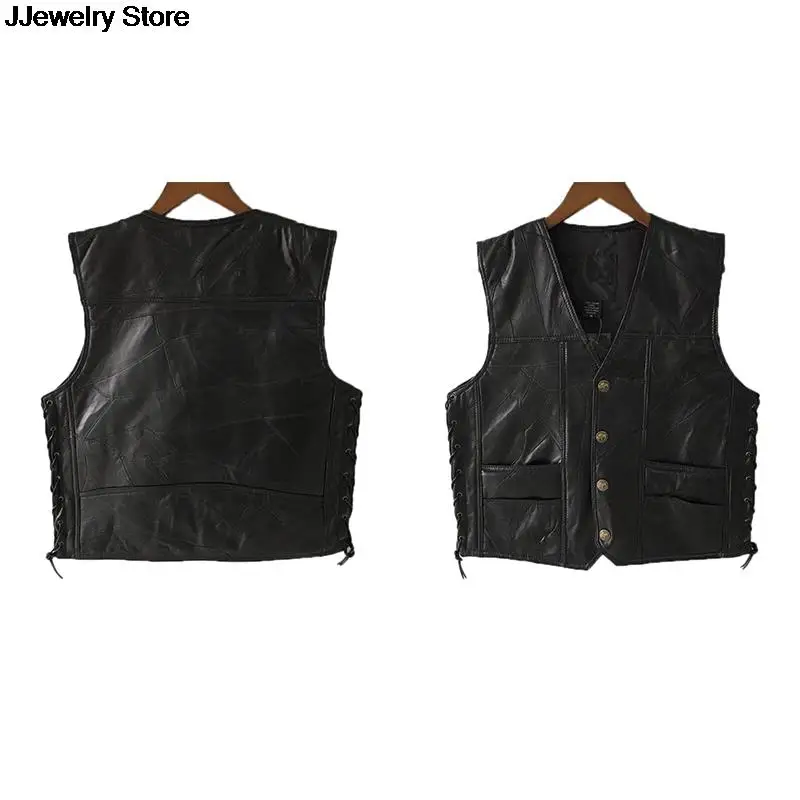 2025 Black Leather Motorcycle Vest For Men Genuine Leather Punk Biker Vest Lace Button Autumn Sleeveless Jacket For Men