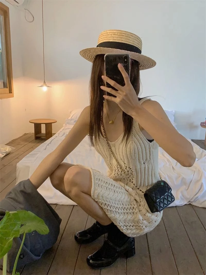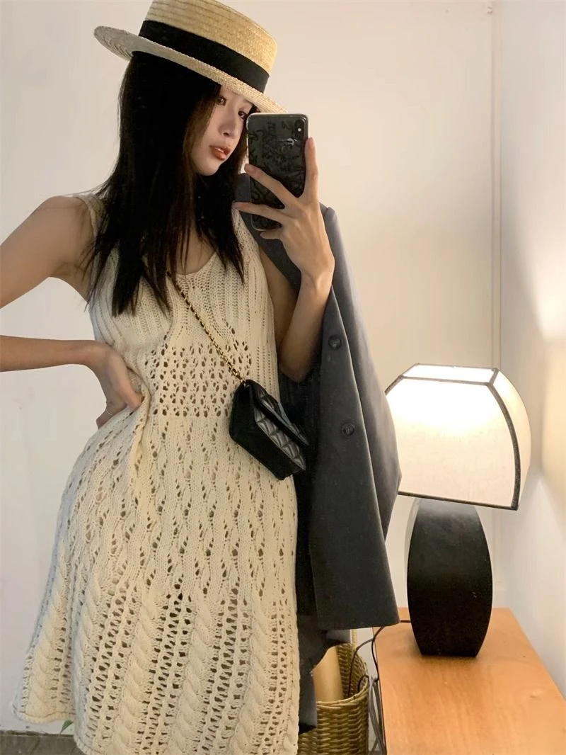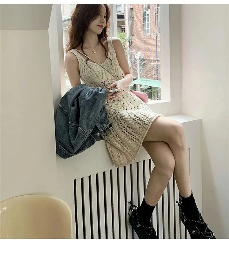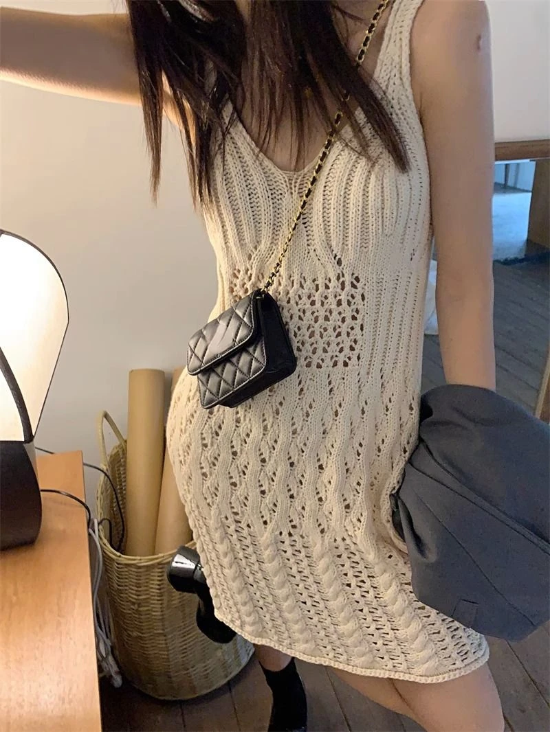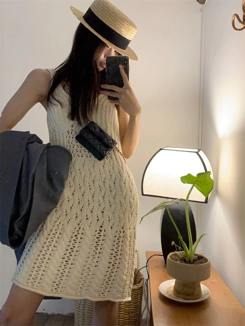 2025 Harajuku Sleeveless Knitted Dress Women Hollow Out Y2k Aesthetic Solid Dresses Sweet Streetwear Slim Waist Tunic Vestidos