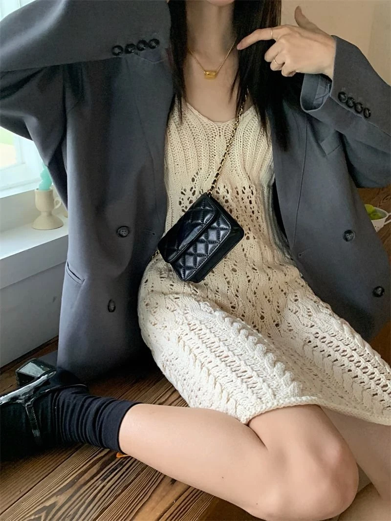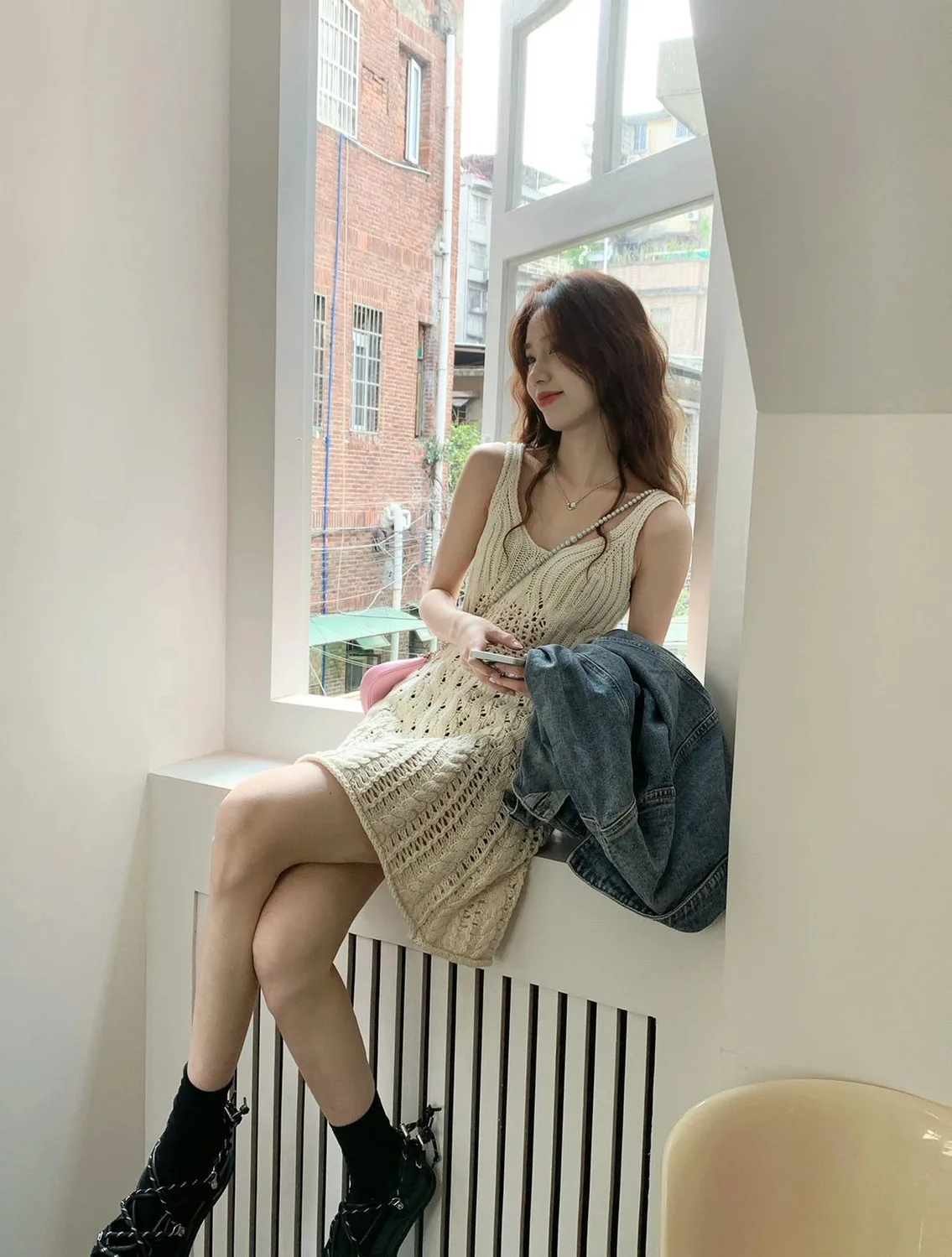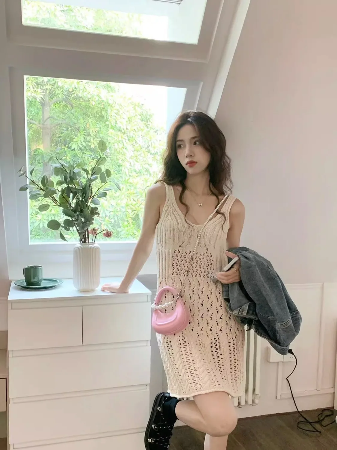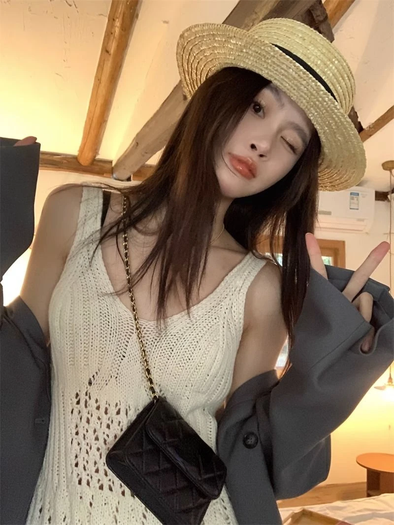 2025 Harajuku Sleeveless Knitted Dress Women Hollow Out Y2k Aesthetic Solid Dresses Sweet Streetwear Slim Waist Tunic Vestidos