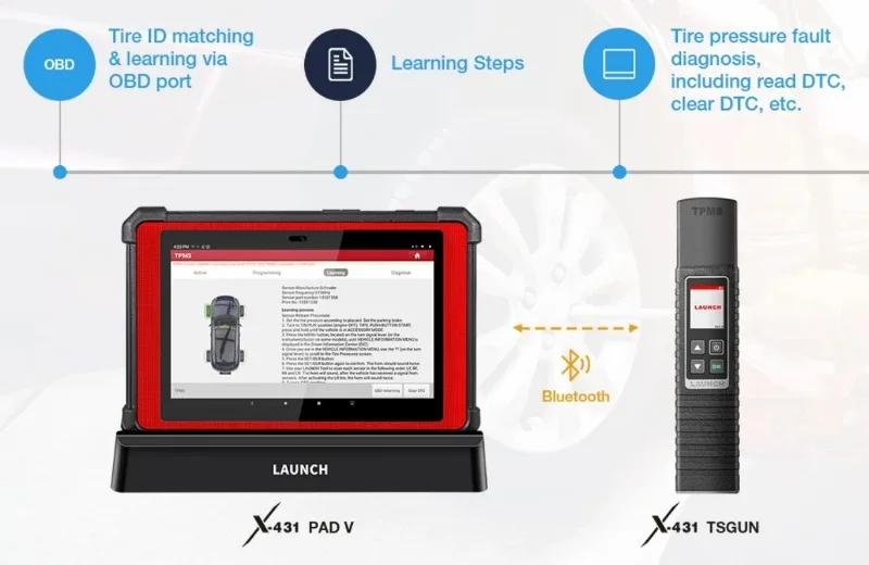 The X-431 TSGUN tire pressure gun is portable, powerful and easy to operate. It needs to work with LAUNCH intelligent diagnostic tool to perform the tire pressure activation, programming, diagnosis and learning functions.