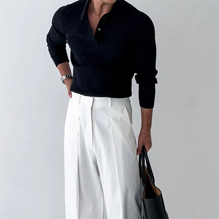 2025 Men’s Knitted Polo Shirts Fashion Striped Long-sleeved Lapel Pullover Tops Korean Style Solid Slim Versatile Knit Sweaters