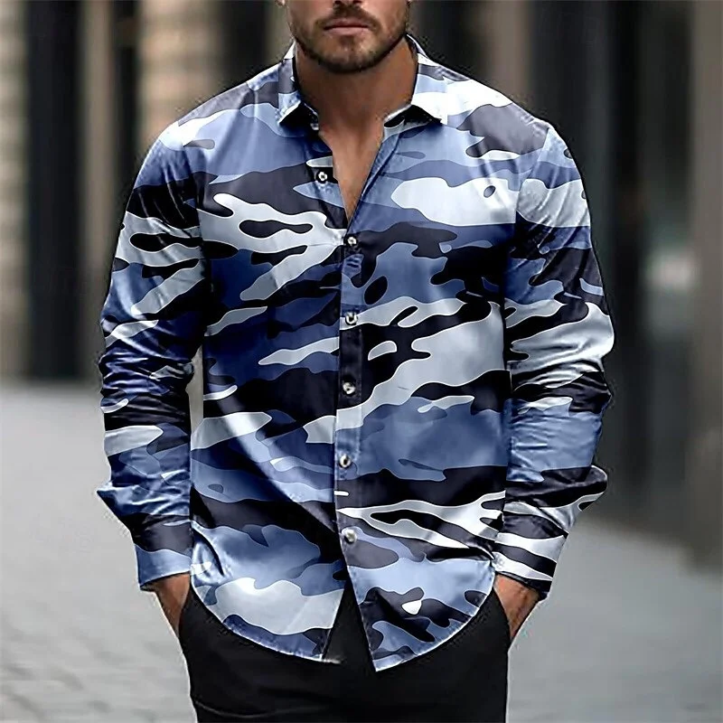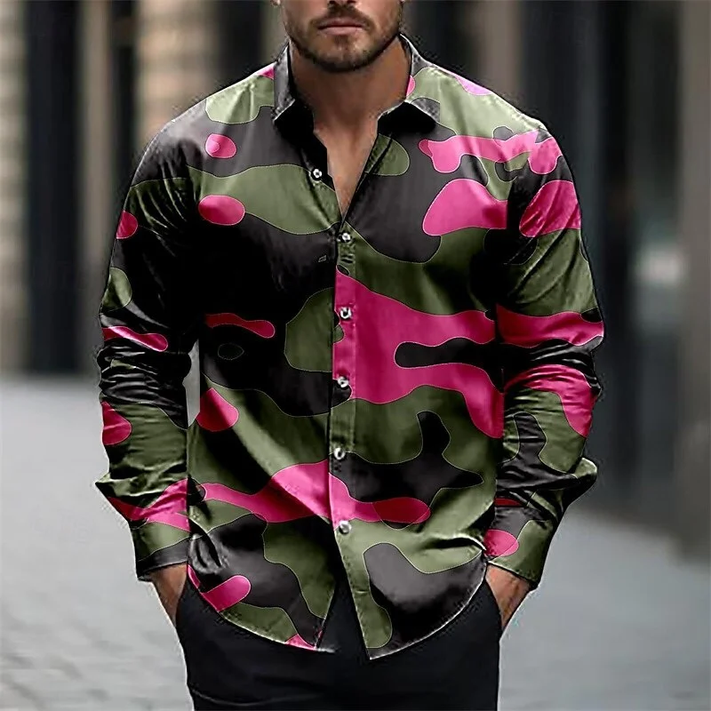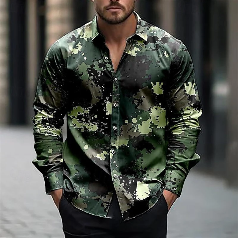 2025 Men’s Shirt Summer Shirt Casual Shirt Army Green Long Sleeve Camouflage Lapel Button Clothing Polyester Fashion Casual 6XL