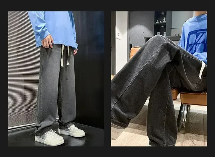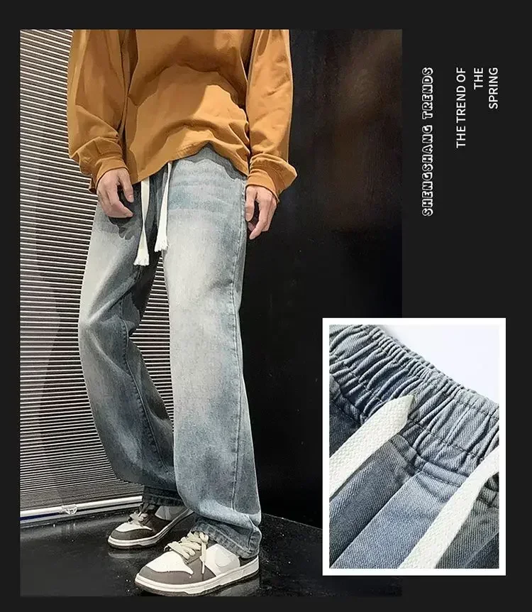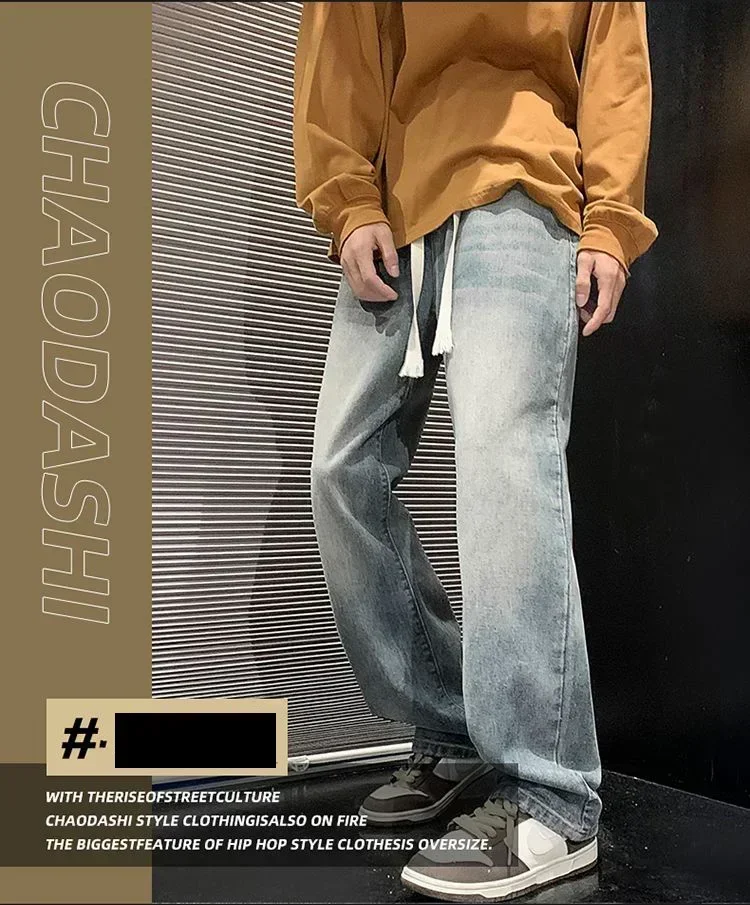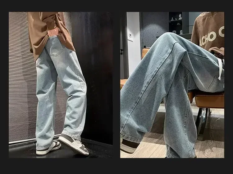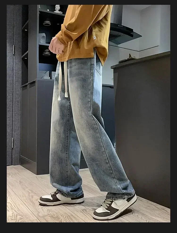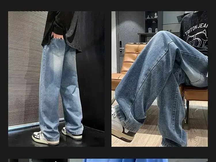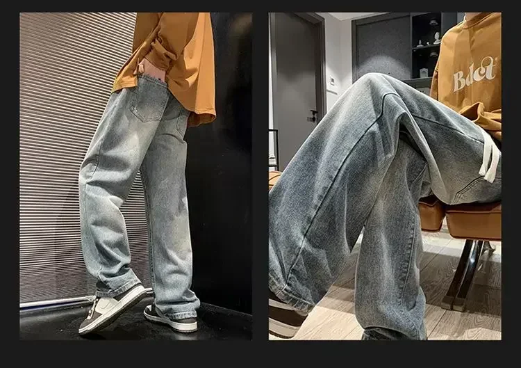 Merican Retro Washed Jeans Men's Loose Denim Trousers Street Hip-hop Straight Wide-leg Pants Y2k College Student Baggy Pants