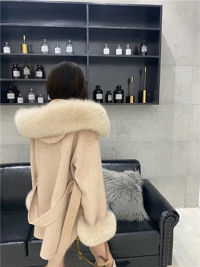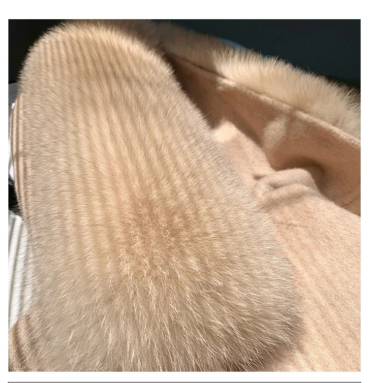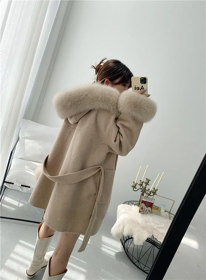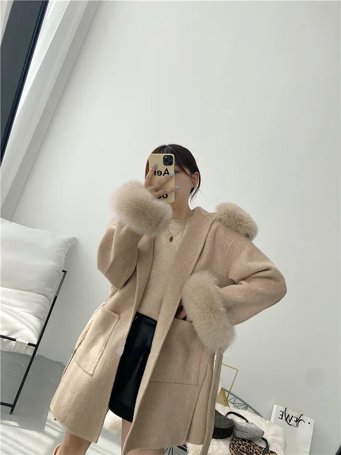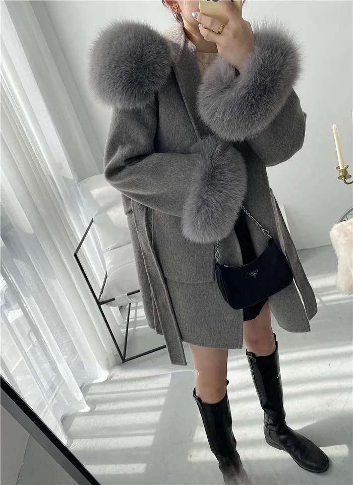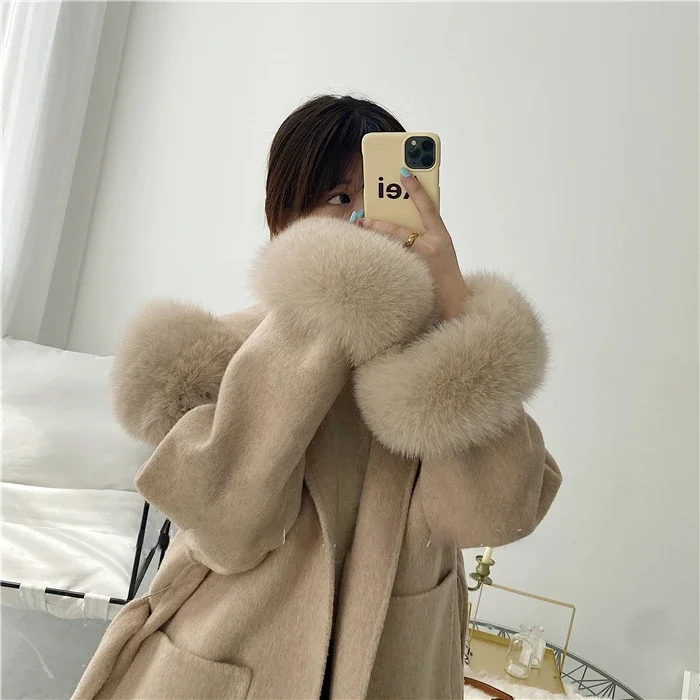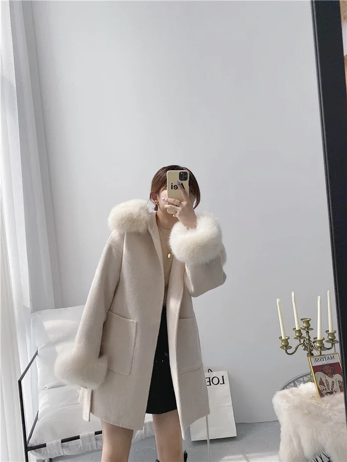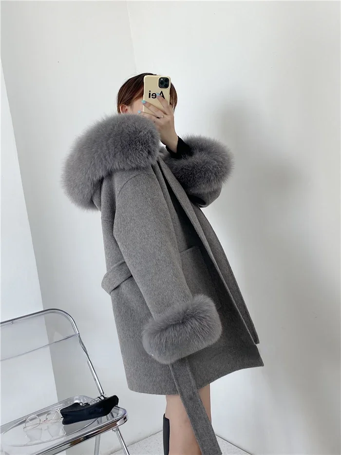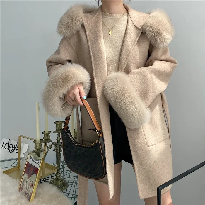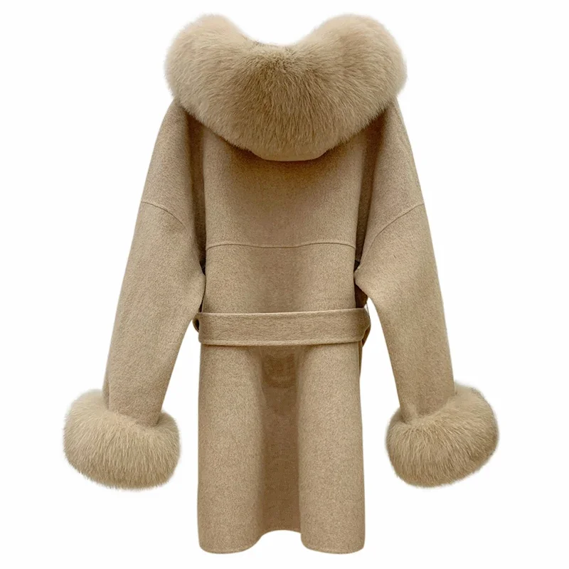 2025 New Oversize Ladies Outerwear Real Fur Coat Spring Jacket Women Natural Fox Fur Collar Cuffs Hood Cashmere Wool Woolen
