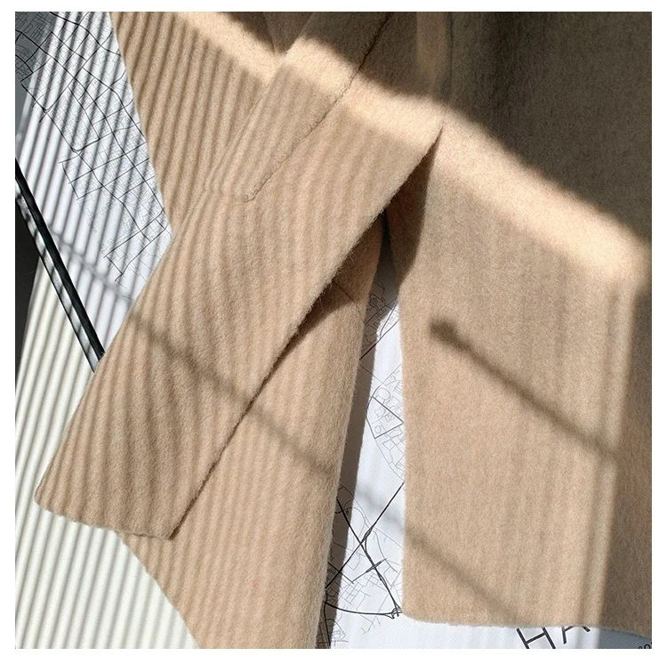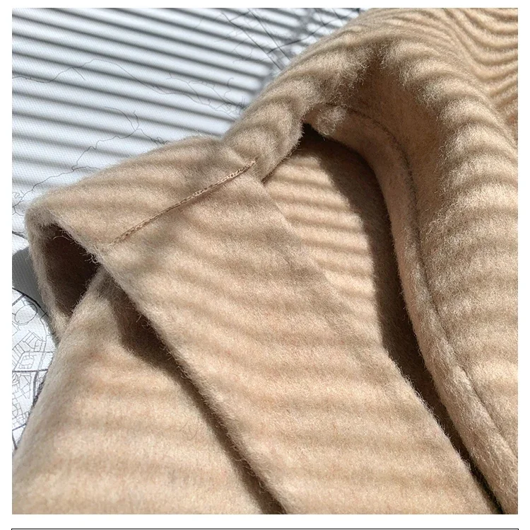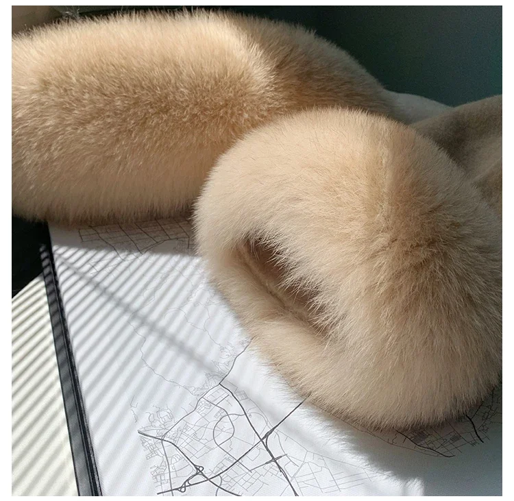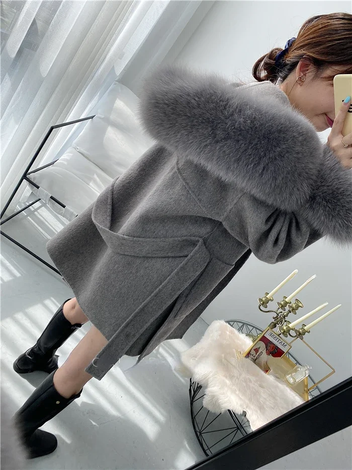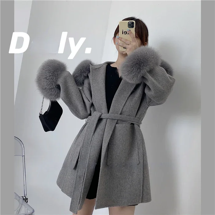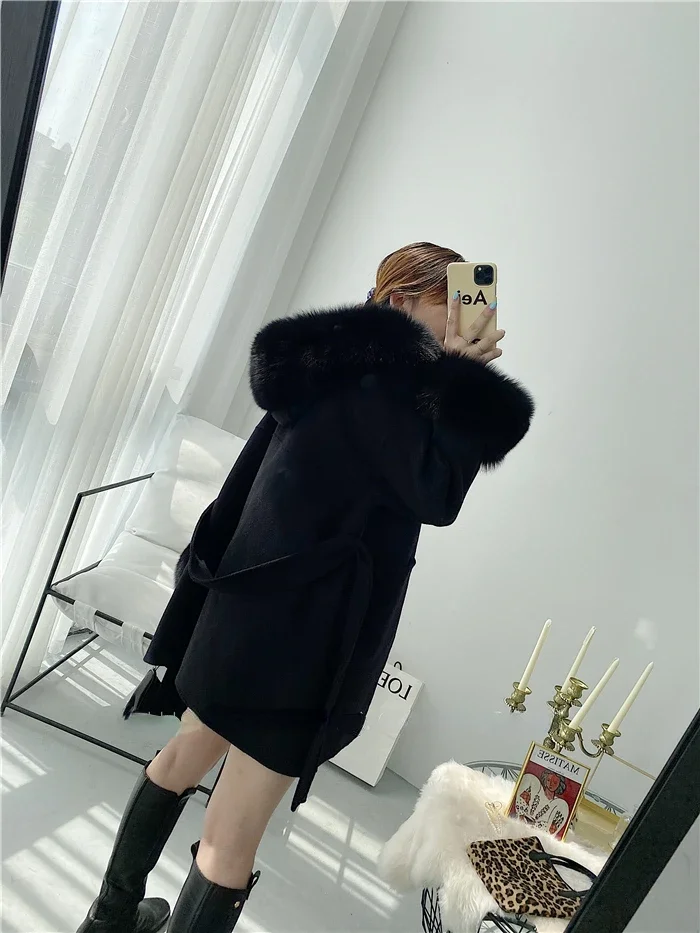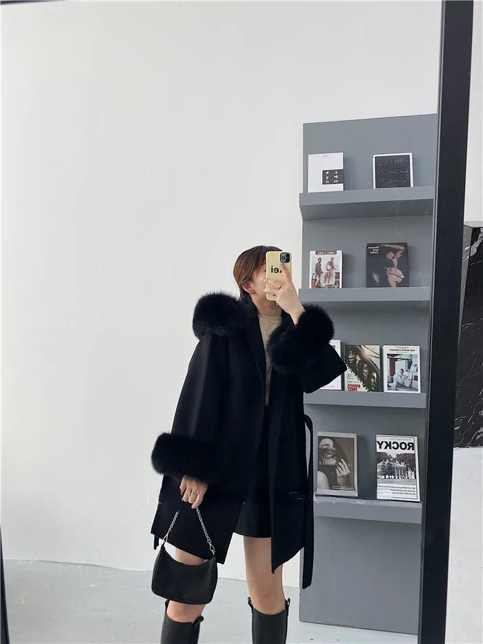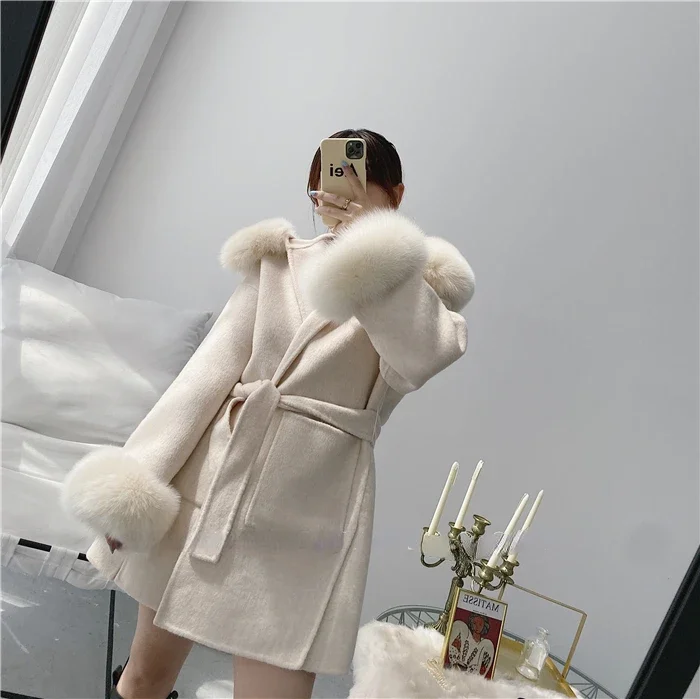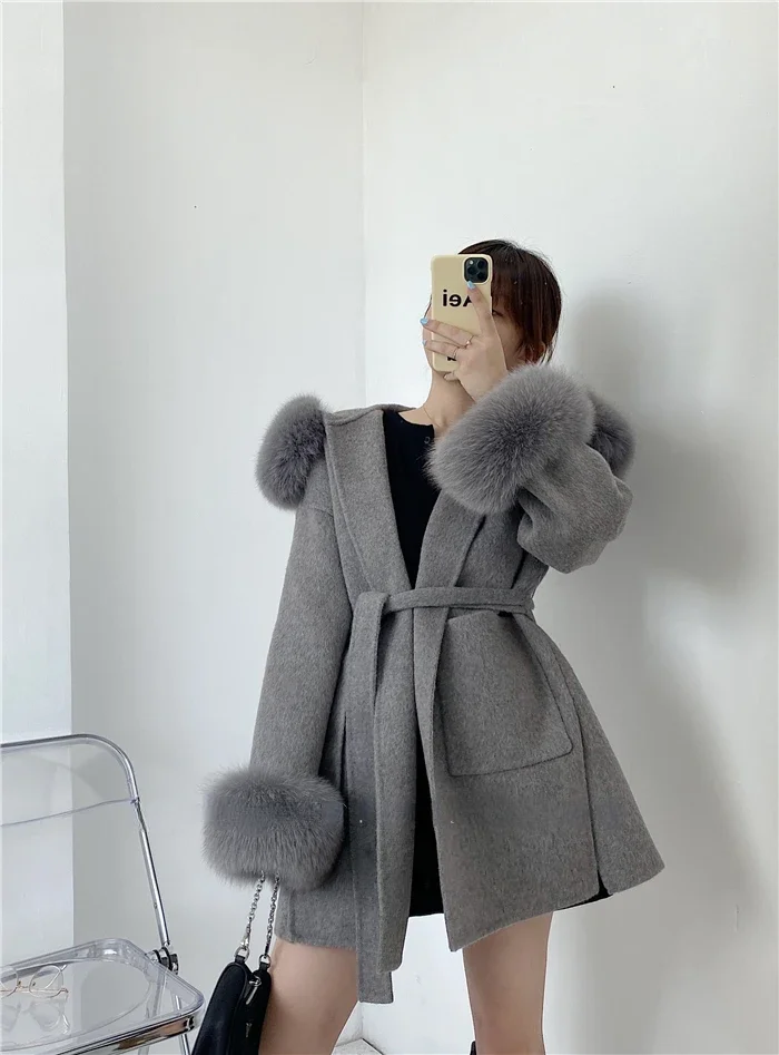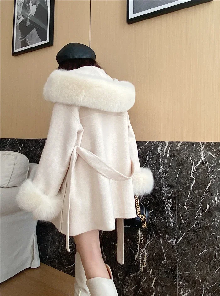 2025 New Oversize Ladies Outerwear Real Fur Coat Spring Jacket Women Natural Fox Fur Collar Cuffs Hood Cashmere Wool Woolen