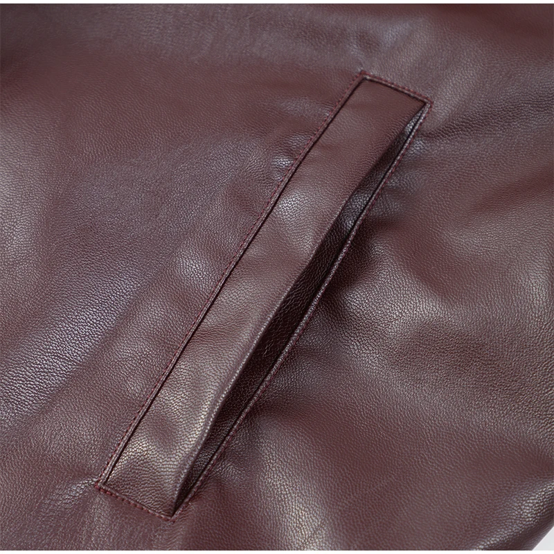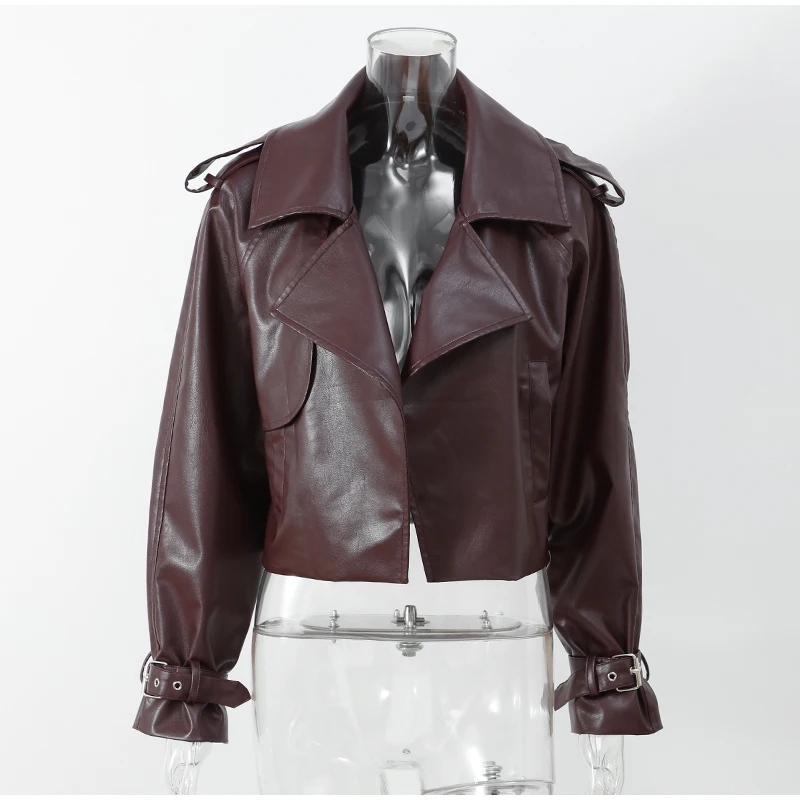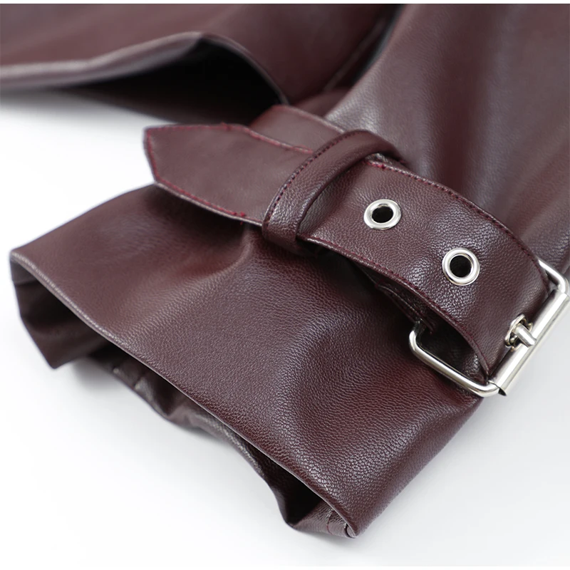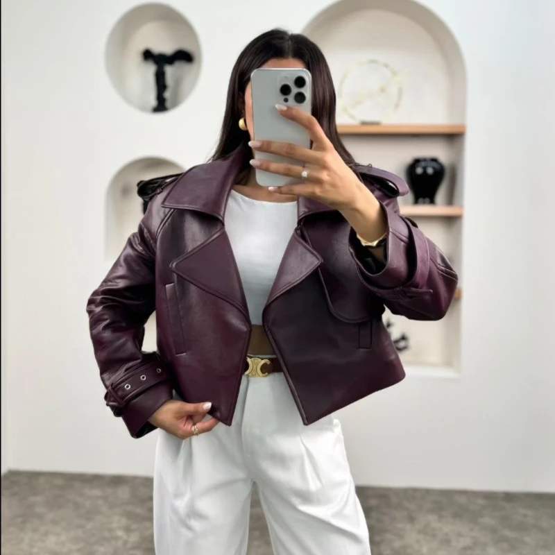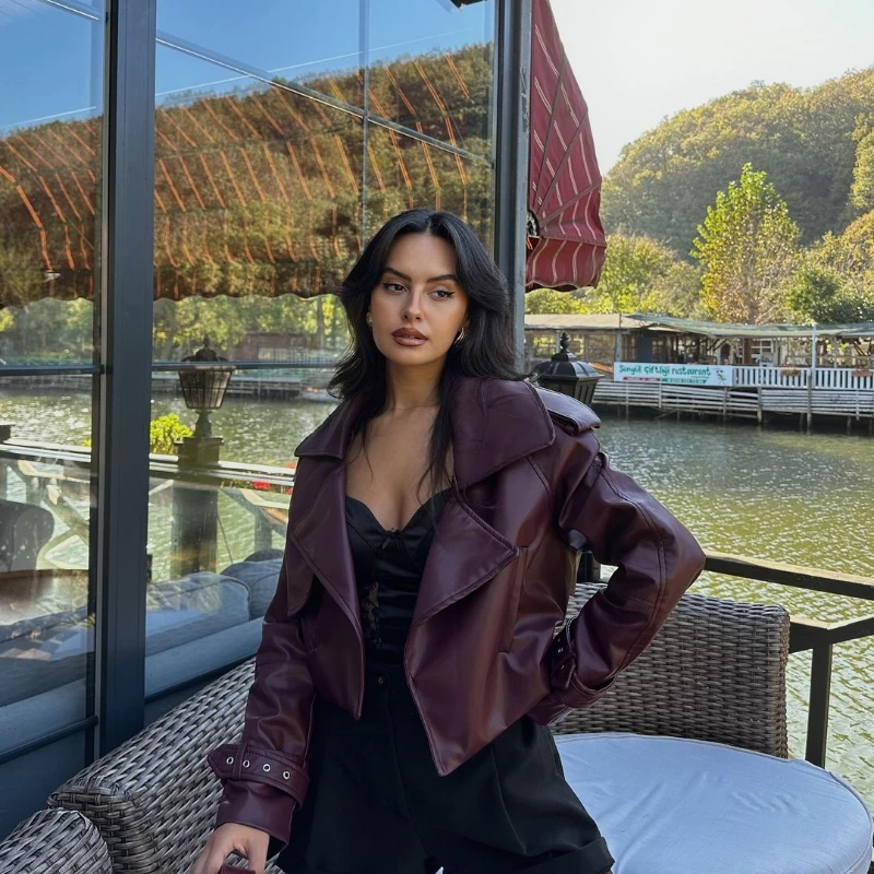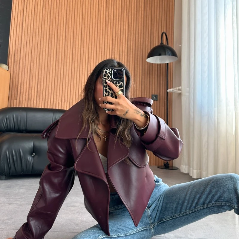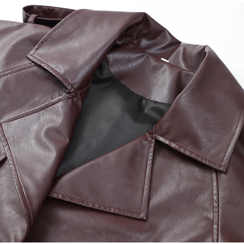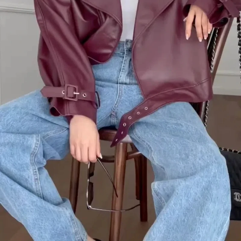 2025 New Women Burgundy Lapel Leather Jackets Fashion Casual Loose Pockets Long Sleeve Coats Spring Female High Street Outerwear