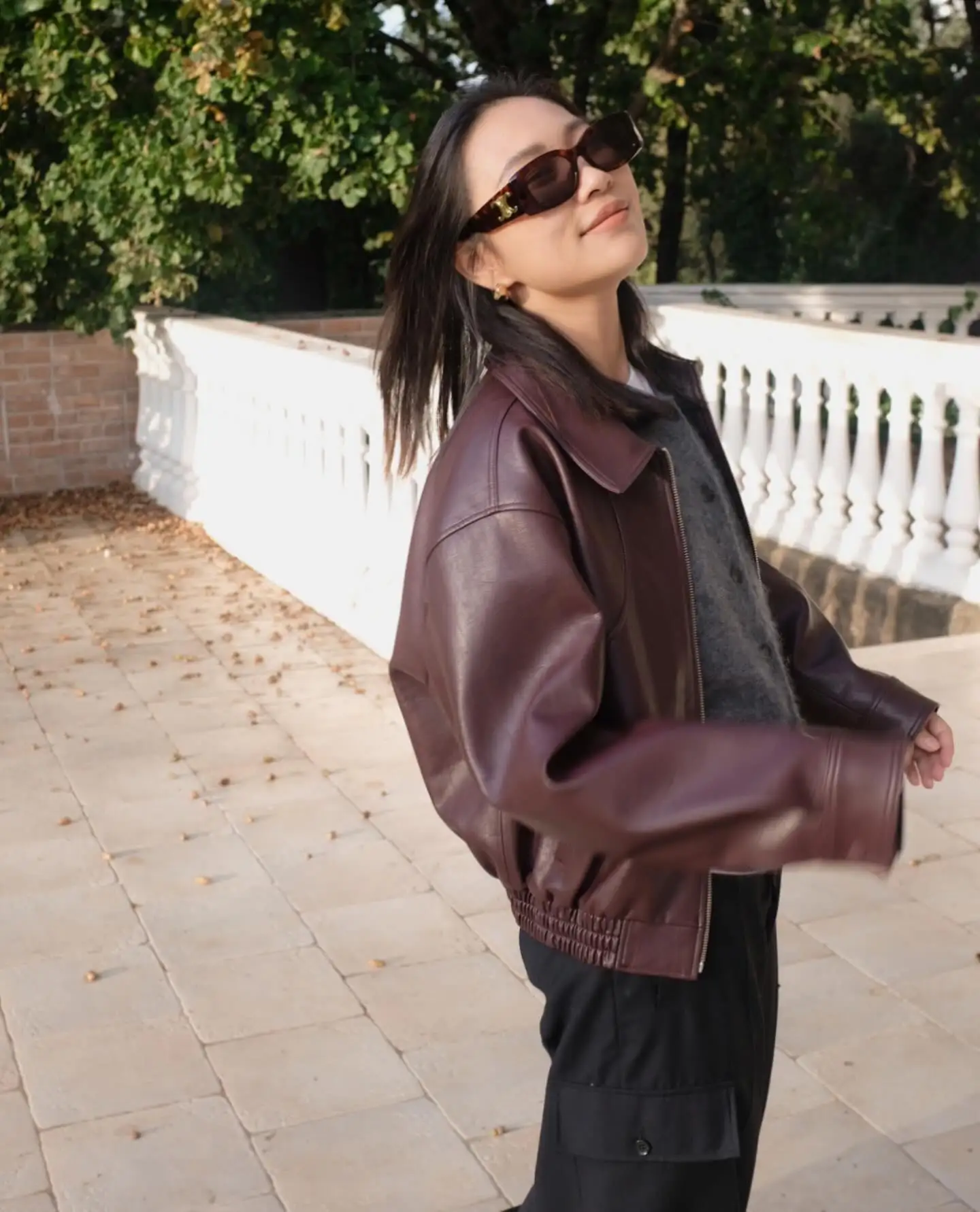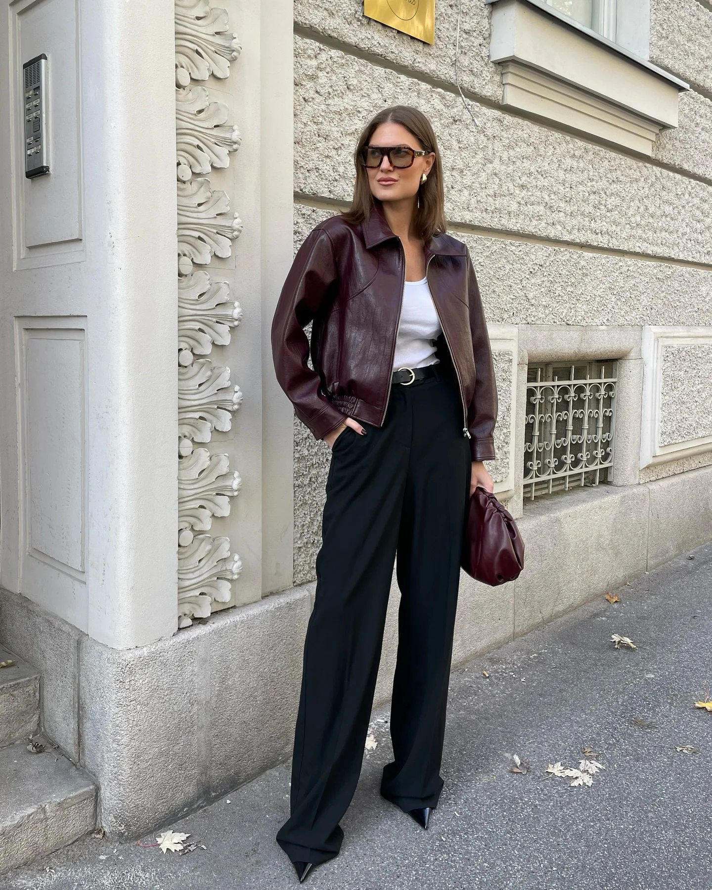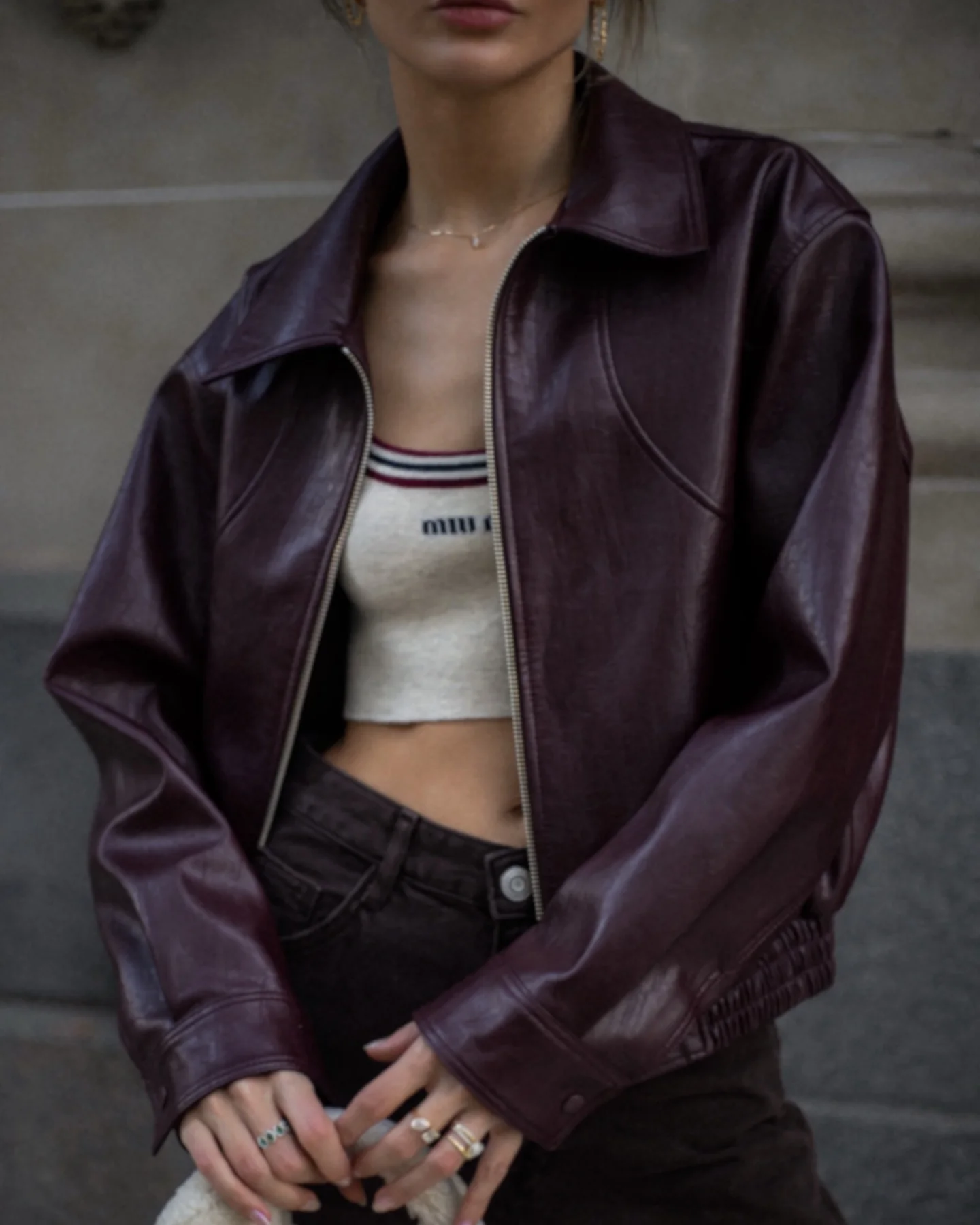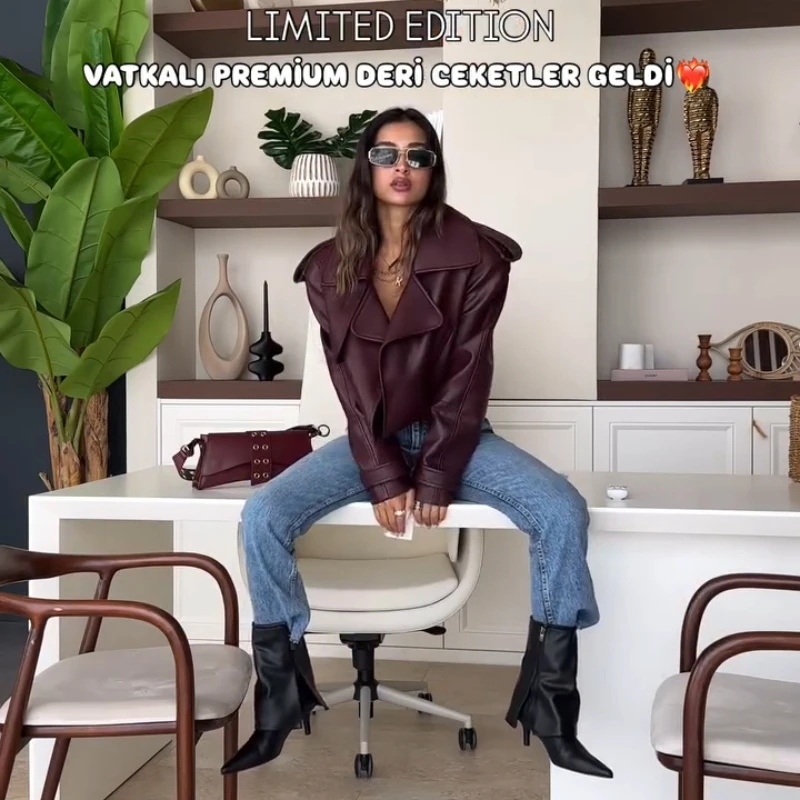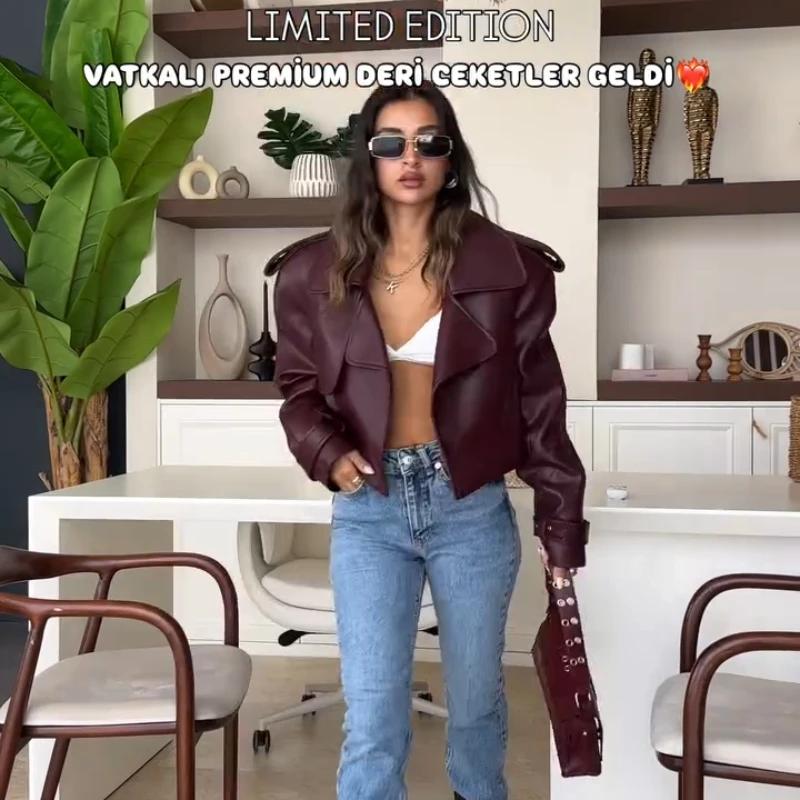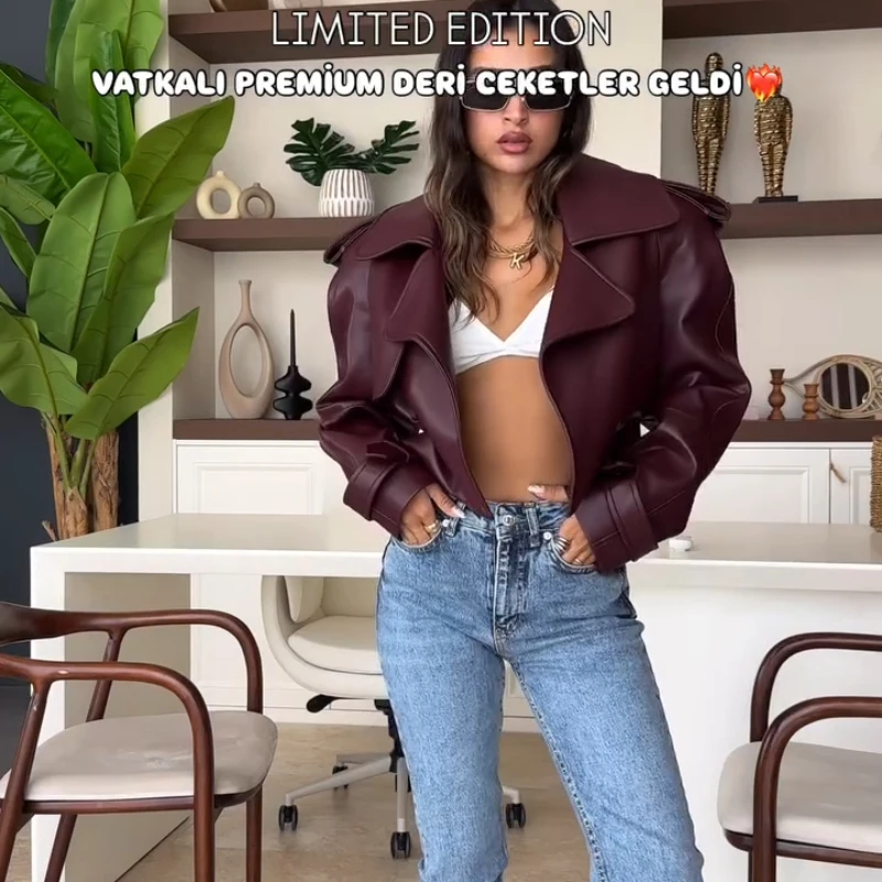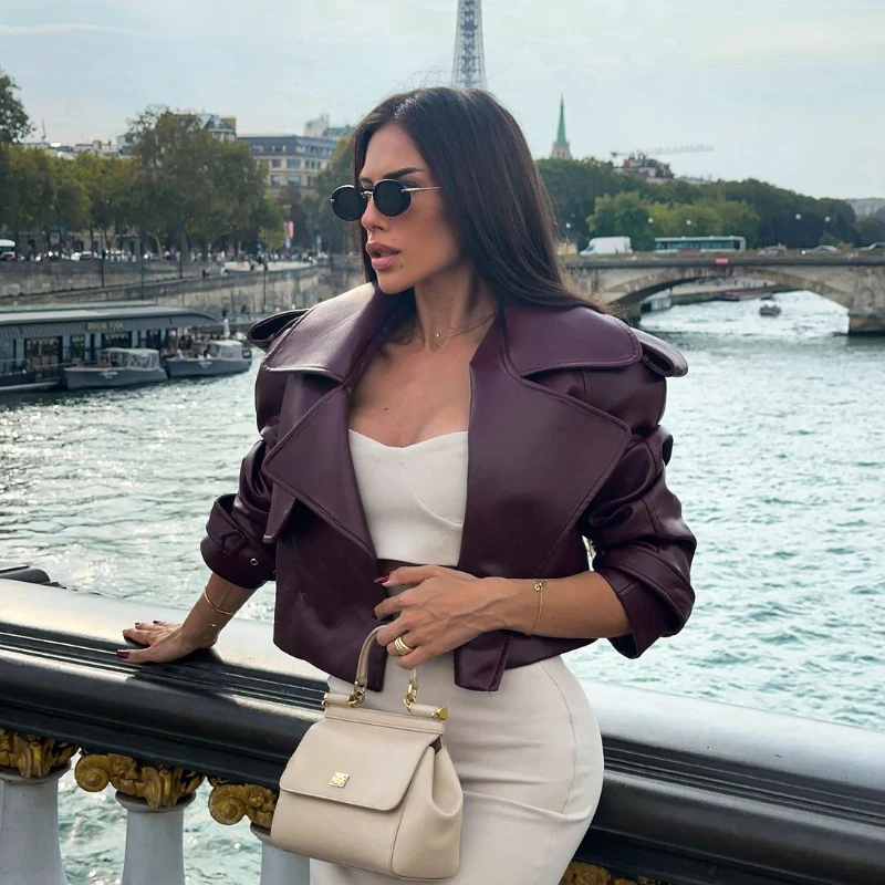 2025 New Women Burgundy Lapel Leather Jackets Fashion Casual Loose Pockets Long Sleeve Coats Spring Female High Street Outerwear
