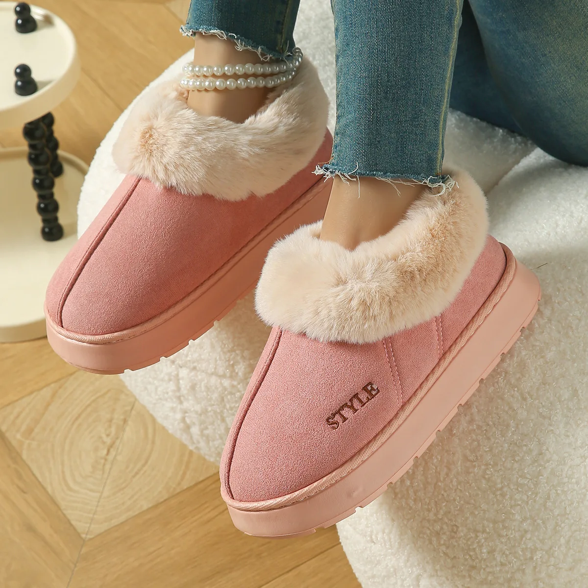 With their pink faux suede finish, these boots add a touch of elegance to any casual outfit, making them ideal for both home and outdoor use.