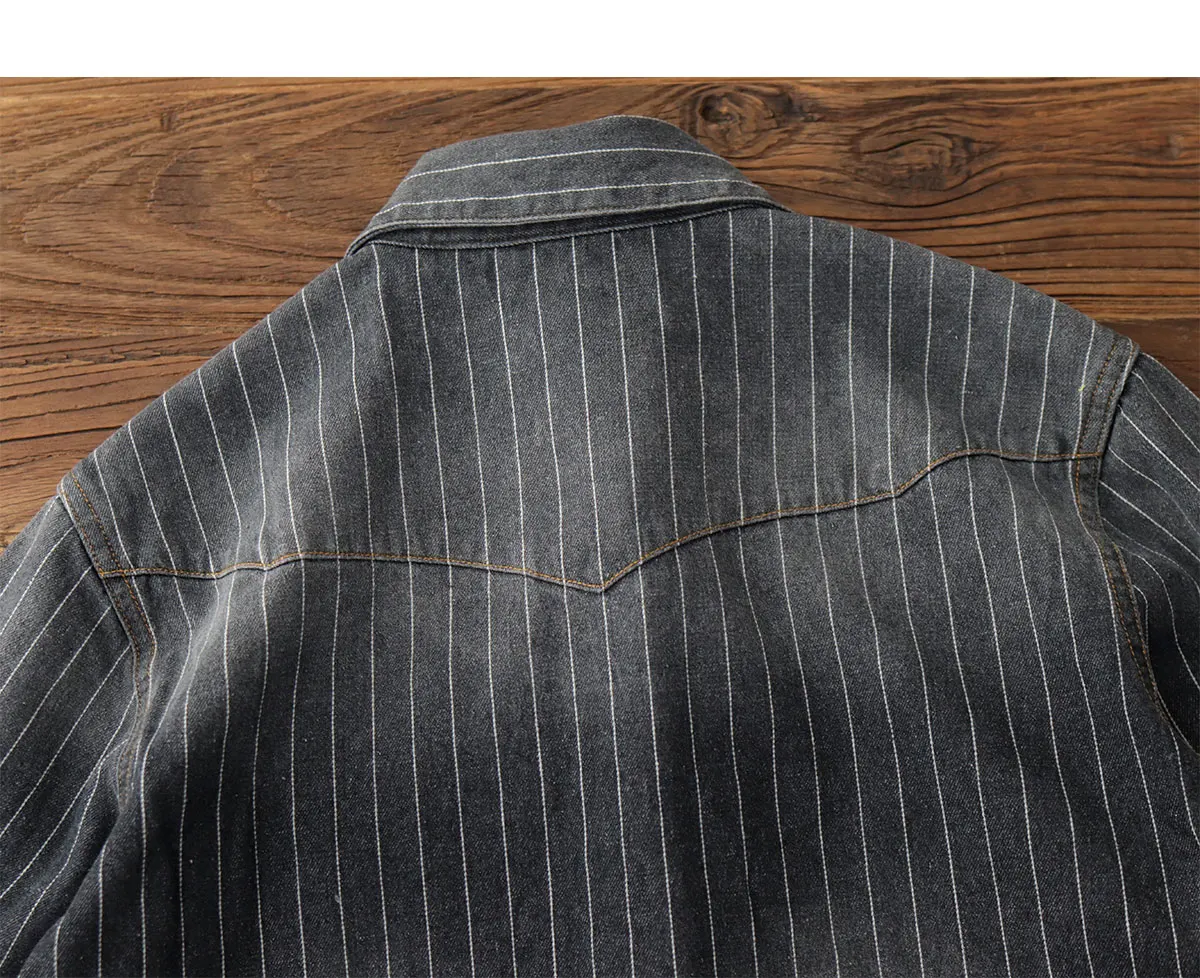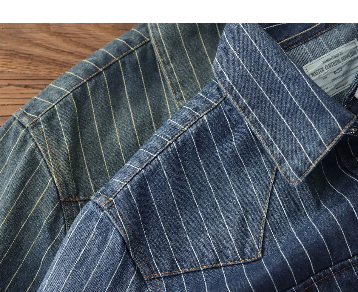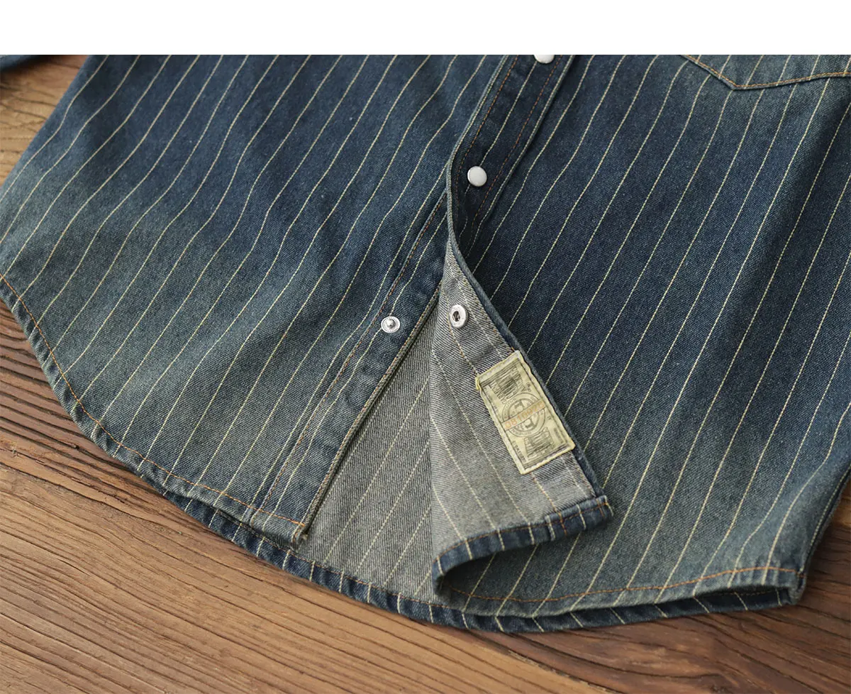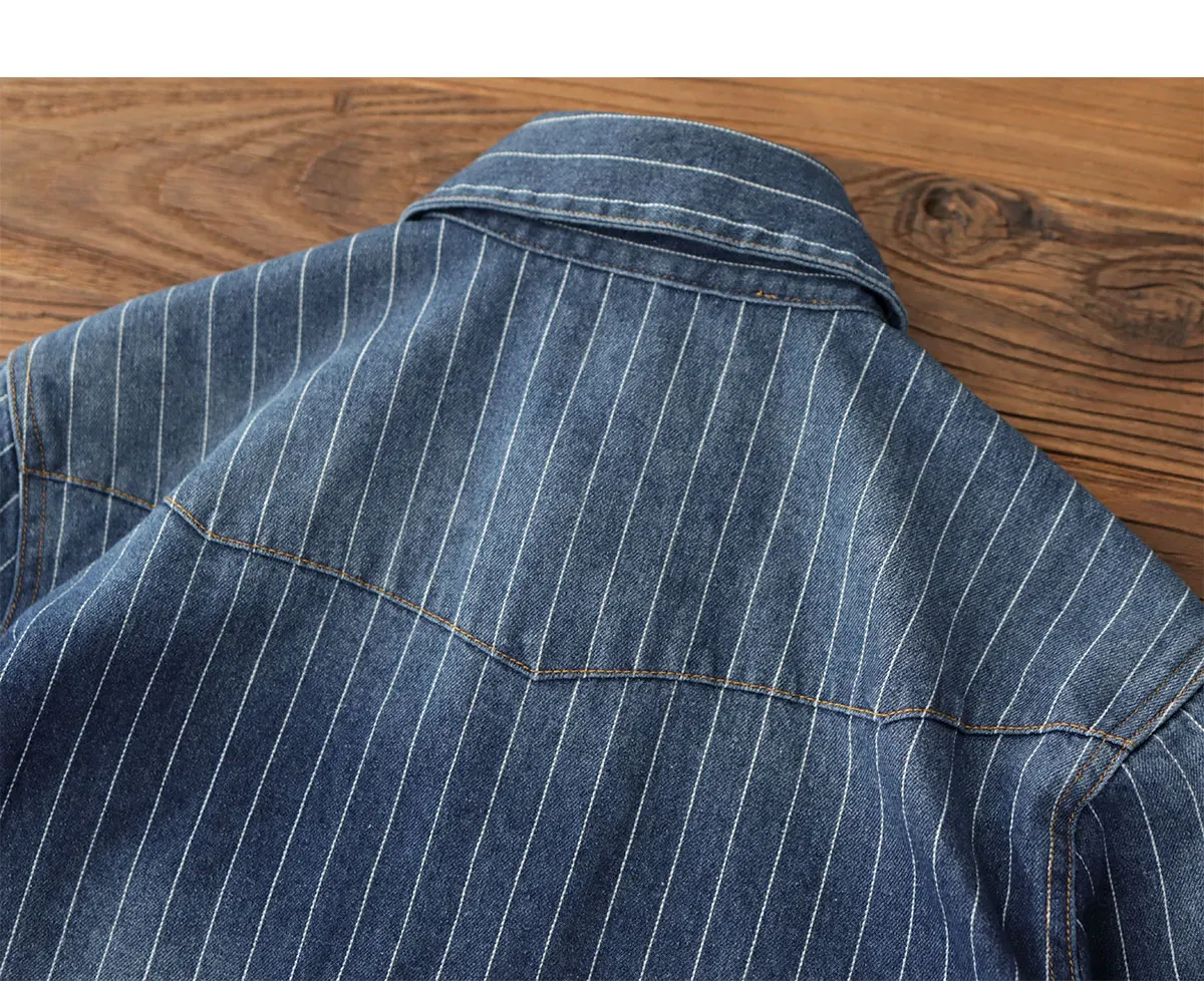 2025 Spring American Retro Denim Cargo Striped Shirt Men’s Simple 100% Cotton Washed Old Casual Double Pocket Amekaji Blouses