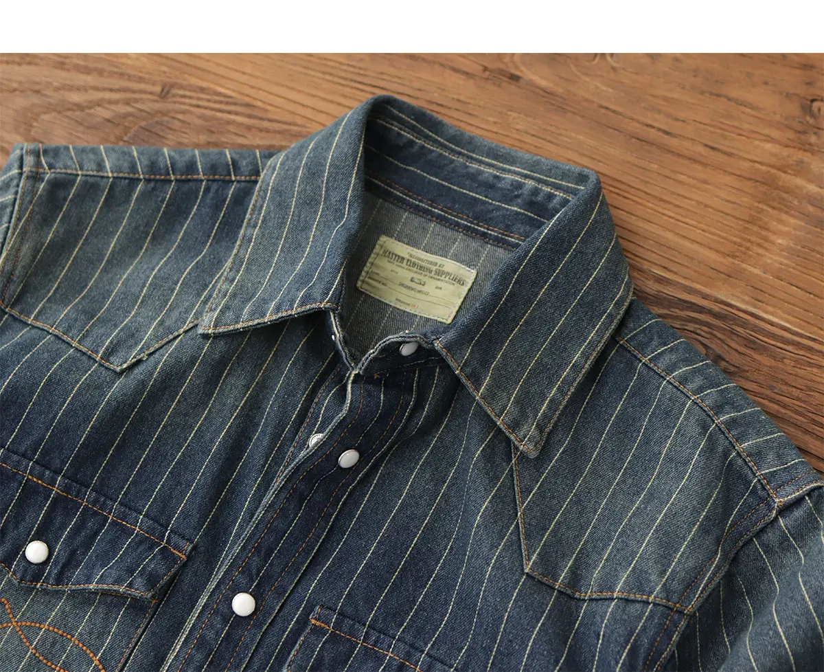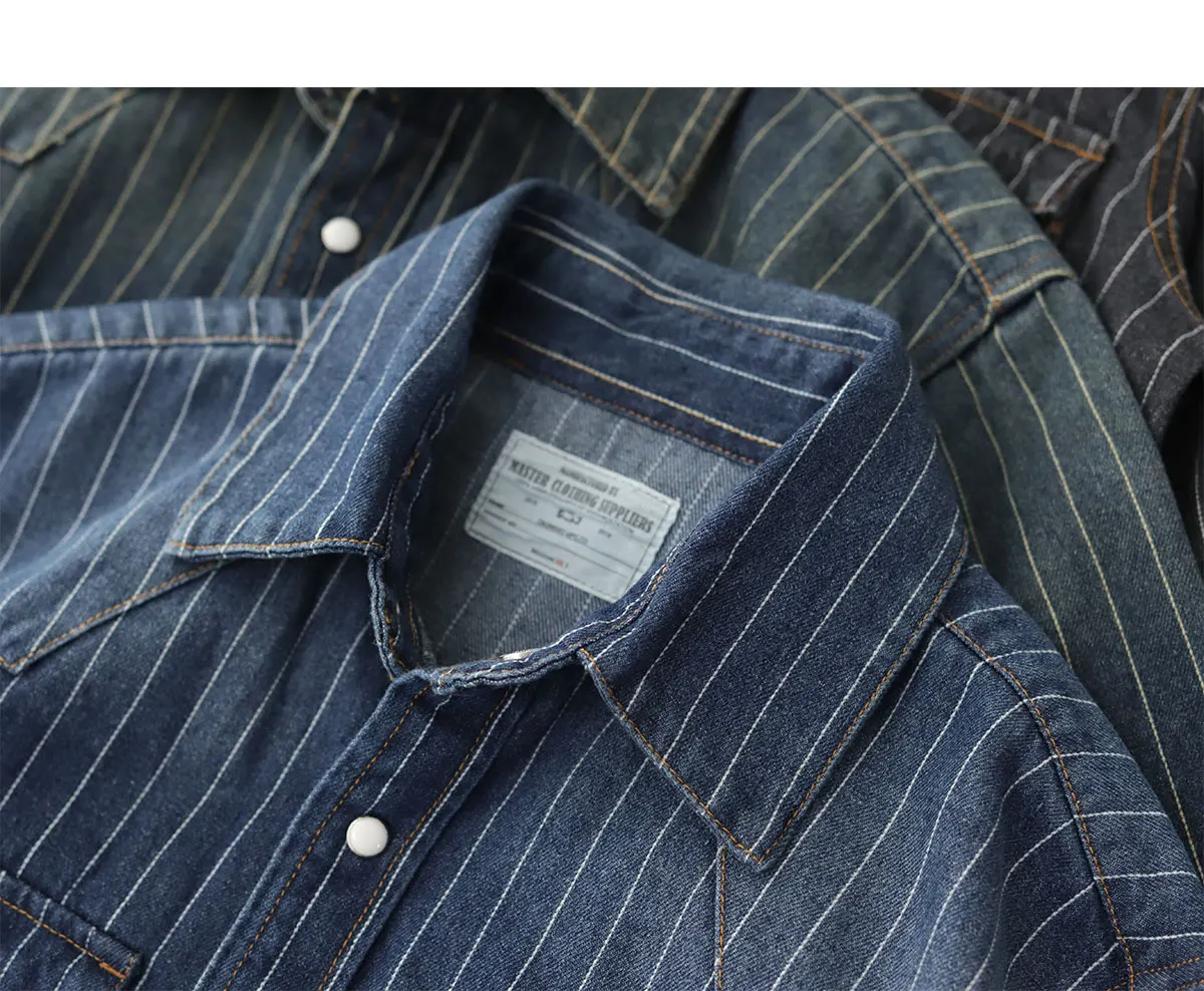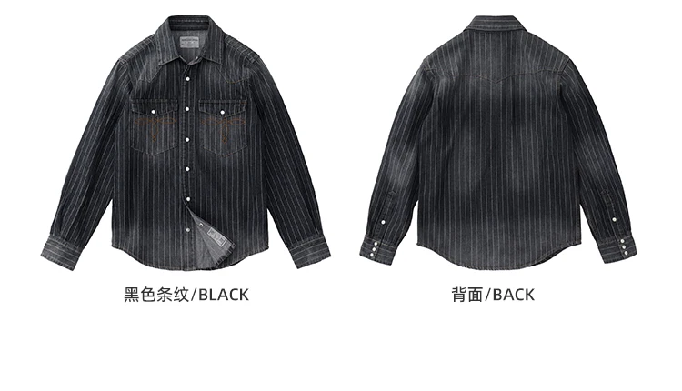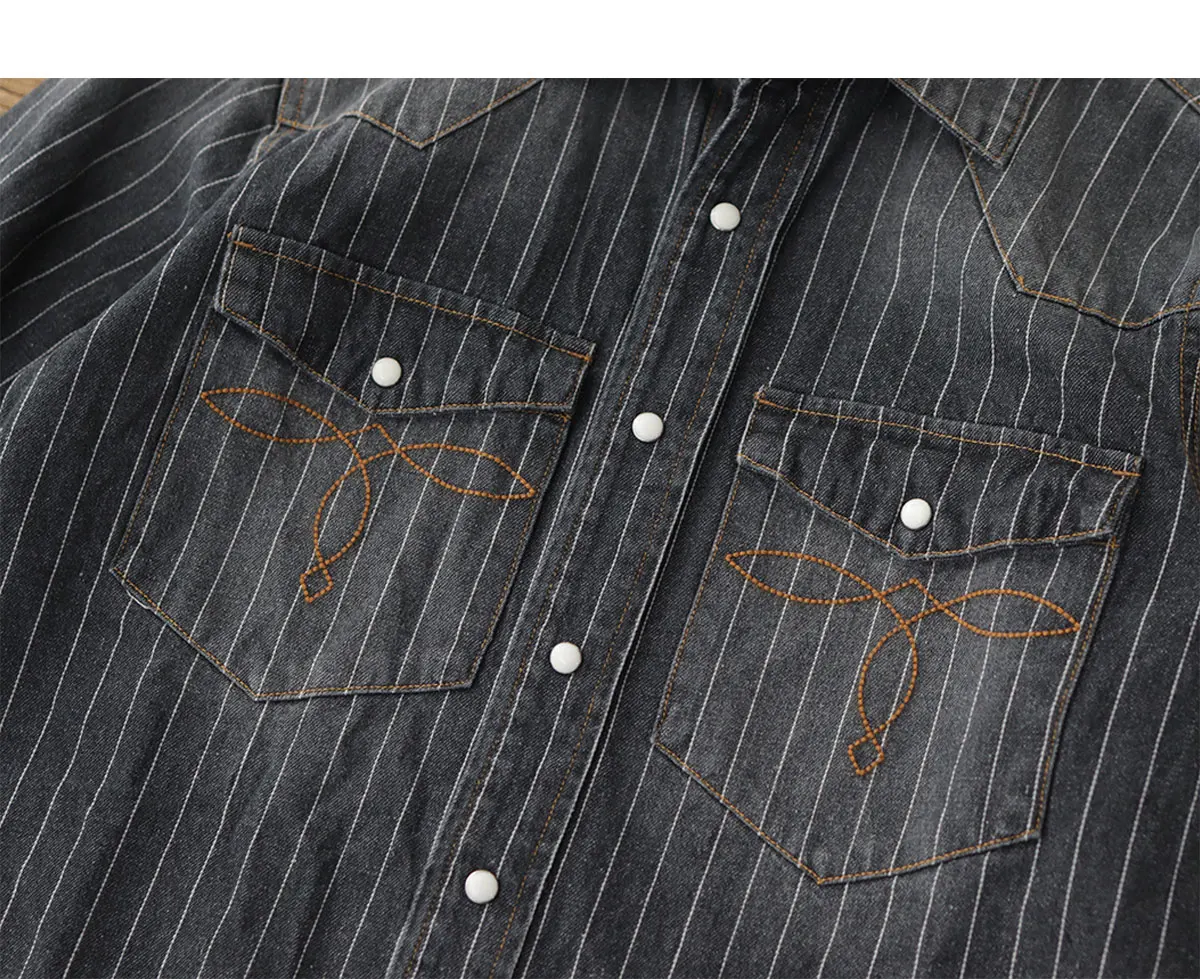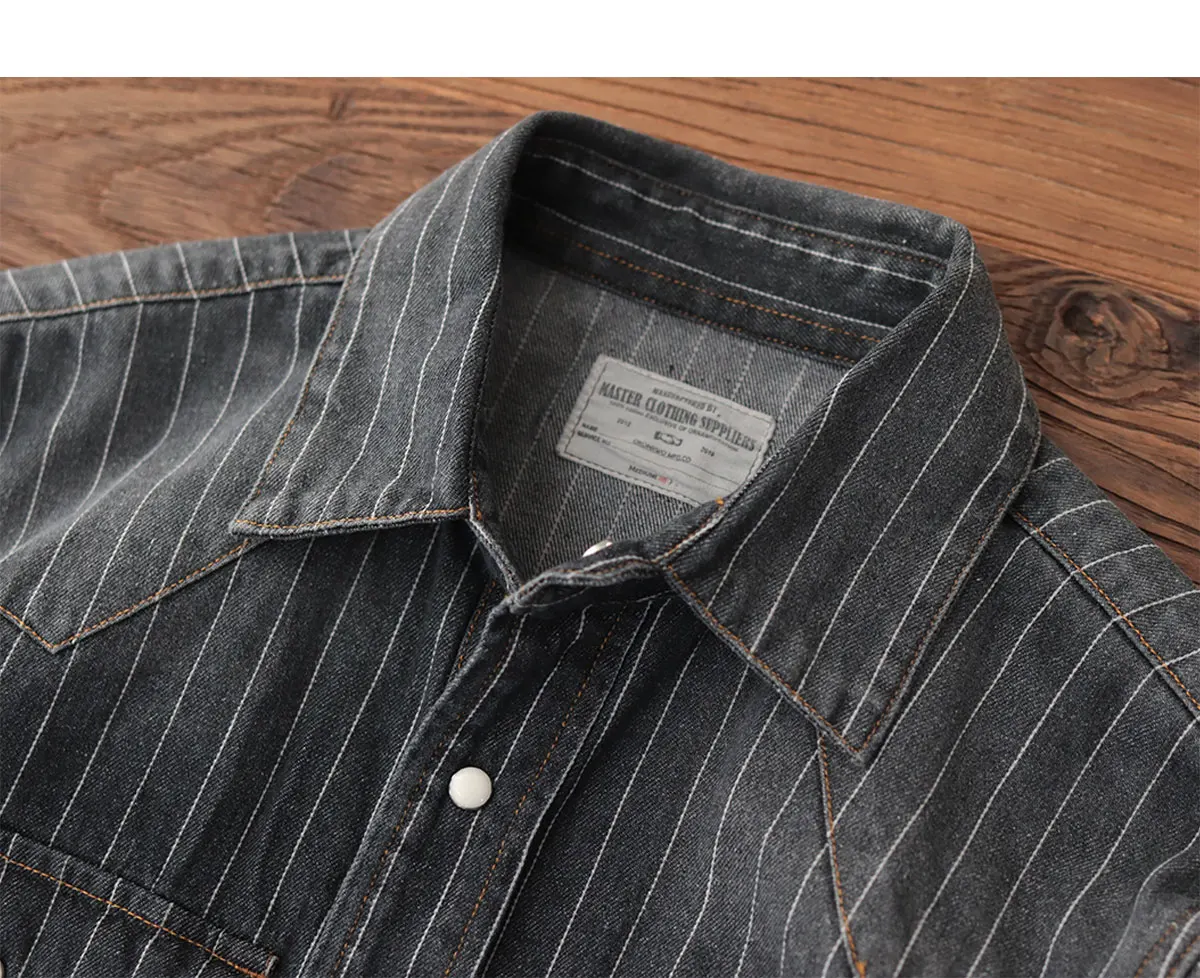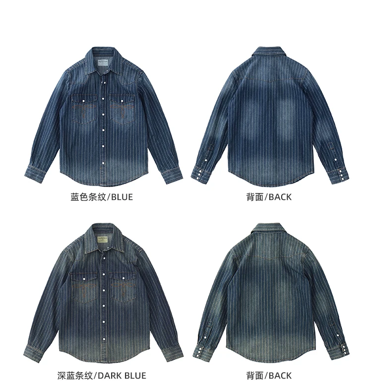 2025 Spring American Retro Denim Cargo Striped Shirt Men’s Simple 100% Cotton Washed Old Casual Double Pocket Amekaji Blouses