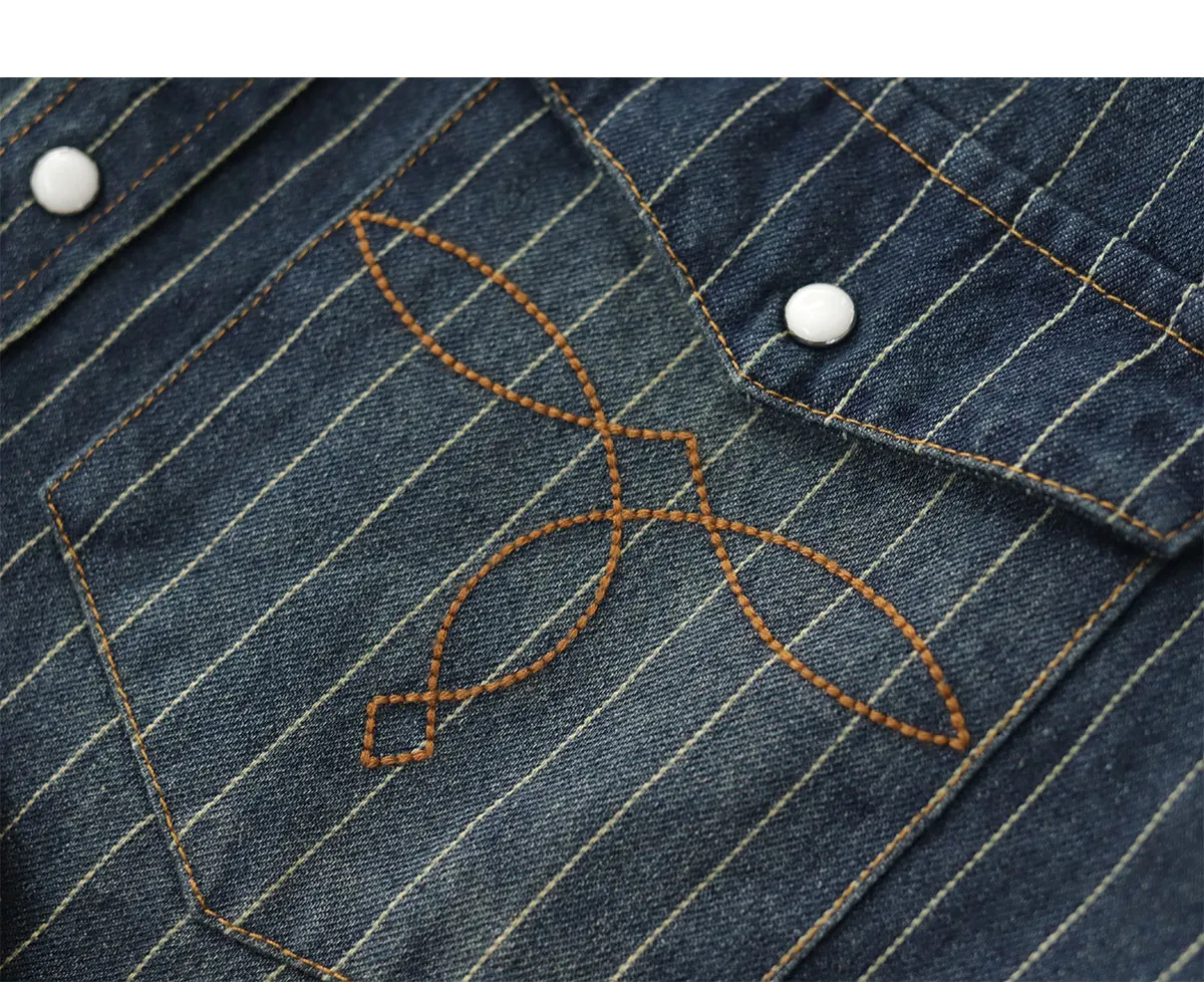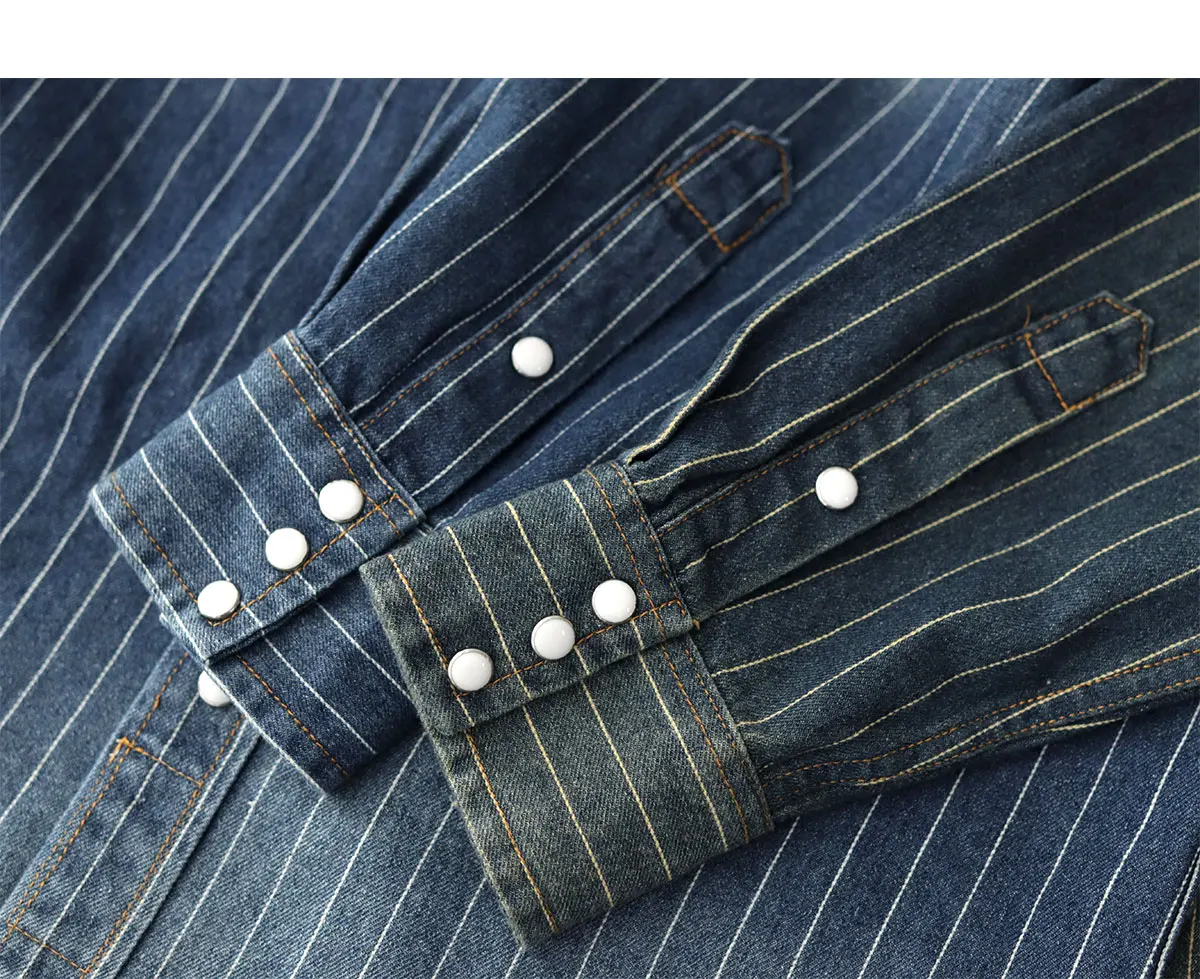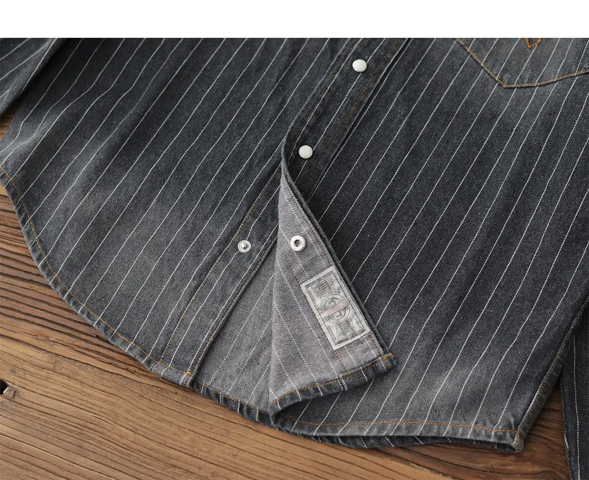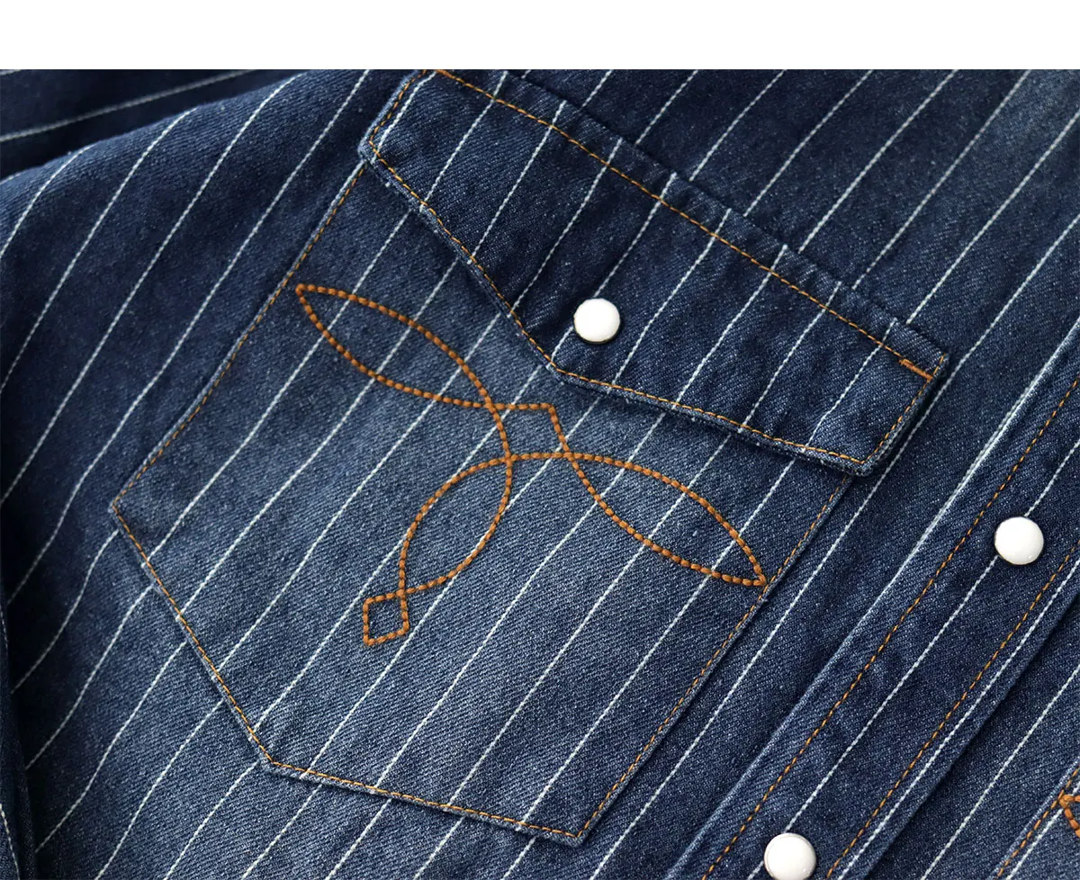 2025 Spring American Retro Denim Cargo Striped Shirt Men’s Simple 100% Cotton Washed Old Casual Double Pocket Amekaji Blouses