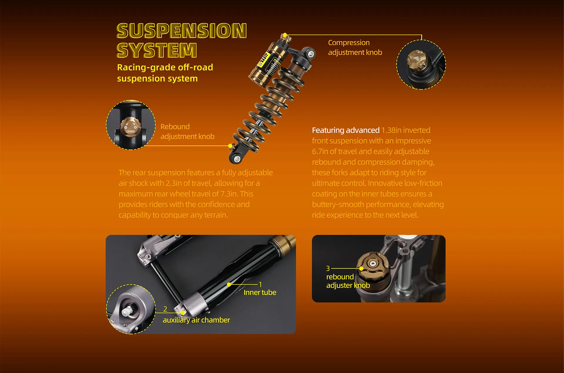 Front suspension system 1.4in inverted dual shoulder – oil spring type – adjustable rebound damping – adjustable compression damping pressure – total length 24.6in, stroke 6.7in