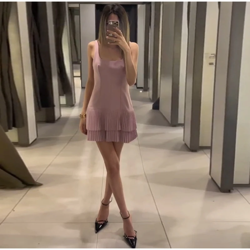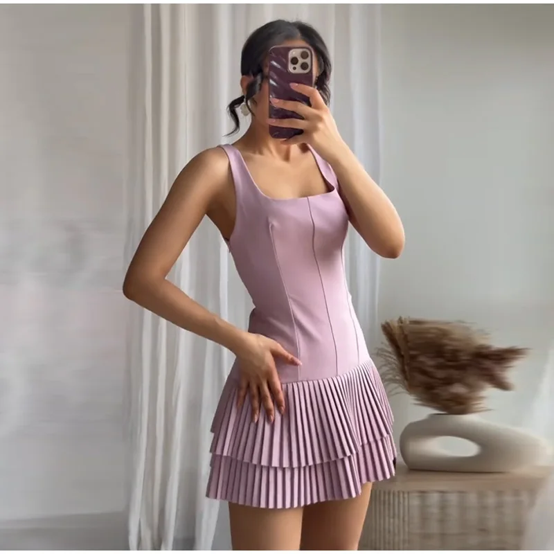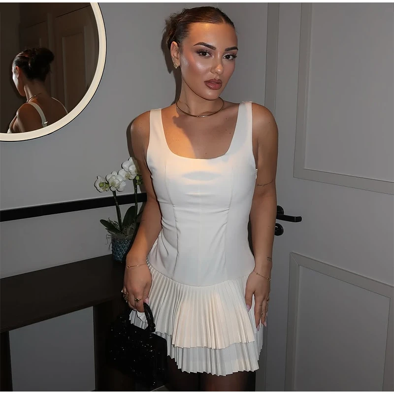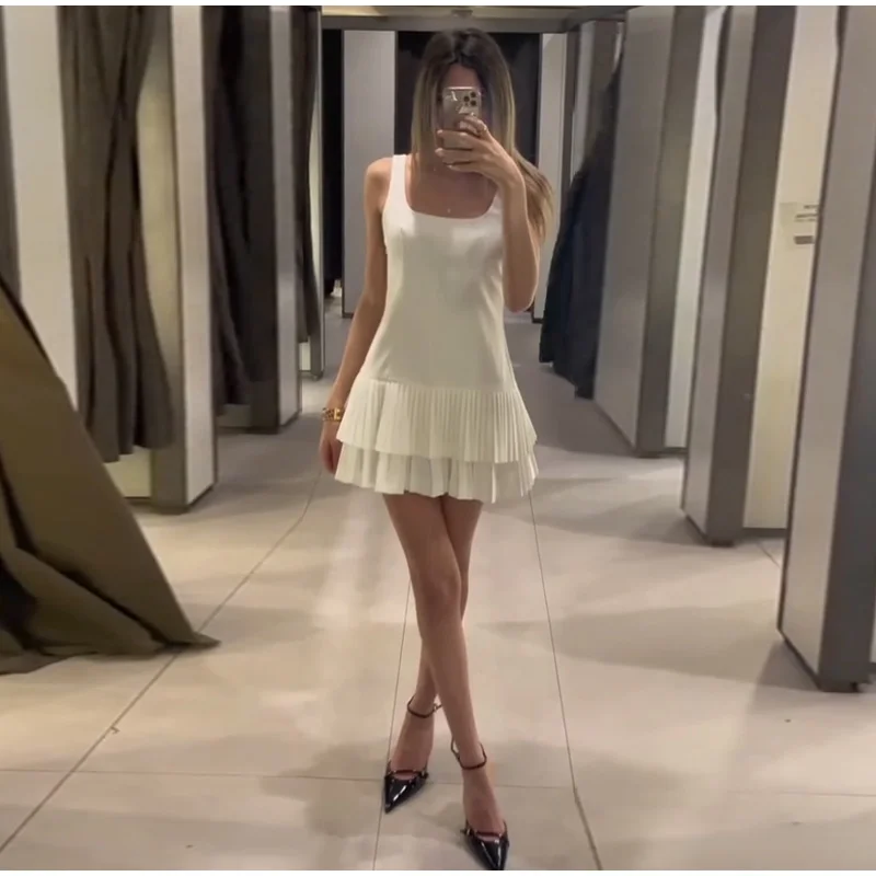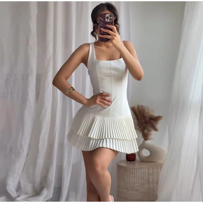 2025 Women Layered Ruffle Hem Tank Dress Square Neck Sleeveless Pleated Short Dresses Spring Summer New Street Lady Vestidos