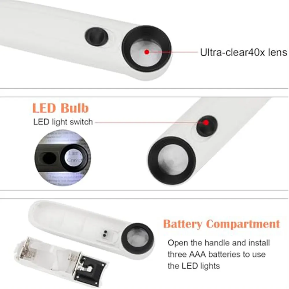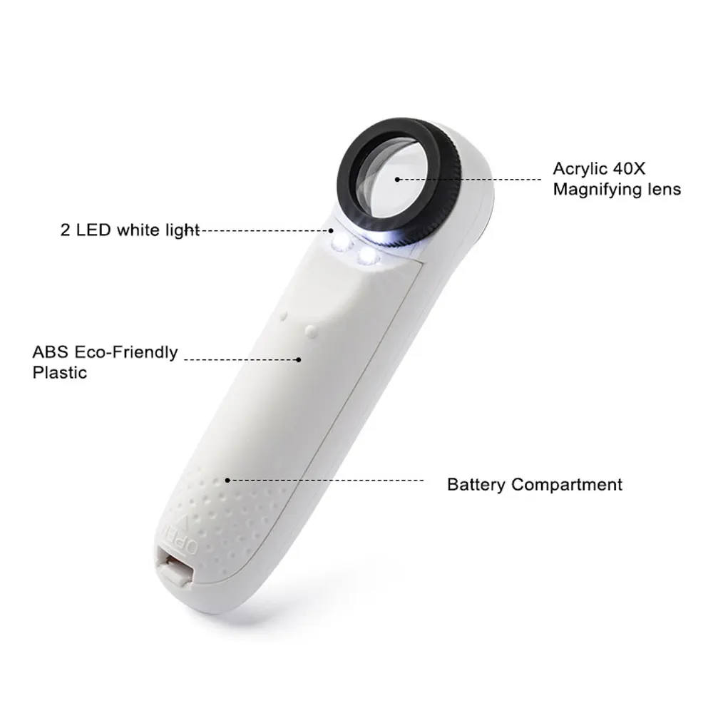 1. This magnifying glass provide 40X magnification, allowing users to see the more clear detail of items.