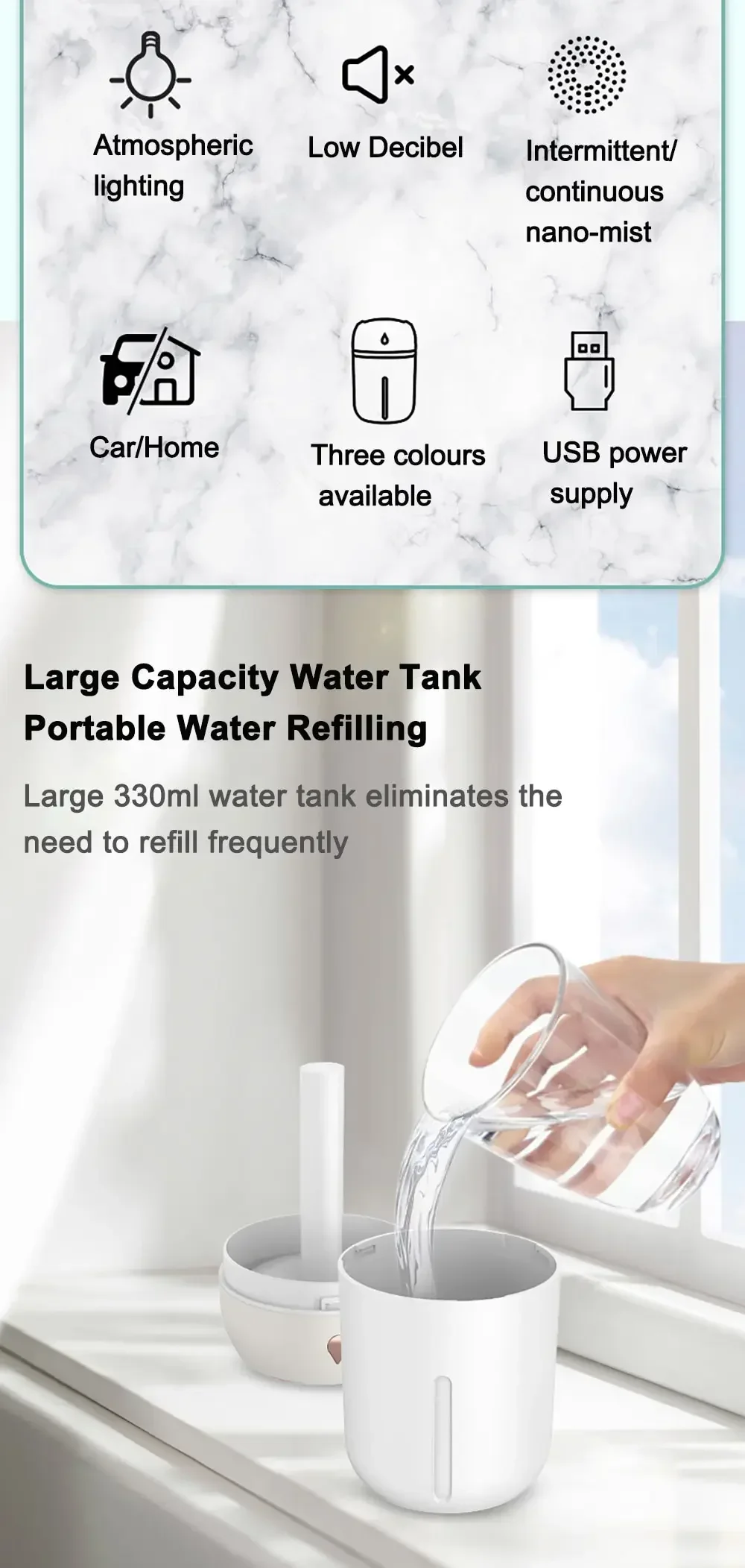 4.Large capacity water tank is ready to solve the dryness problem, meet the needs of various occasions as room,room, office, car and so on.
