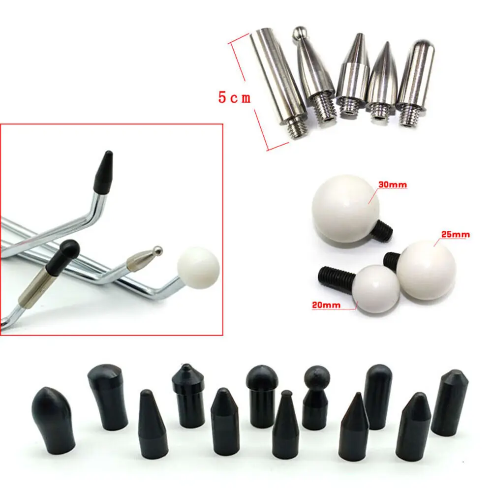 The Rod is equipped with 17 cone heads. You can choose the appropriate cone head according to the size of dent or bending. 9 cones are made of rubber, 5 cones are made of stainless steel and 3 cones are made of nylon,which will not damage the original paint on the body surface.