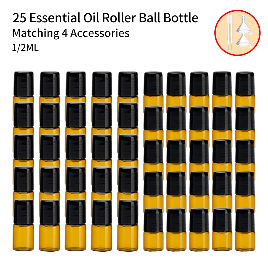 25Pcs+4 accessories essential oil rolling bottle mini with 25 ball bottles, 2 funnels, 2 straws, 1ml/2ml