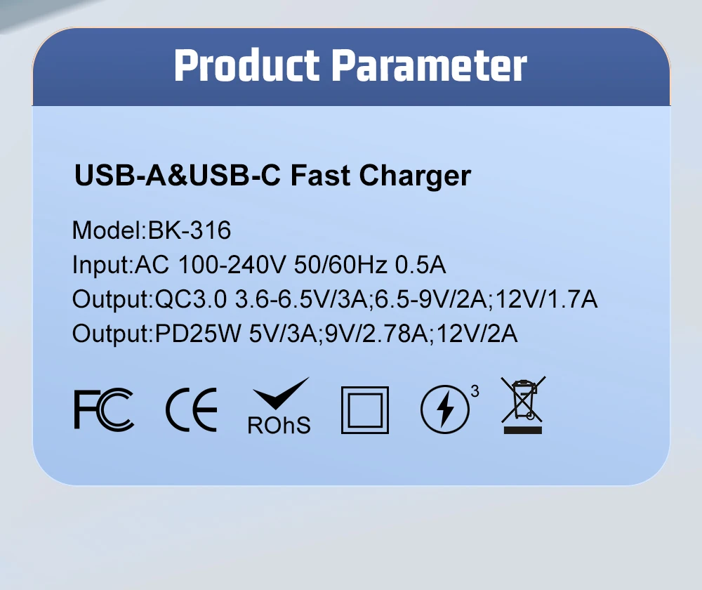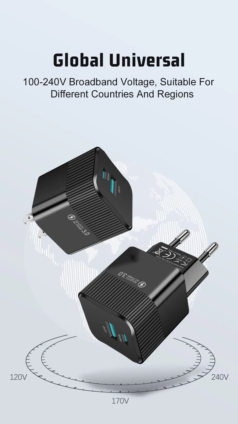 Output:QC3.0 3.6-6.5V/3A;6.5-9V/2A;12V/1.7A