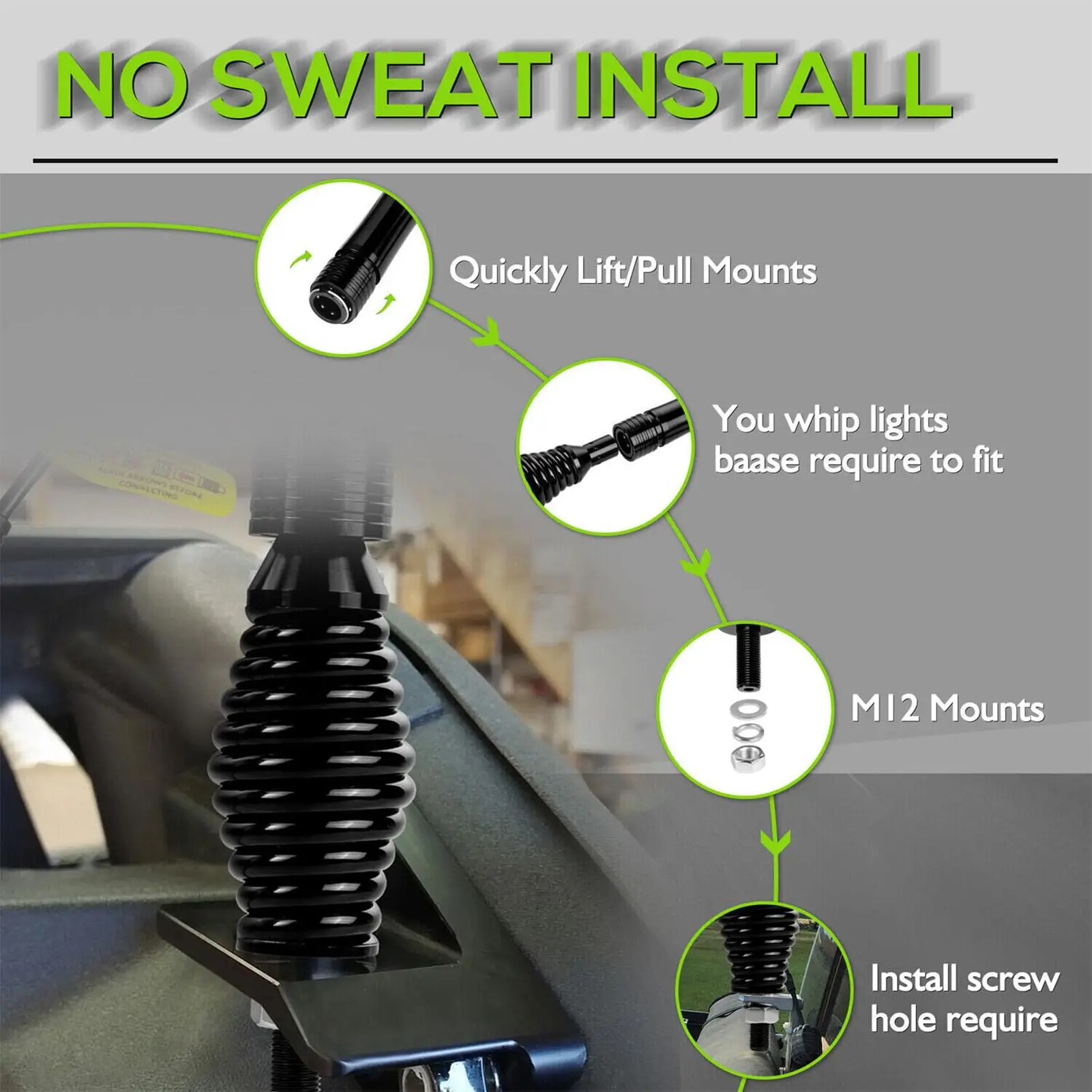 Suitable For UTV, ATV, 4 Wheel Truck, Go Kart, RZR, Can-am, Polaris, Dune Buggy, Sand Rail, Motorcycle And Boat Just Loosen TheBase, Mount It In The 12mm Hole, And Attach The Base With A Whip Light. Plug The Controller Wire Into The Whip Light, Then Connect It To The Battery. You Are Ready To Start Enjoying Your Off-Road Adventure.