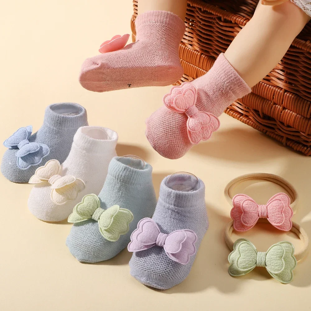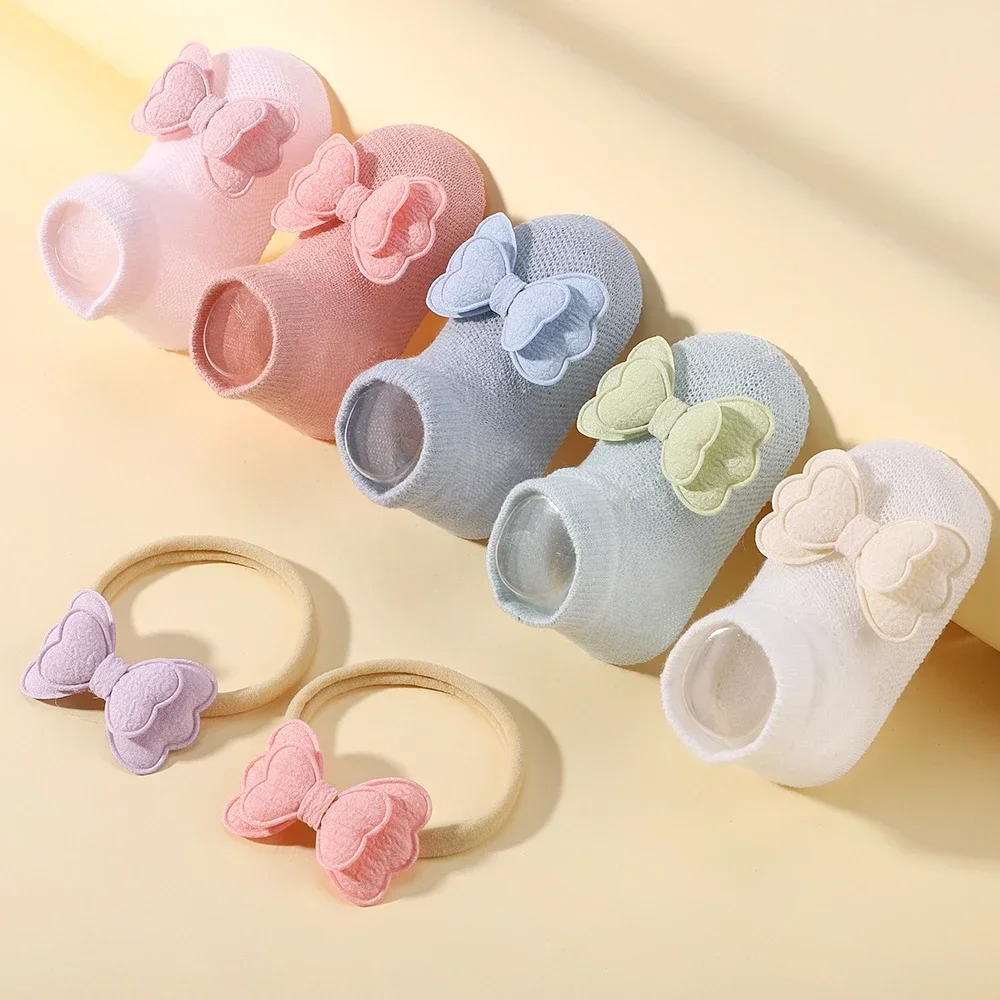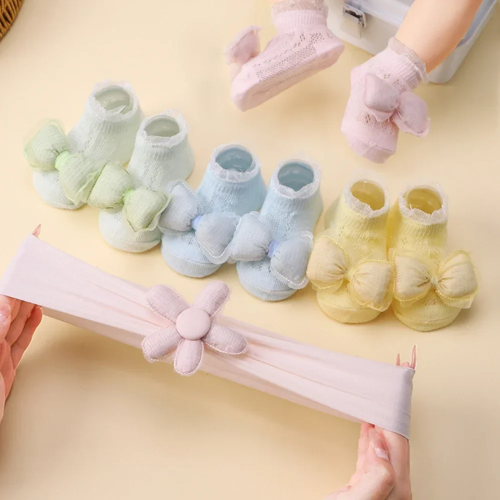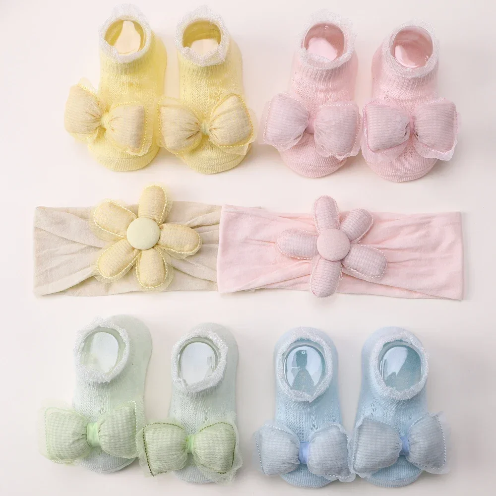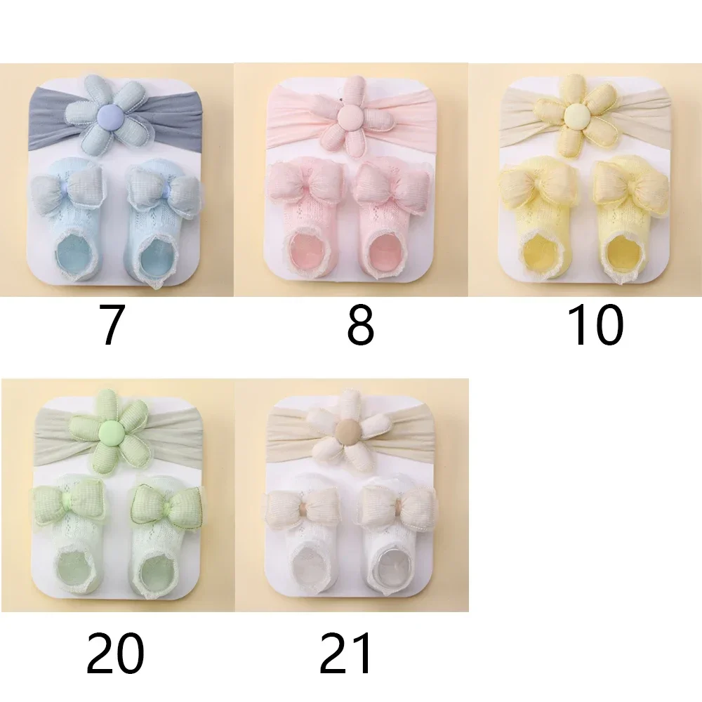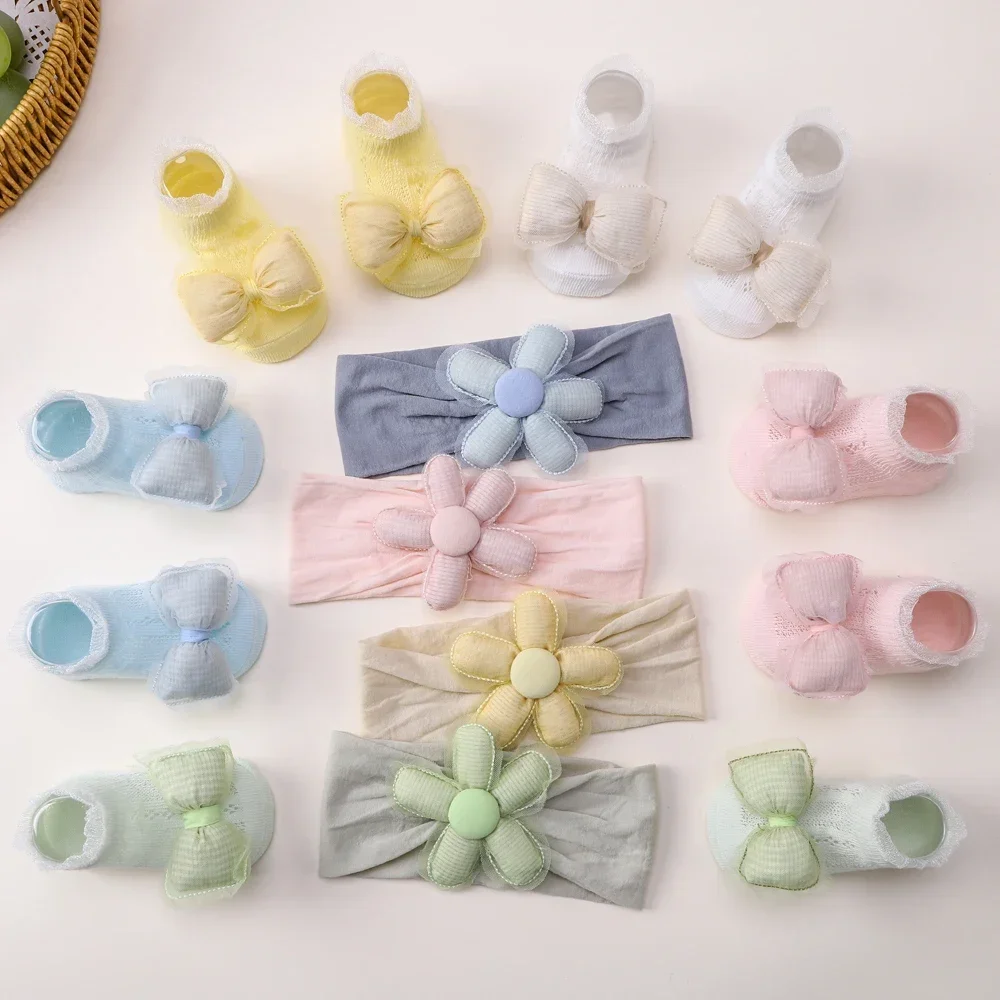 2pcs Fresh Flower Baby Headband Bows Socks Set Candy Color Breathable Short Socks Sweet Infant Elastic Hairband for Newboen
