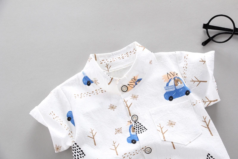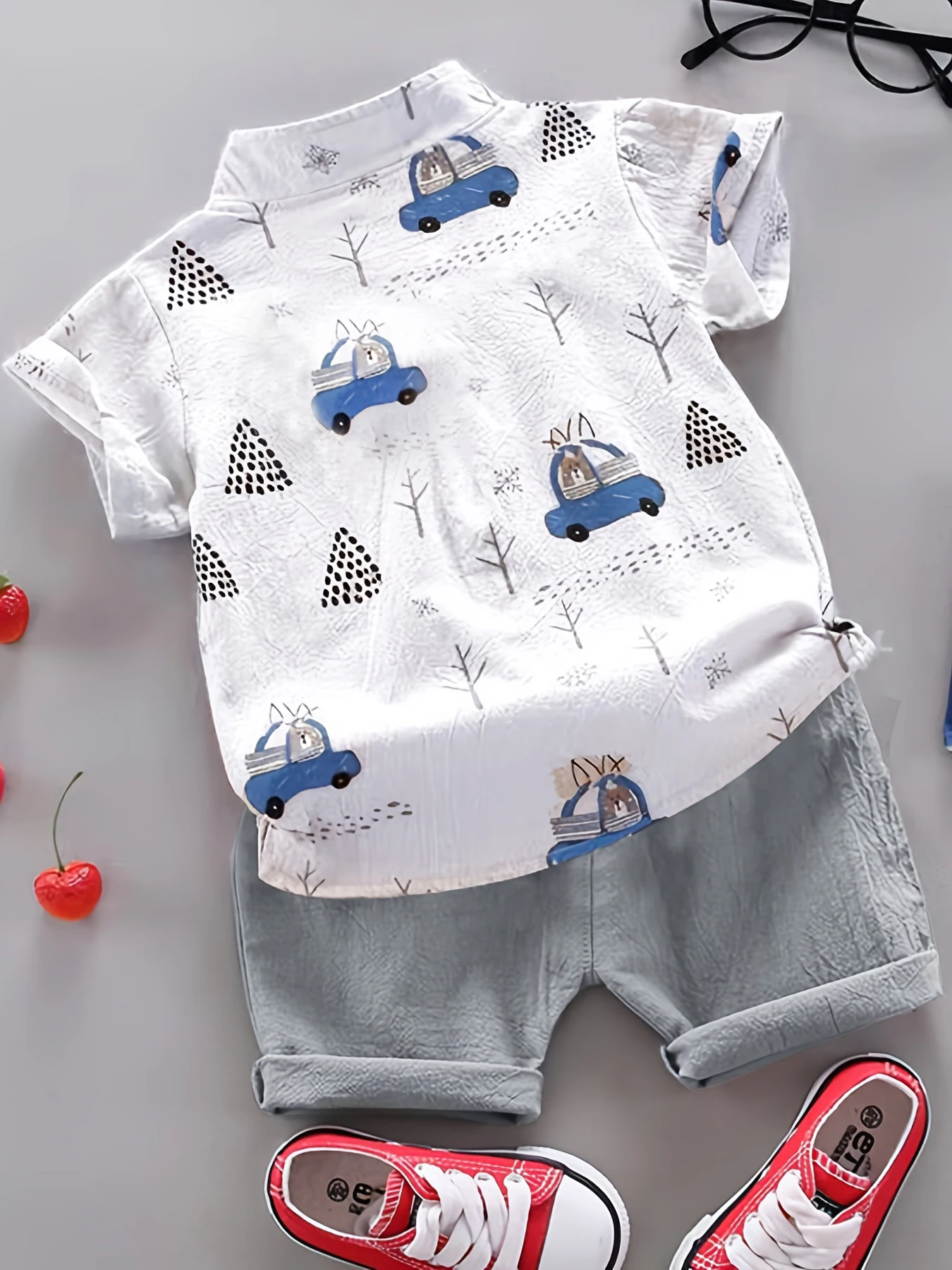 2PCS Infant and Toddler Summer Cartoon Teddy Bear Car Print Shirt Short Sleeved Shorts Set