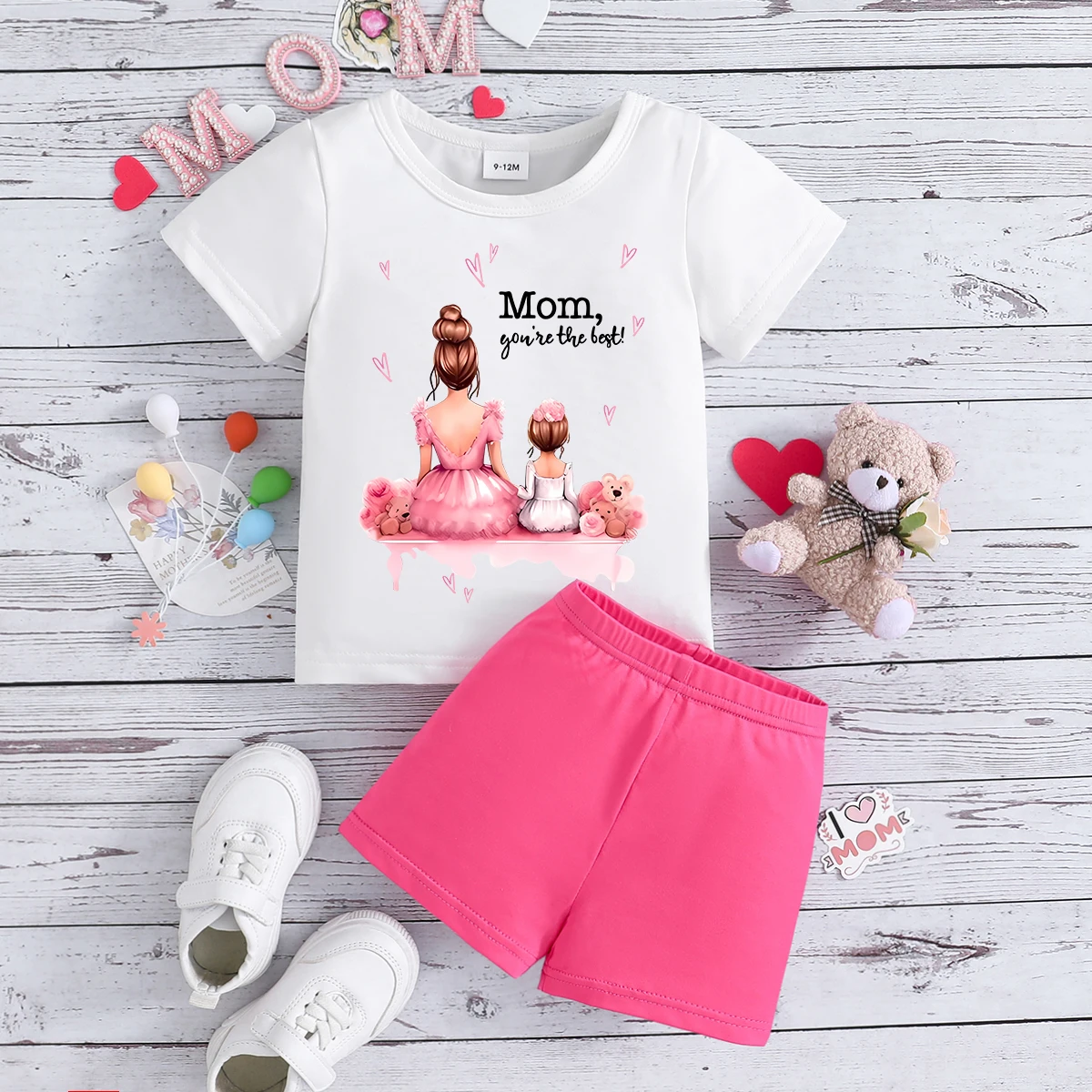 2PCS Summer Set Cute Letter Parent-child Flower Top Short Sleeve T-Shirt Casual Shorts Girls Mother’s Day Babies Children