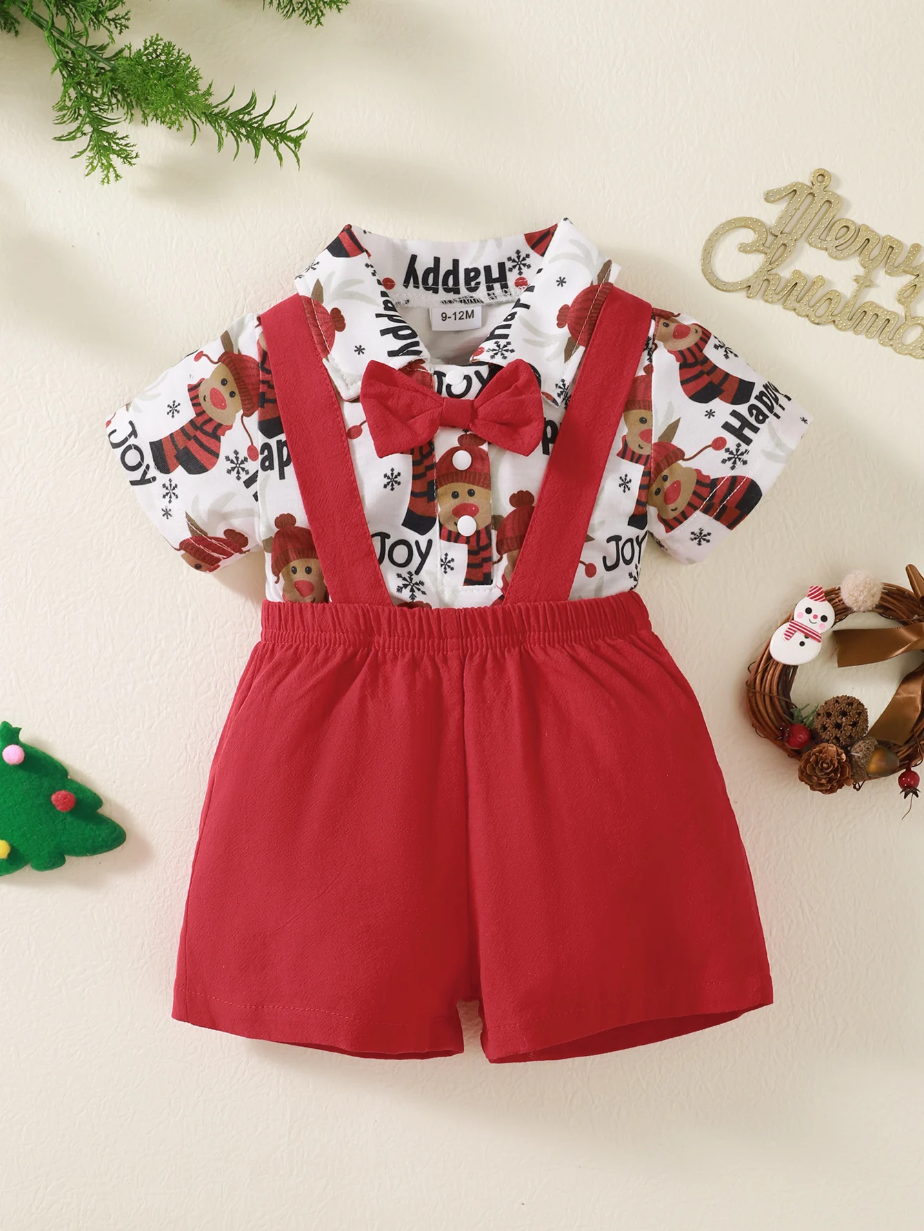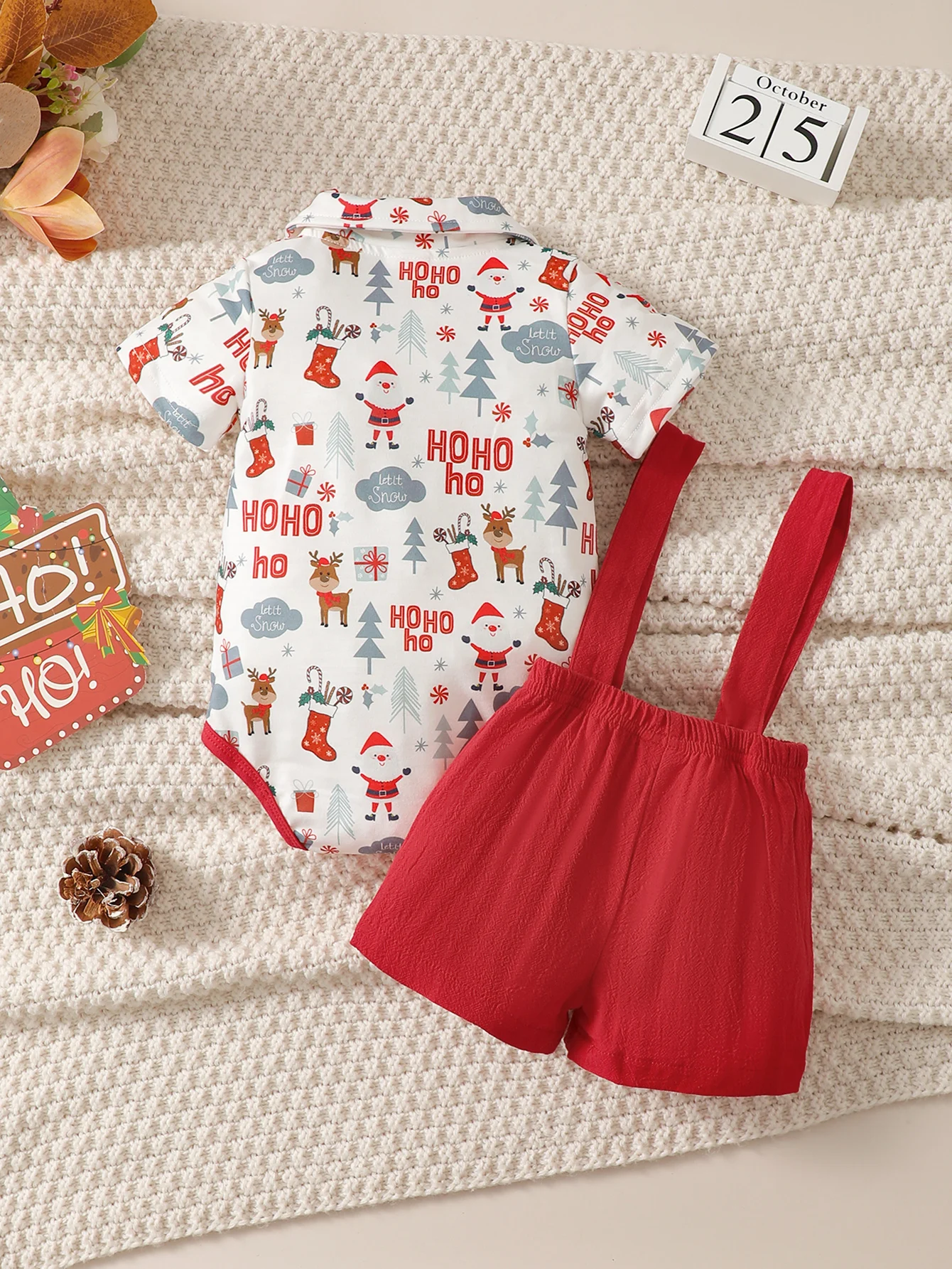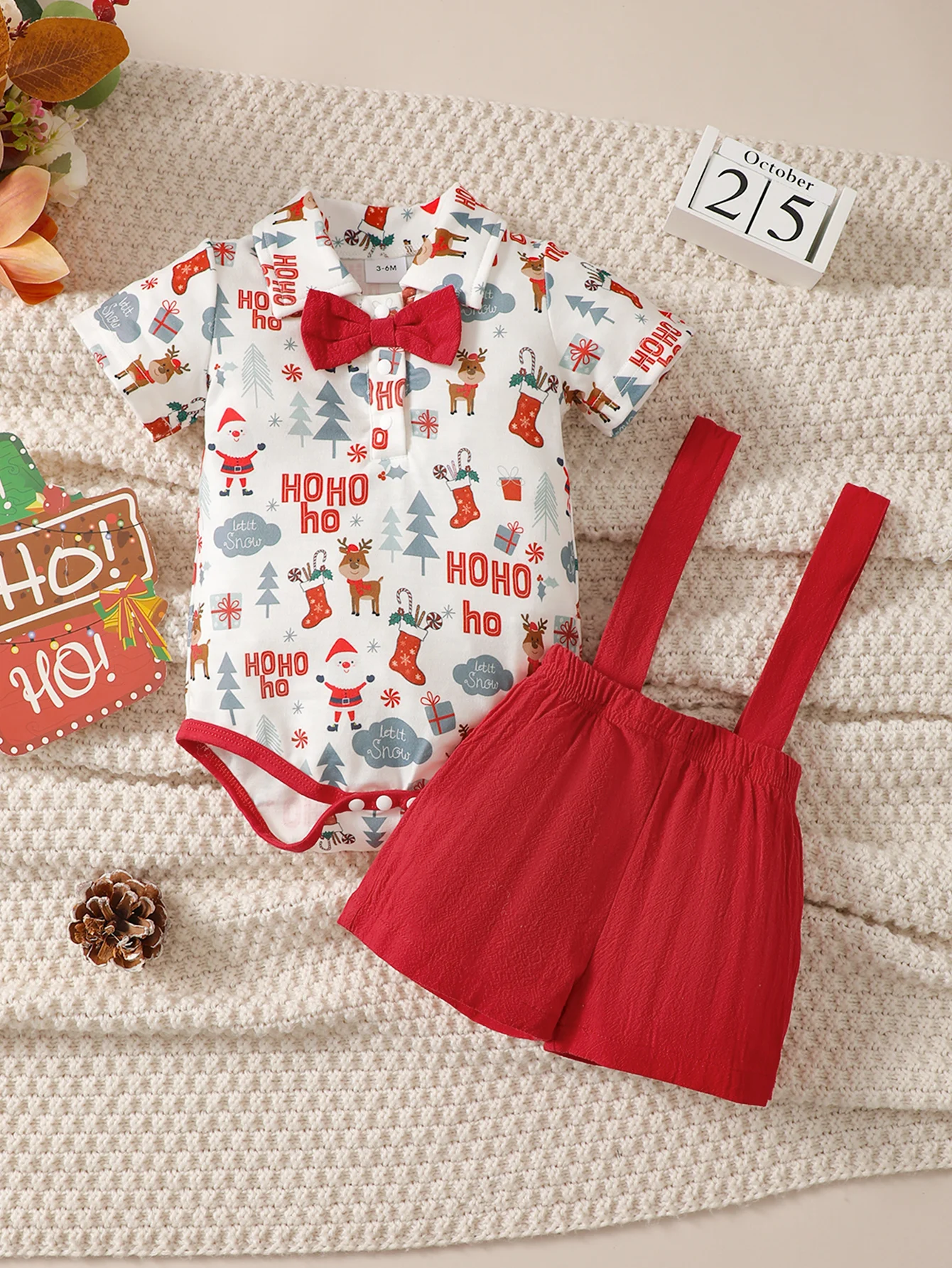 2pcsChildren’s clothing Santa Claus Printed Short sleeved Bodysuit+Suspender Pants 0-12 Months Male baby Christmas Gentleman Set