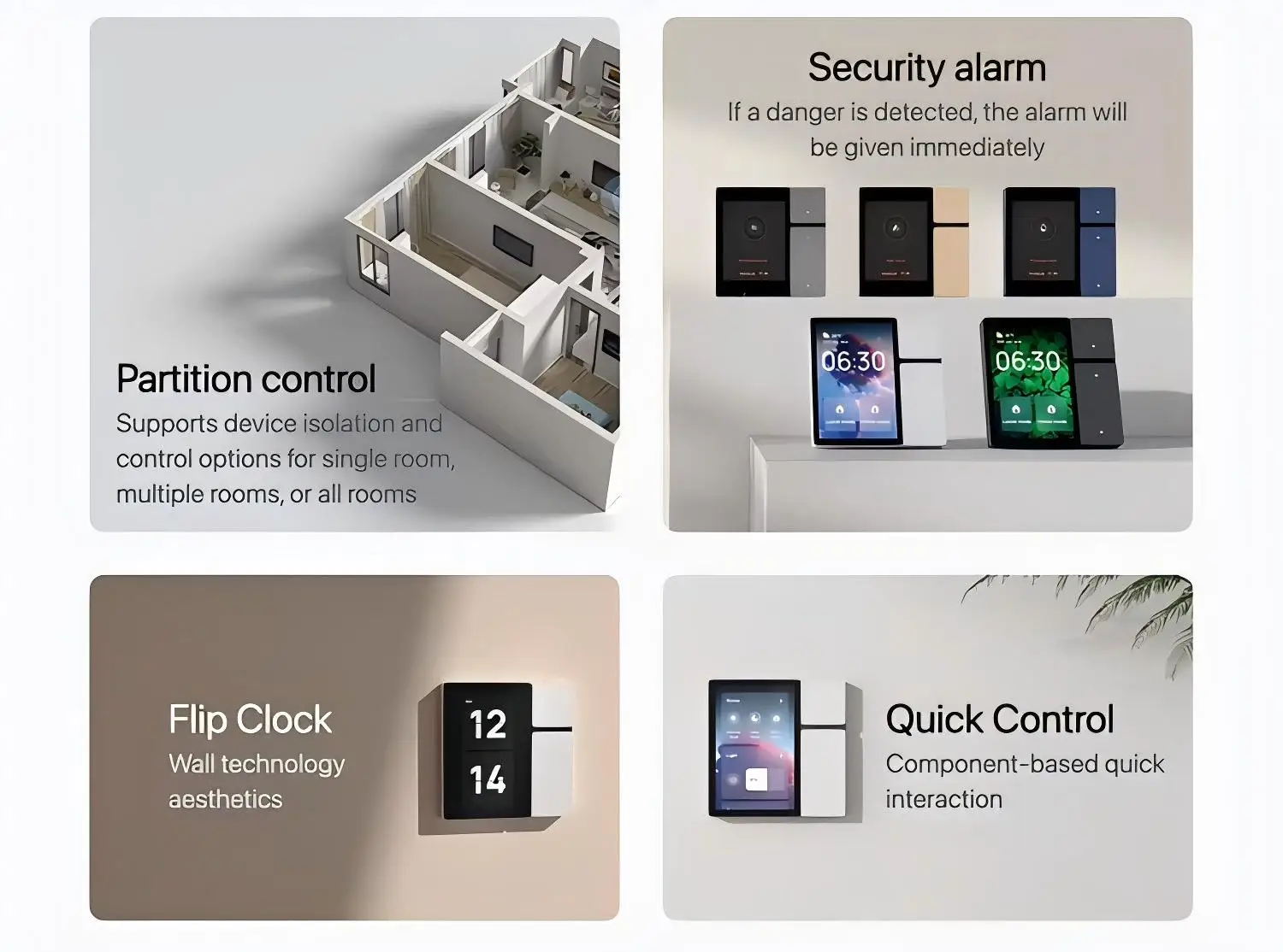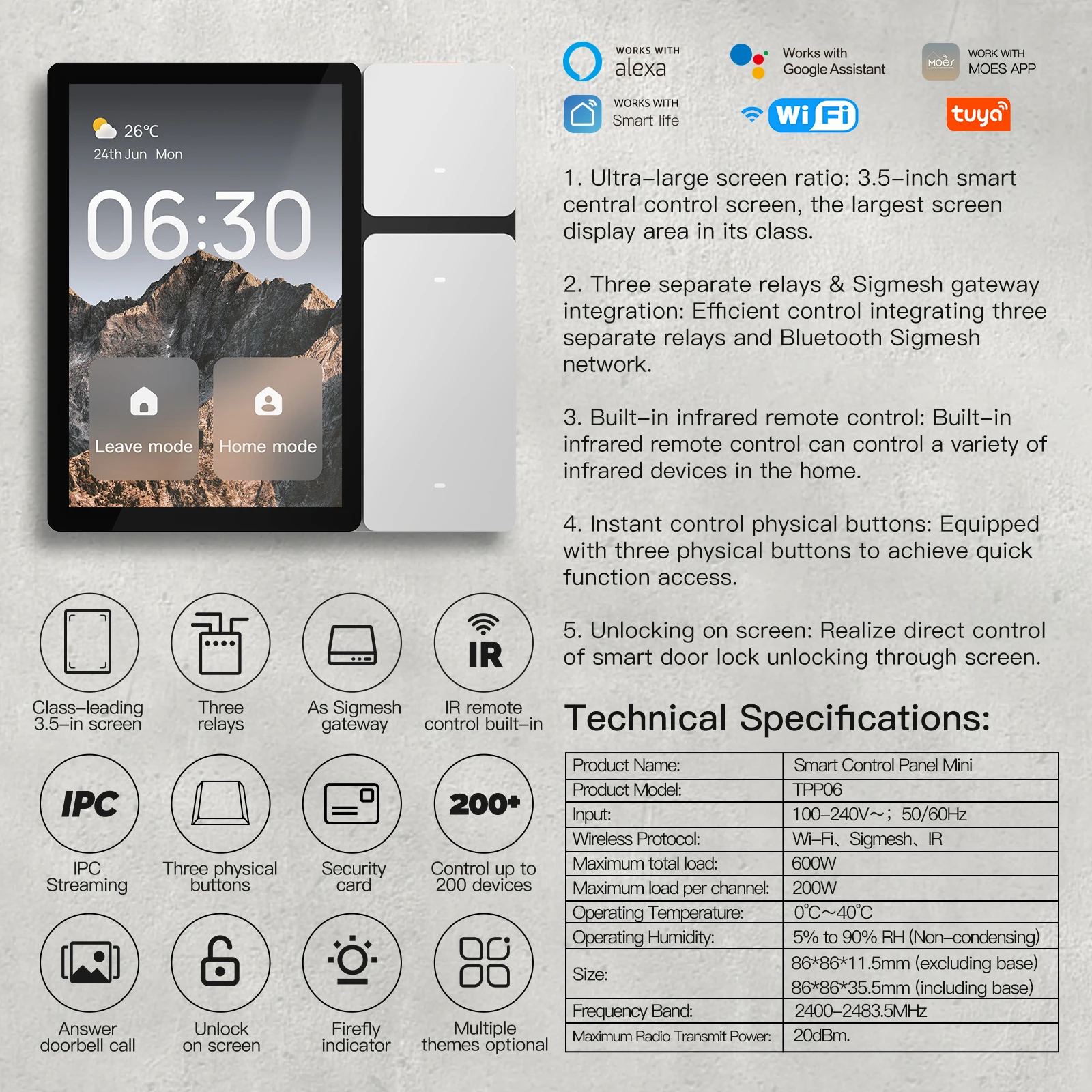 TPP06 is a multifunctional interactive device that intergrates smart sub-devices controlling & built-in 3-gang switches & one-key scenes control & IR remote controllers 4 in 1.