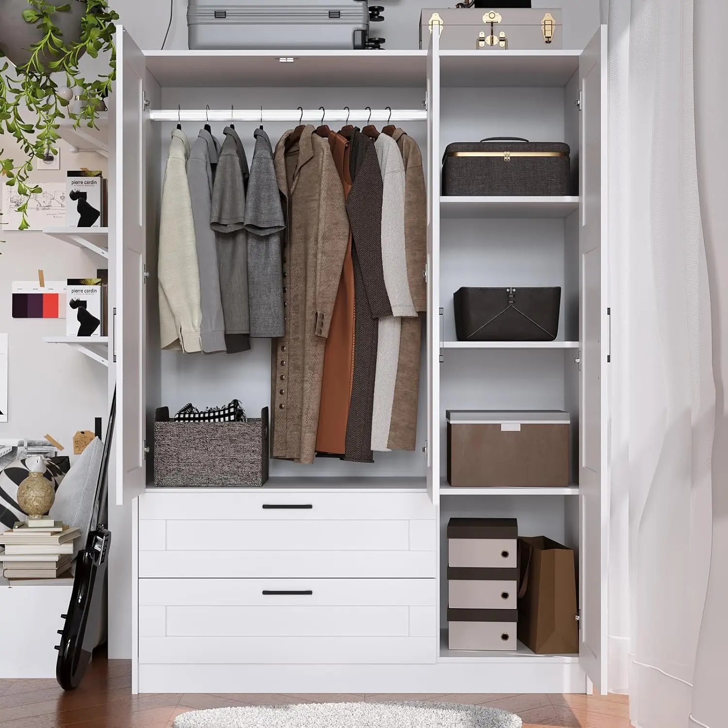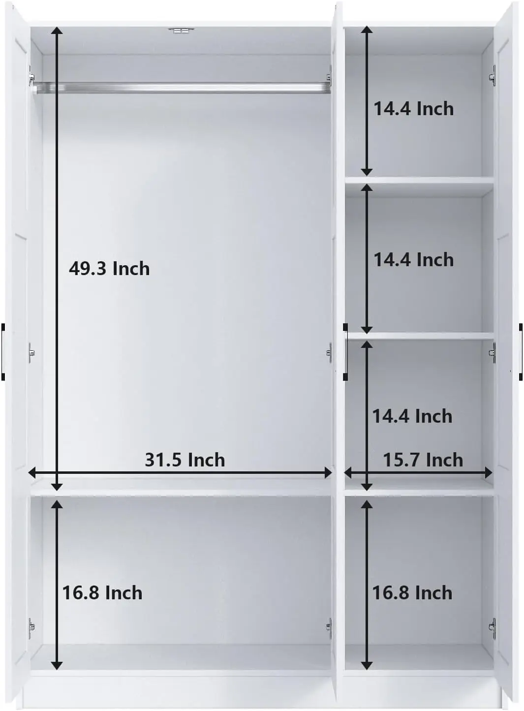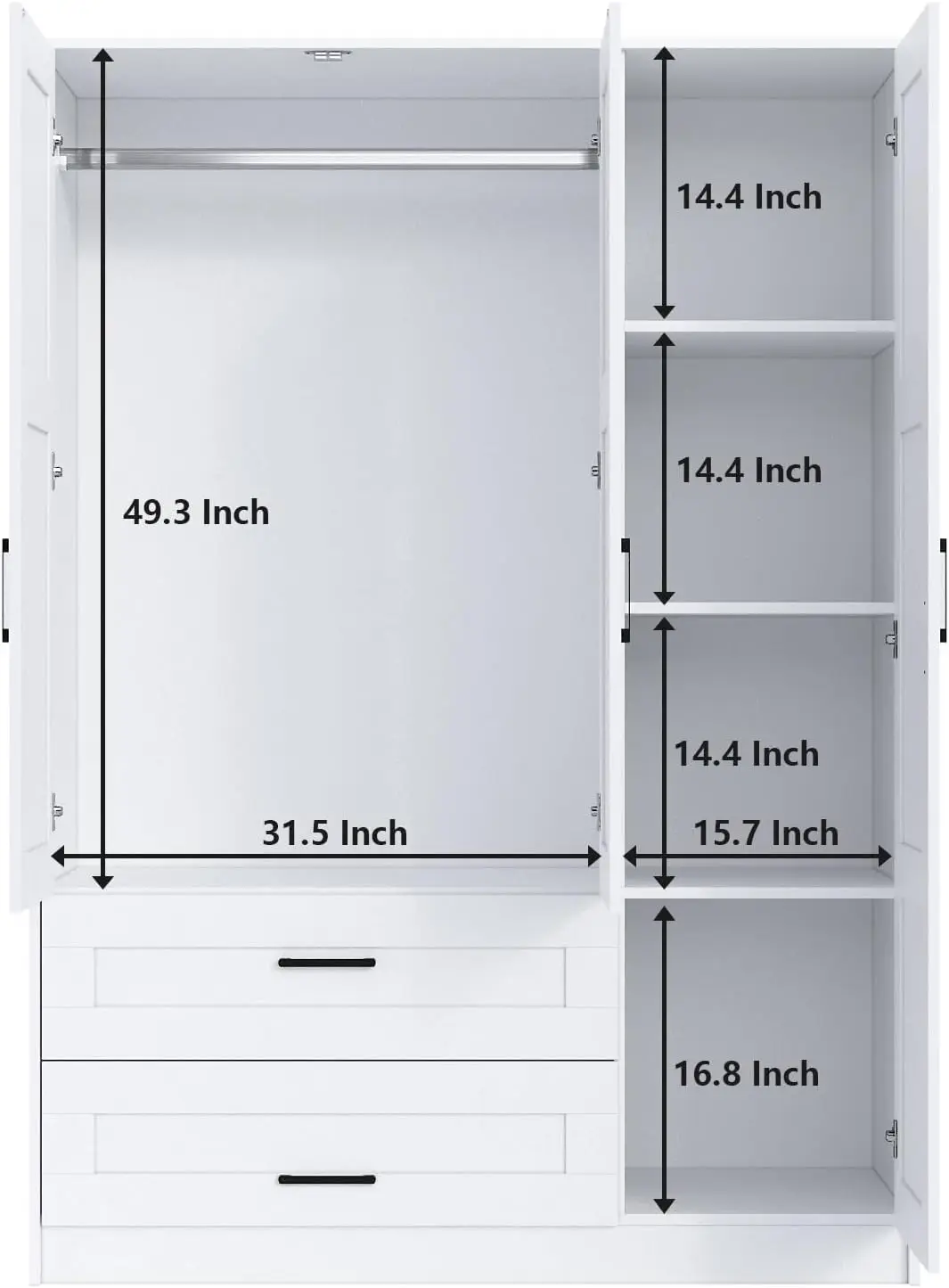 - â–¶ Sufficient storage space: the wardrobe has a clothes hanging area and a layered partition area, and the wardrobe hanging area has a clothing hanging height of 44.29 inches, which can effectively prevent clothes wrinkling. The layered partition area of the wardrobe can store a variety of different clothes, bedding or sheets and covers according to the size of the partition space, which greatly improves the use of space.