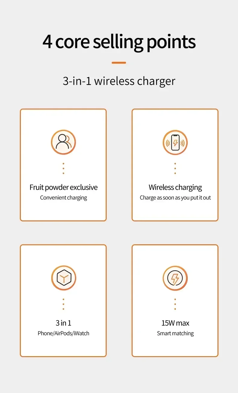Quick Charge 3 Modes Simultaneously Charge: You can use this vikefon wireless charger to charge your Apple devices. We have made a breakthrough in the use of upgraded coils, which can increase the power conversion rate by 35 %. The 3 modes of wireless charging station are phone 15W, AirPods 5W and iWatch5W. A vikefon integrated wireless charger can replace 3-4 charging devices, which is economical and beautiful.
