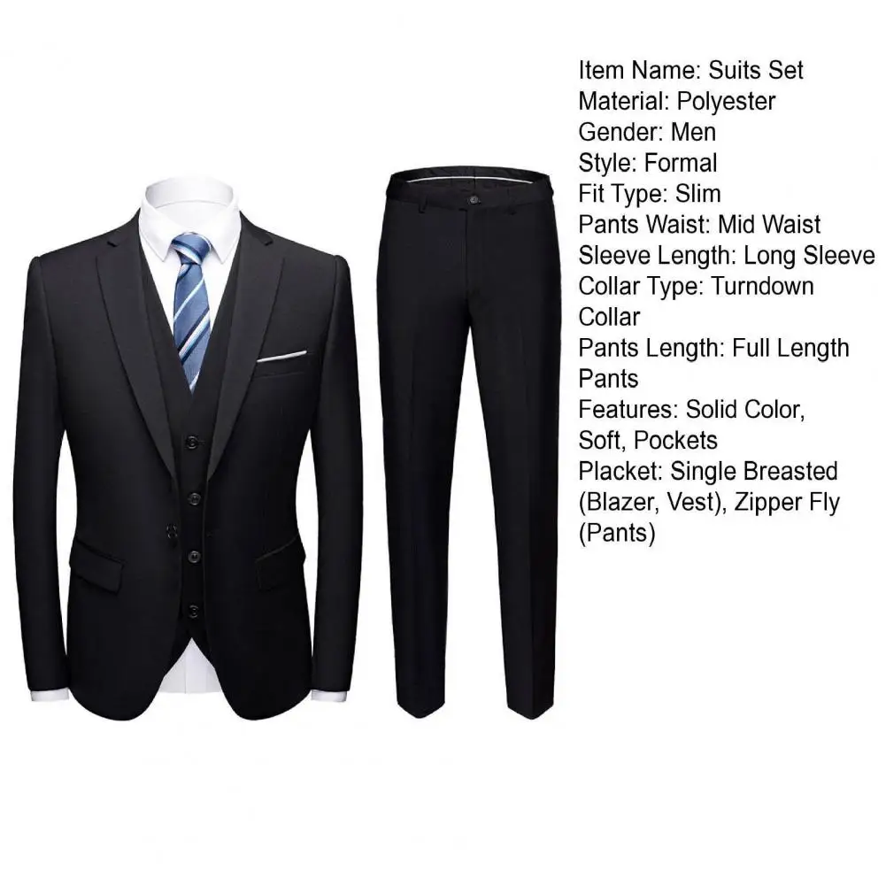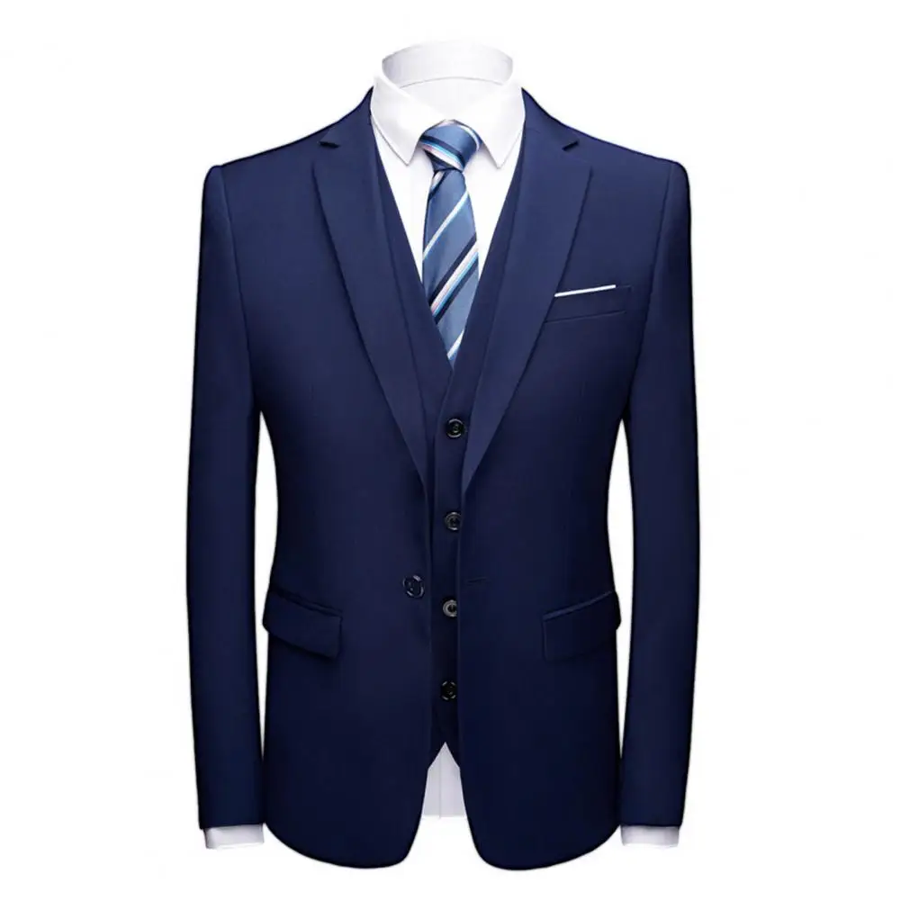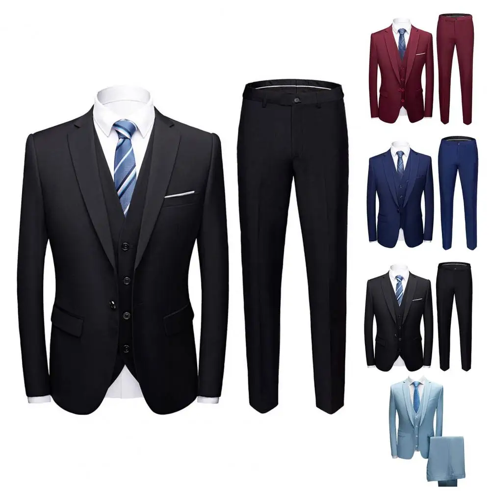 1 Set Blazer Vest Pants Set Solid Color Turndown Collar Single Breasted Slim Fit Formal Suit for Wedding Banquet Prom