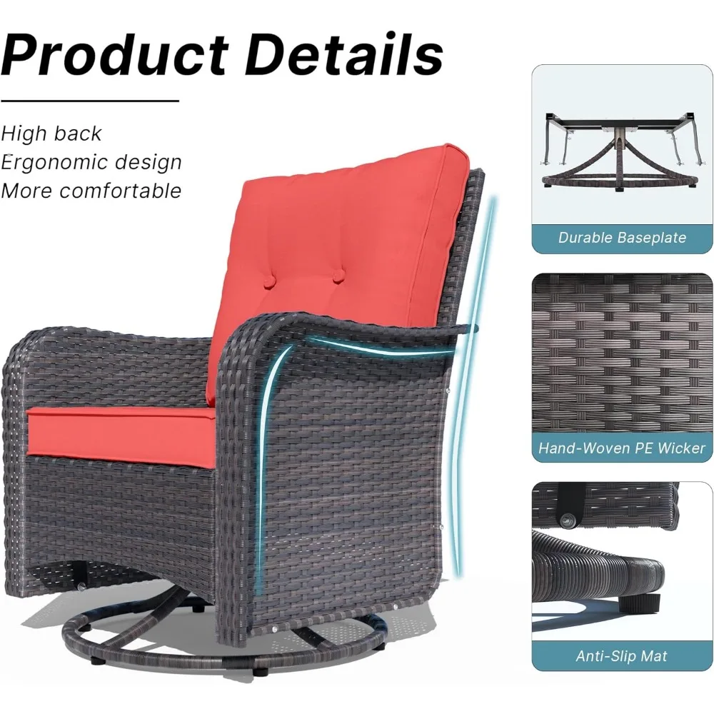 - ✨【Swivel & Rocking Glider Chairs】 The base of the swivel rocker chair is a dual-function base that can swivel 360 degrees and also glide back and forth smoothly. Full-rotation patio chairs allow you to face or leave the sun easily. The unique design of swinging back and forth allows you to enjoy ultimate relaxation. Equipped with several non-slip pads in the bottom, the patio swivel glider chair can stand stable and will not wobble