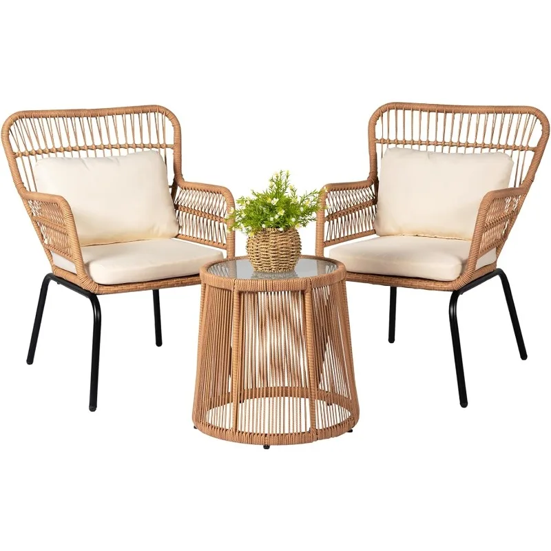 ELEGANT SIDE TABLE: This patio bistro set includes a line woven side table. The top of the coffee table is a round tempered glass that can hold small decorations, snacks, or drinks.