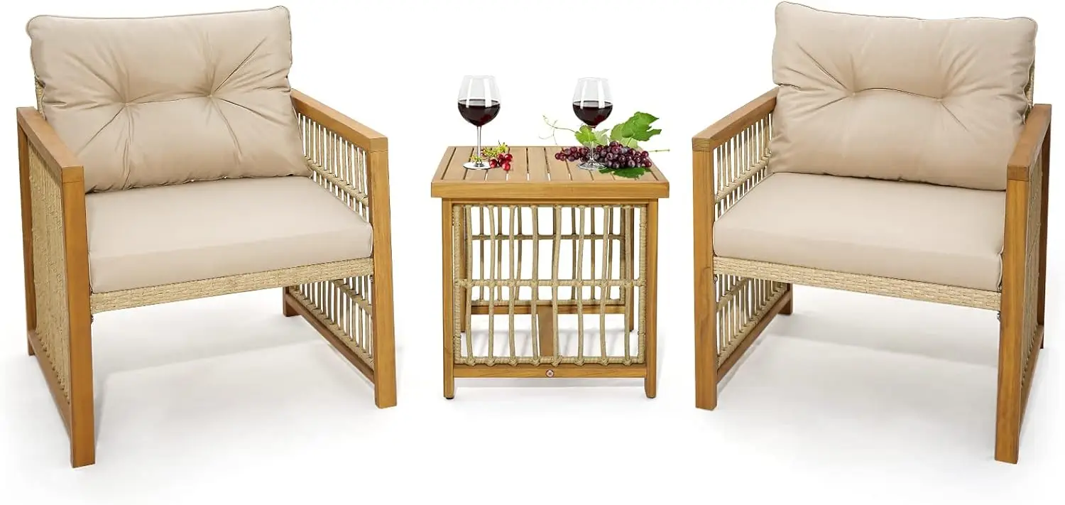 3 Pieces Acacia Wood Patio Furniture Set, PE Wicker Bistro Set with Cushioned Chairs and Coffee Table
