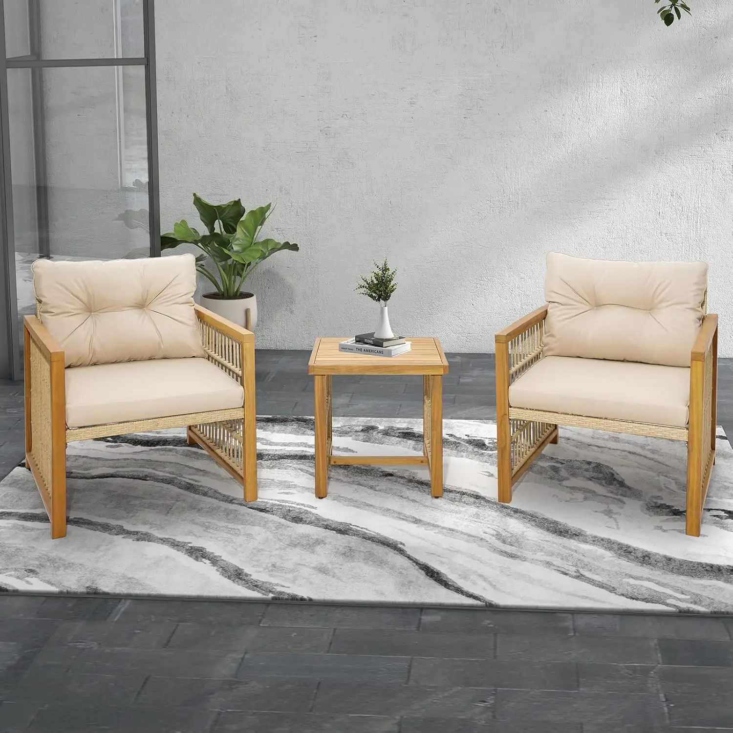 - Juego de patio de 3 piezas: incluye 2 sillones (28 pulgadas de largo x 26 pulgadas de ancho x 31 pulgadas de alto) y 1 mesa auxiliar cuadrada (19 pulgadas de largo x 19 pulgadas de ancho x 19 pulgadas de alto), este juego de muebles de exterior de 3 piezas convierte tu porche, patio, balcón y jardÃn en un espacio de ocio para charlar y beber, haciendo que tu vida al aire libre esté llena de felicidad.