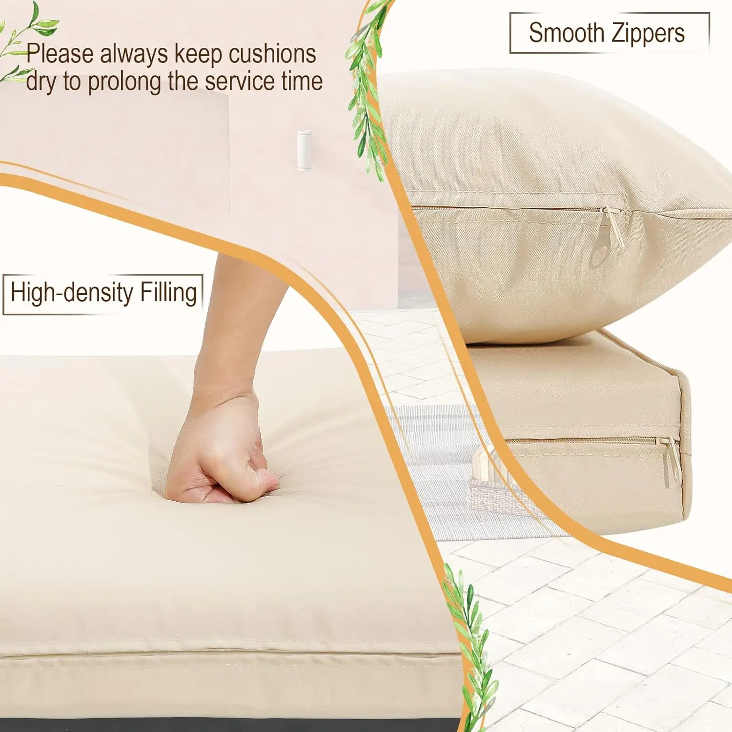 - Cojines con cremallera: Todos los cojines cuentan con cremalleras suaves, que le permiten quitar las fundas de cojÃn para una fácil limpieza. Nota: 1) Mantenga siempre los cojines secos para prolongar el tiempo de servicio. 2) Por favor, no aprietes todos los tornillos hasta que todos los agujeros estén alineados.