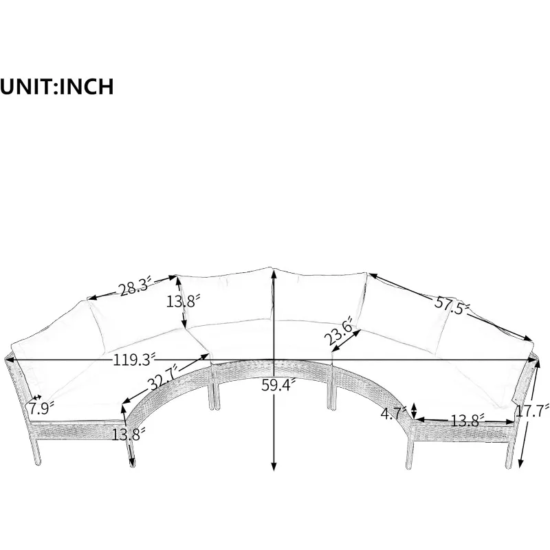 Weight & Dimensions: Overall Product Dimension: 119.3”L x 59.4”W x 17.7”H Single Sofa: 57.5”L x 23.6”W x 17.7”H Seat Height: 13.8” Seat Depth: 23.6” Detail Product Dimension: Please refer to the Size image Number of Package: 4 Package Dimension and Weight: Please refer to the Specification Overall Product Weight: 125.4 lbs Package Weight: 141.54 lbs Weight Capacity: 220 lbs/ seat Seating Capacity: 3- 6Specifications: Product Name: Half Moon Curved Outdoor Suit Combination Patio Furniture Sectional Sofa Conversation Set Function: Modular Design, Half Moon Design, Curved Design Material: Rattan + Steel Frame + Polyester Fabric + Foam Pieces Included: 3 * Single Curved Sofa, Cushion, Pillow Color: Beige/ Gray Frame Durability: Weather Resistant, Waterproof and UV Removable Cushion: Yes With Zipper: Yes Assembly Required: Yes Level of Assembly: Full Assembly Needed Additional Tools Required: All Tools Included