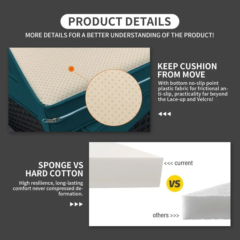 • Comfortable and Non-slip: seat cushions(4 inches) with high resilience sponge and bottom anti-slip dotted plastic fabric; anti-slip and practicality are wholly better than lacing, velcro or hook, match up plump back cushions with water-resistant, color retention fabric covers for lasting appeal with outdoor patio furniture