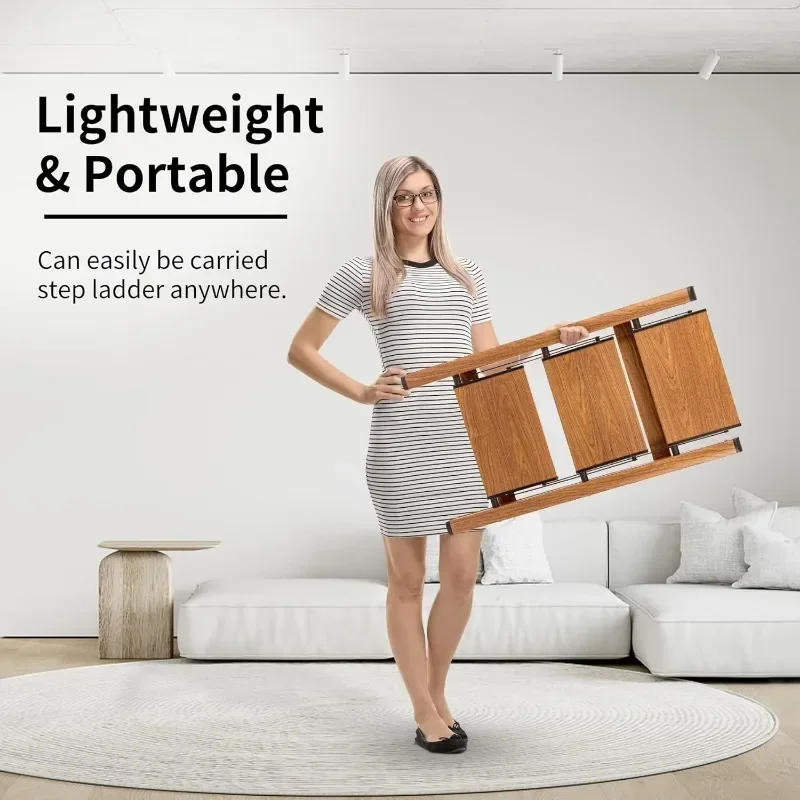 - Woodgrain Color – With the stylish design, the ladder would fit in the house like a furniture. It can also be used as a ladder shelf to place things on the pedal, like flowers, books, bags, etc.