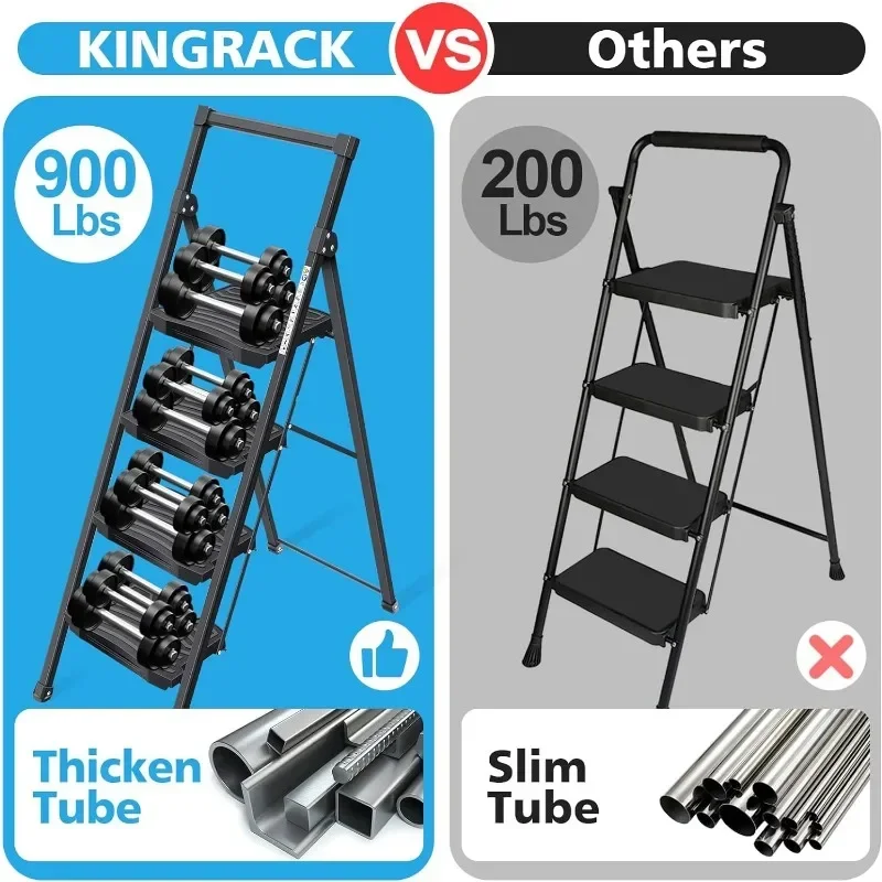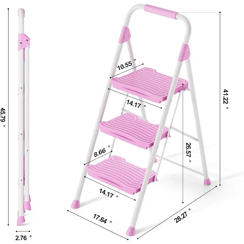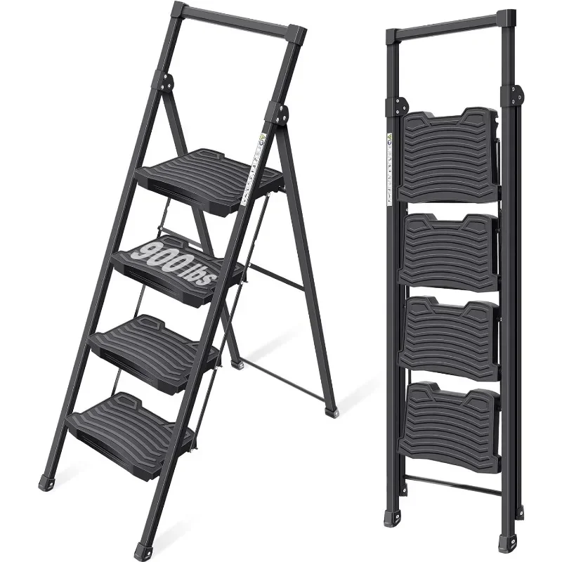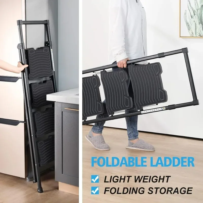 - Foldable Ladder: The size of this ladder meets the use demand of most families, easy to storage, and the size after folded is small, which can reduce storage space, open size:17.63*28.26*41.22 inch, folded size:17.63*45.78*2.75 inch, max capacity: 900lbs (violent testing, do not imitate)