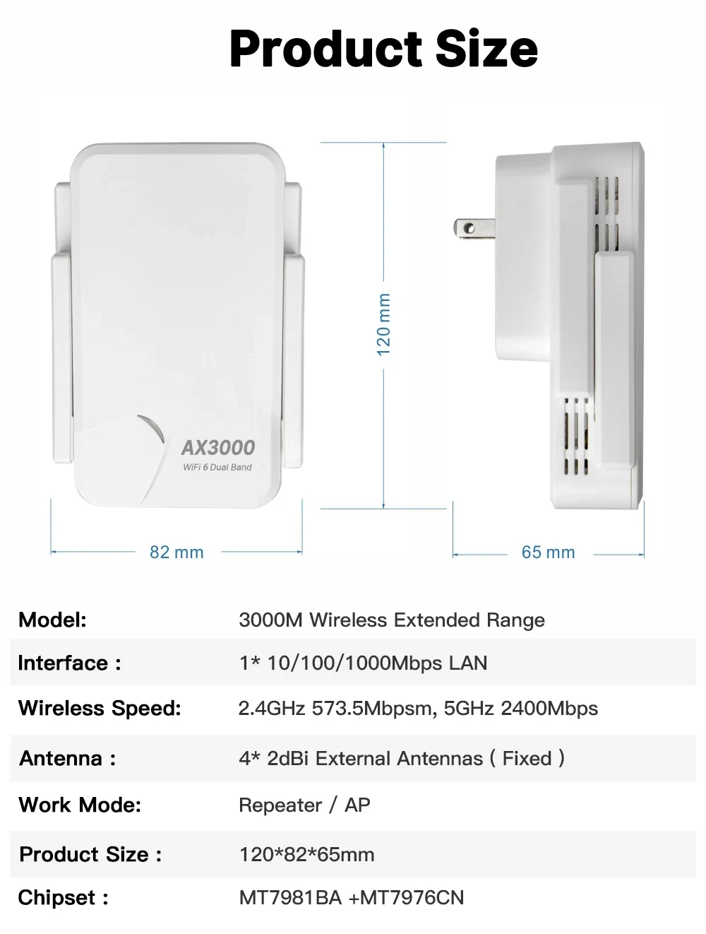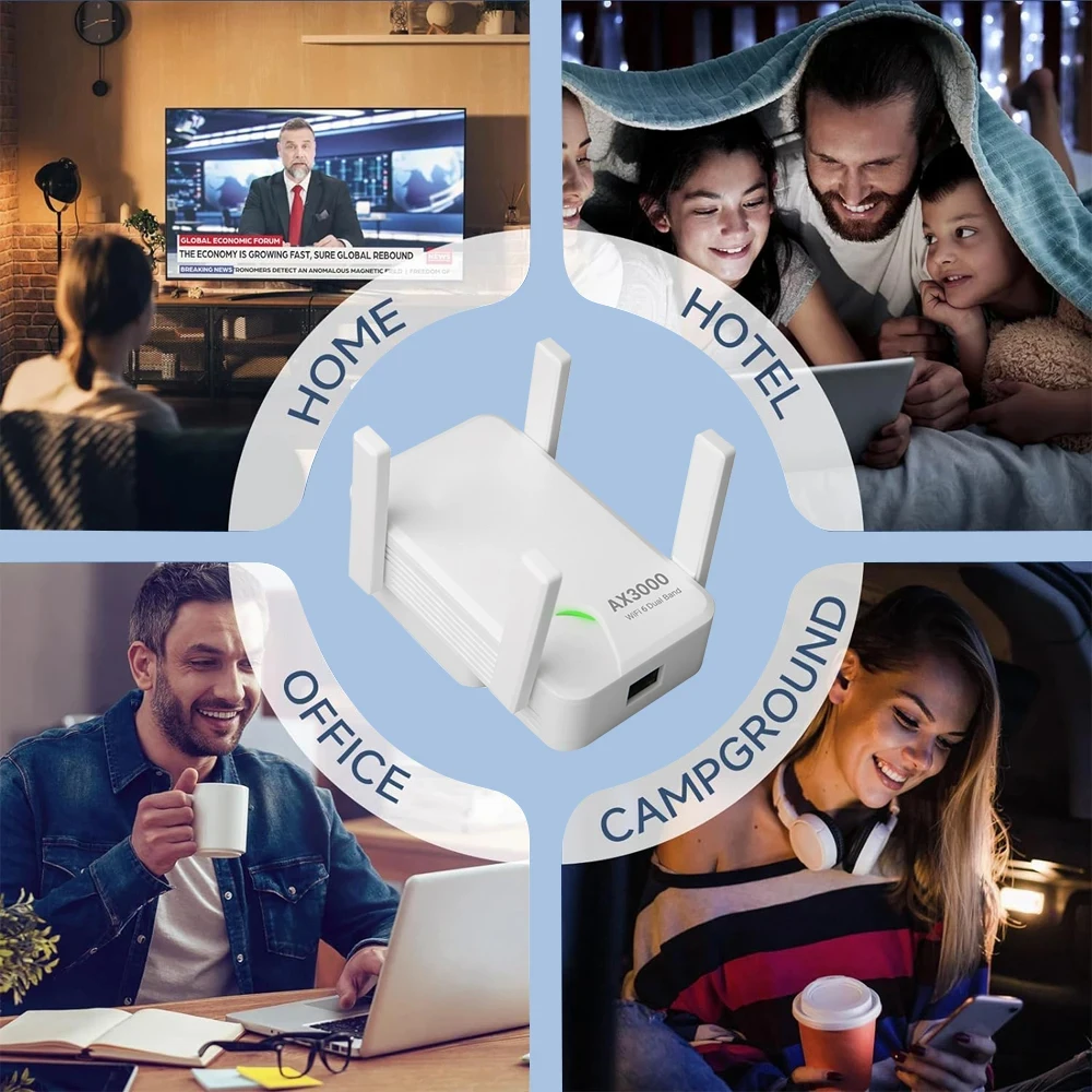 This WiFi 6 AX3000 repeater is a 3000Mbps high-power WiFi6 signal amplifier. It is equipped with 4 high-gain antennas for signal enhancement. It can be used with WiFi6 routers to eliminate dead spots of WiFi signals in the home, and solve problems such as large multi-bedroom range and incomplete routing coverage of large houses. It is effective Expand WiFi coverage to achieve real whole-house WiFi coverage.