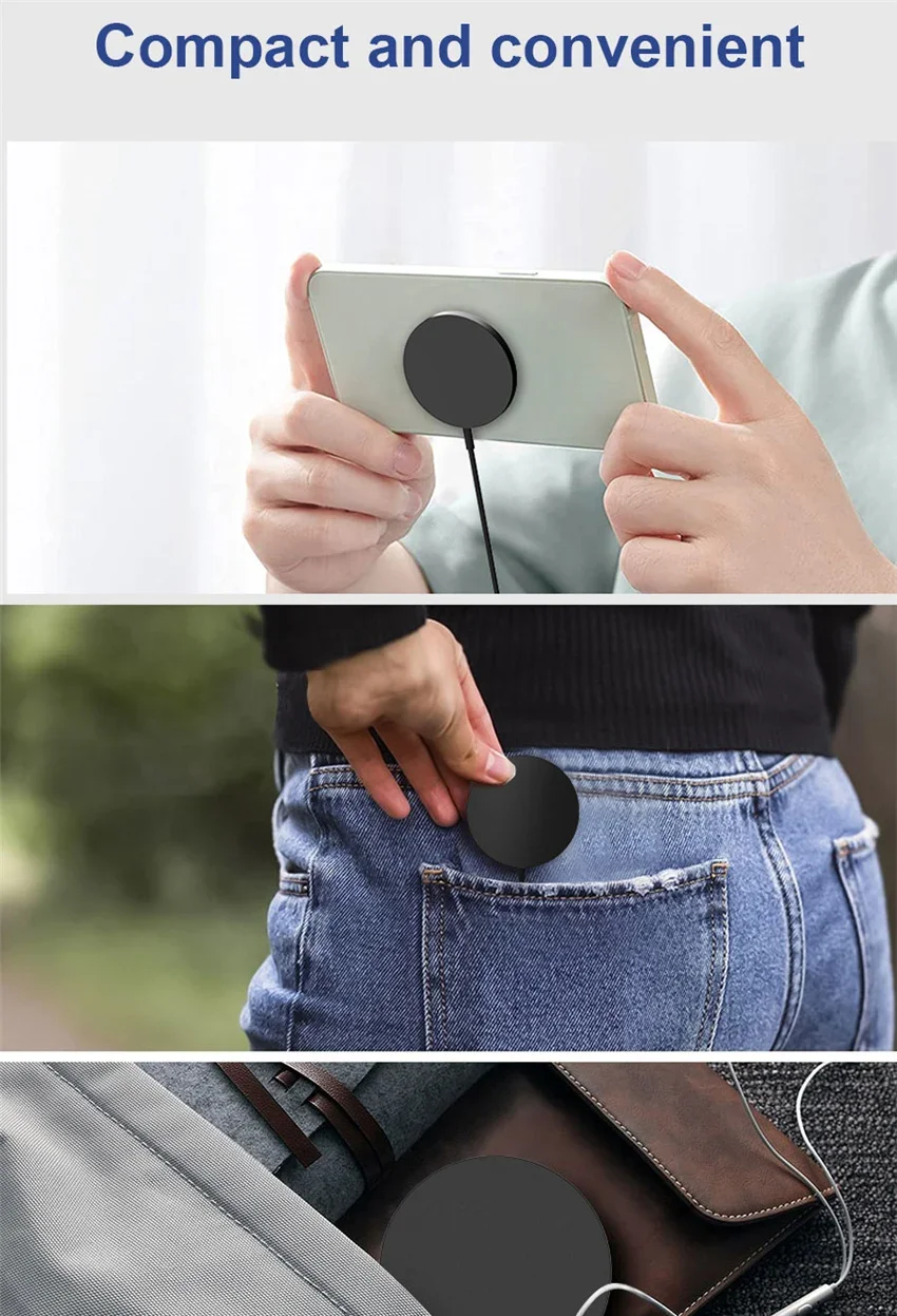 【Metal & Portable Design】The high-quality metal material exhibits a unique luster, avoids scratches or fingerprints, not only keep perfect appearance, but also more durable. Only 0.23 inch thin, just like the smallest & lightest wireless charger with the 1m long cable. Free up more space, it can be put into backpacks, pockets or bags.