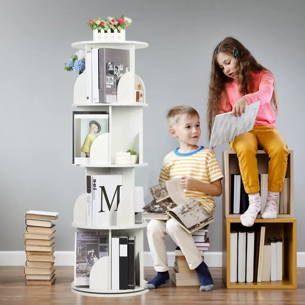 Spinning Bookshelf, 360 Rotation Display 4 Tier Floor Standing Bookcase, Small Corner Bookcase for Small Space, Kids Room Book Storage Organizer, Wood Narrow Book Shelf