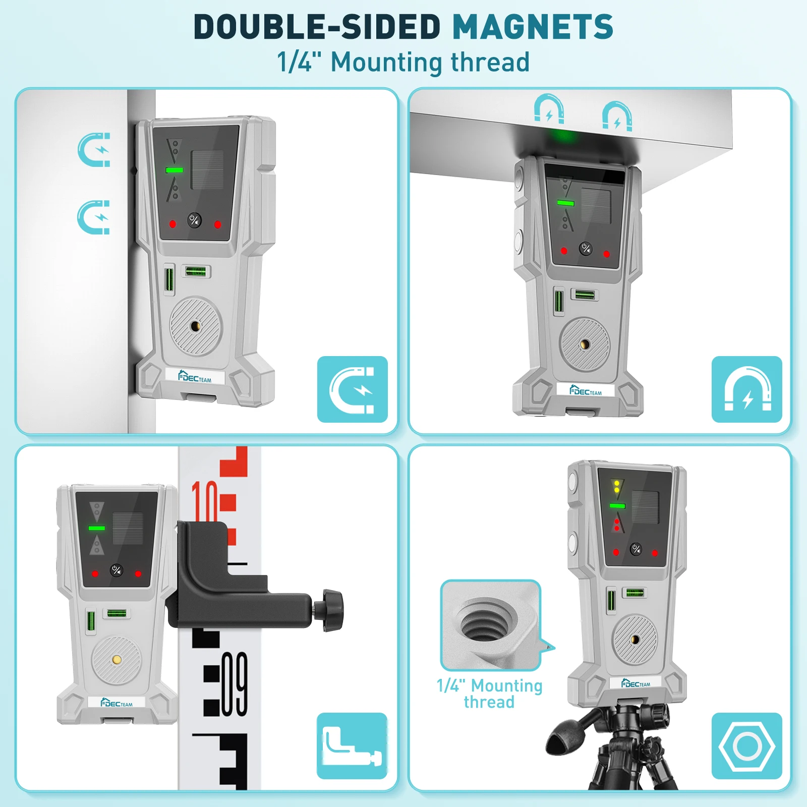 Easy Mounting: The 1/4"-20 female thread on the laser level allows for effortless mounting to tripods or laser mounting poles, providing you with sturdy support while you work.