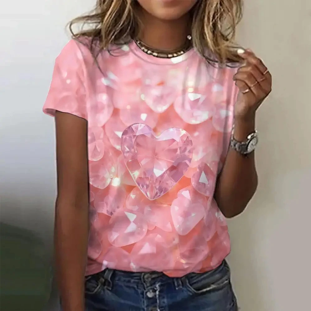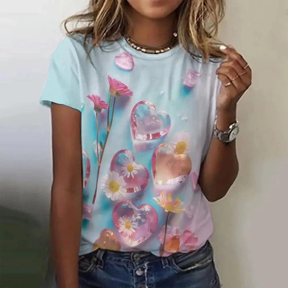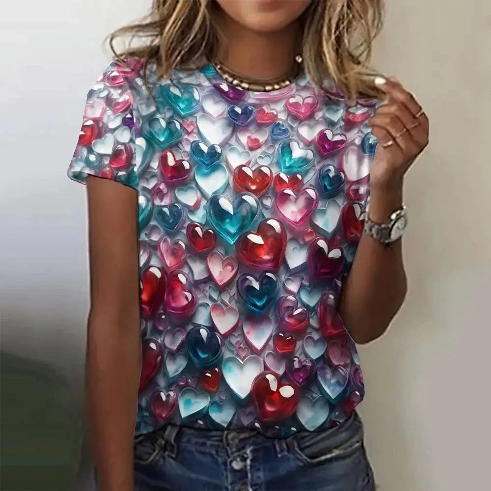 3D Love Print Women’s Short Sleeve T-shirt Summer Round Neck Fashion T-shirt Loose Harajuku Street Plus Size Shirt Top Clothing