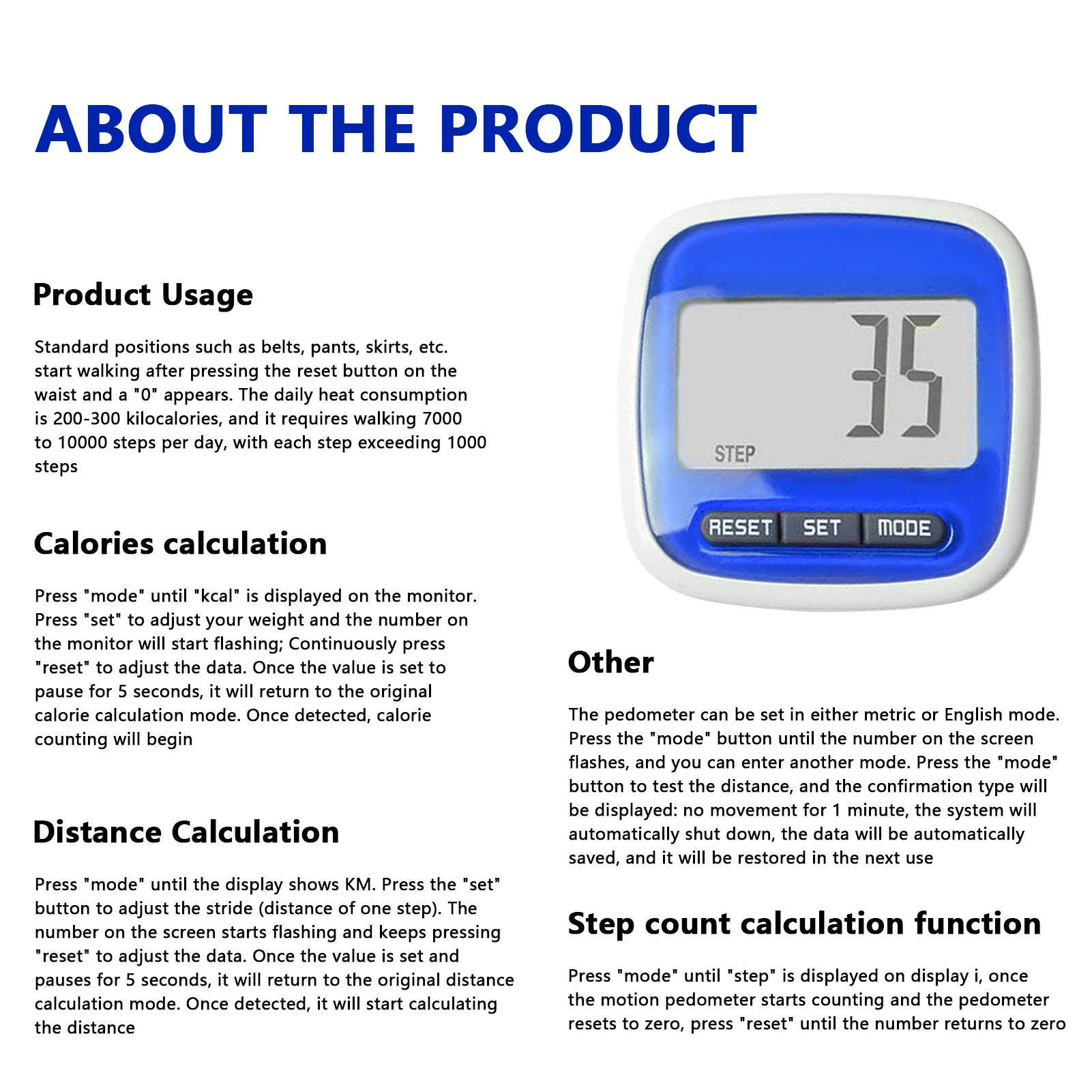 1、Simple to Use: The simple design makes it easy to use by men, women, children, and seniors who want to count steps and stay motivated to achieve their fitness goals. It is the easiest pedometer if you don’t want complicated settings.
