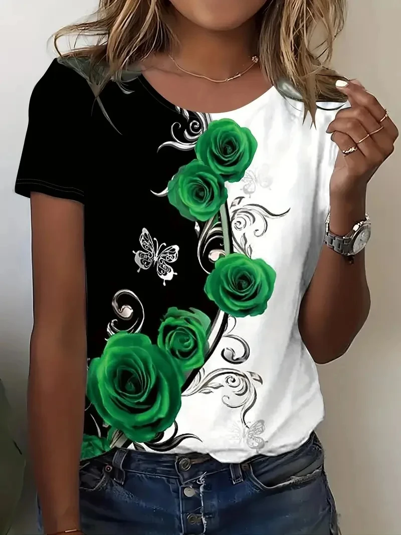 3D O-neck Summer Women’s T-shirt Plus Size Casual Rose Print Short Sleeve T-shirt Vintage Loose Women’s Top T-shirt Clothing