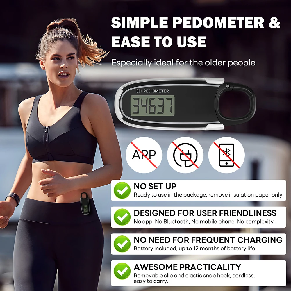 1. Accurate Step Counting: Utilizing advanced step counting technology, this 3D pedometer ensures precise tracking of your steps. Ideal for brisk walking and running, it accurately records up to 99,999 steps, making it perfect for daily fitness goals.