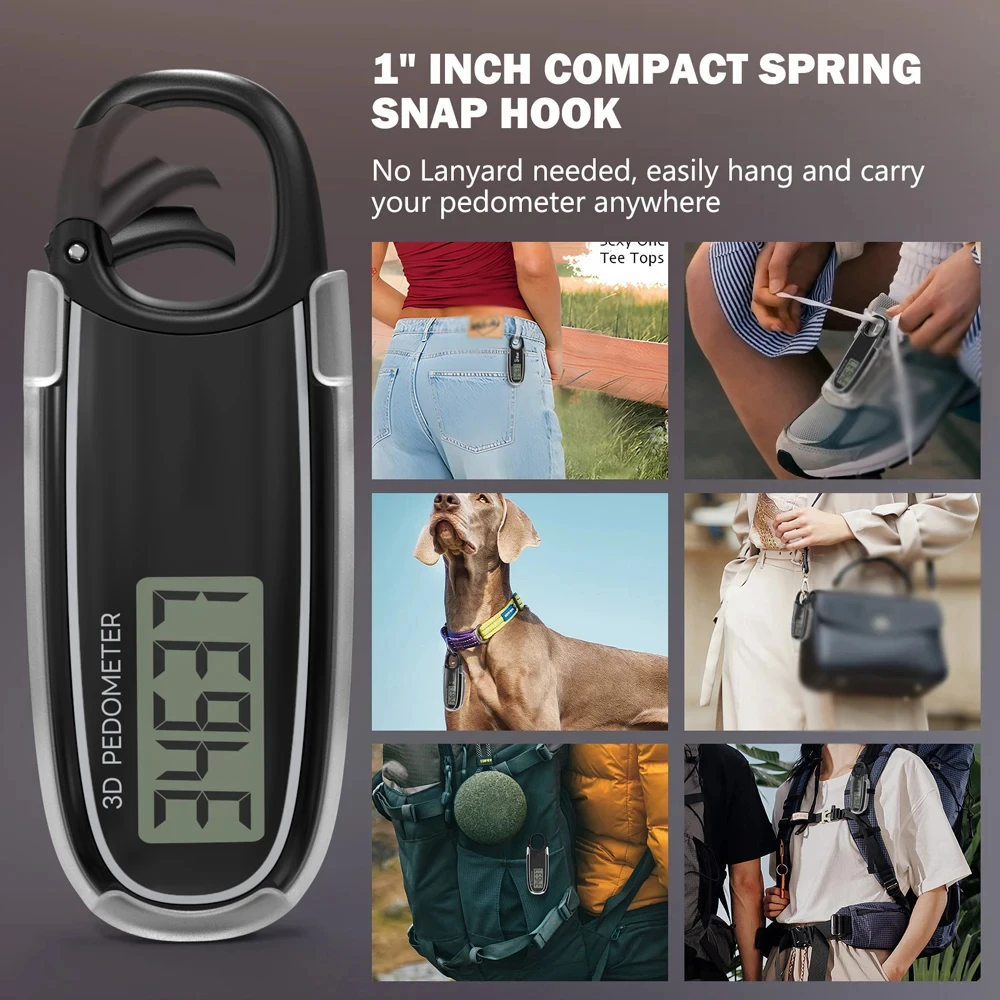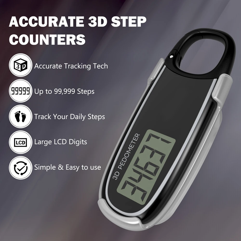 Features:Simple To Use: It incredibly easy to use and provides accurate step tracking. You can effortlessly attach it to your clothing or carry it in your pocket. With its intuitive design, the 3D pedometer effortlessly records your step.Accurate Counting: This step counter utilizes upgraded 3D tri-axis sensor technology that provides greater accuracy than most pedometers. The 3D sensors can read a step from any orientation, providing exceptional accuracy.10-Step Error Prevention: The 10-step error correction prevents irregular non-walking movements from being incorrectly counted as a step. After 10 consecutive step, the sensor will start or resume counting.Easy to Read: With a large LCD digits display, you can clearly and easily read the numbers a glance. This makes it the perfect fitness monitor everyone. Simple design makes it user-friendly men, women, , and seniors.Easy Carrying: With a removable clip and carabiner, the pedometer can securely fastened around your waist, slipped into a pocket, or effortlessly hung from a backpack, waist tab, dog collar, etc. leaving your hands free.Specifications:: PlasticColor: Black/WhiteBattery: Button Battery (included)Item Size: 80 * 32 * 18mm/3.15 * 1.26 * 0.71inItem Weight: 22.1g/0.78ozPackage Size: 96 * 88 * 18mm/3.78 * 3.46 * 0.71inPackage Weight: 34.43g/1.21ozPacking List:1*Pedometer